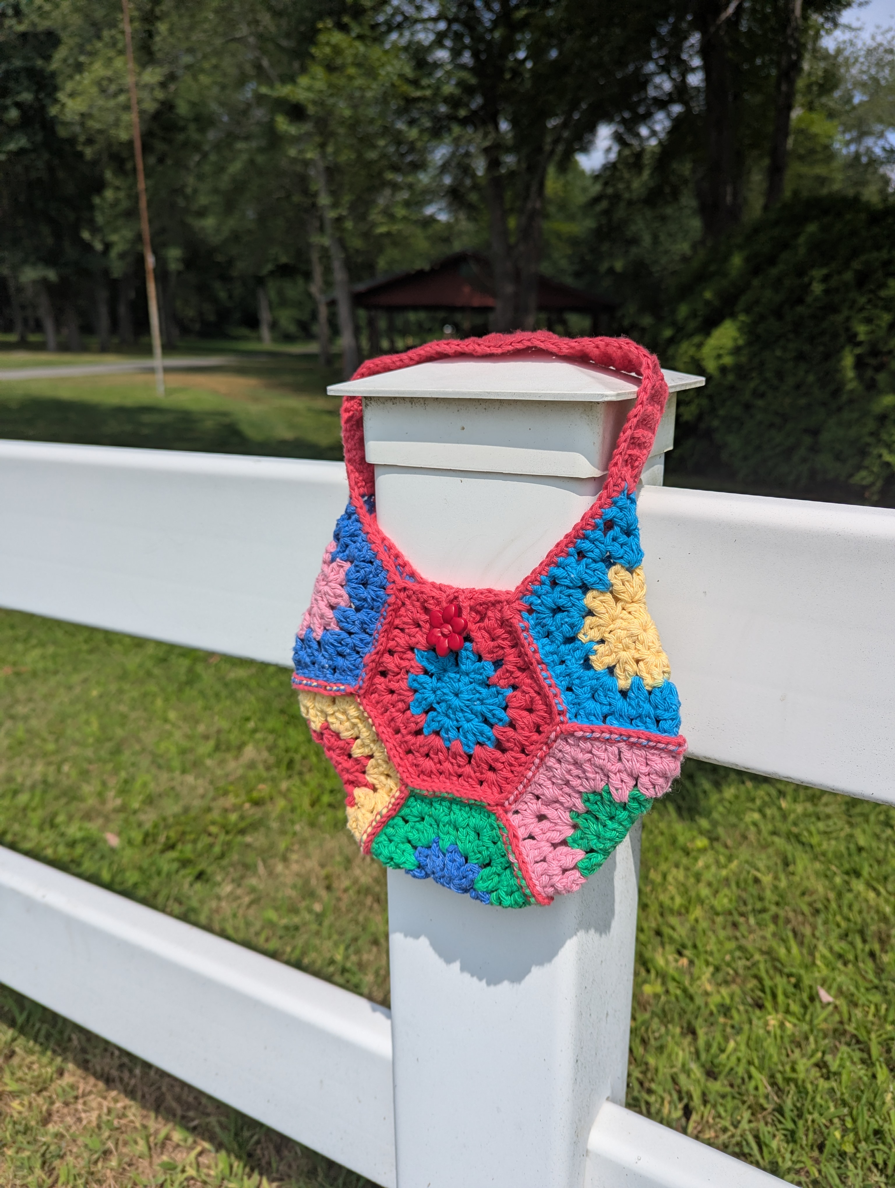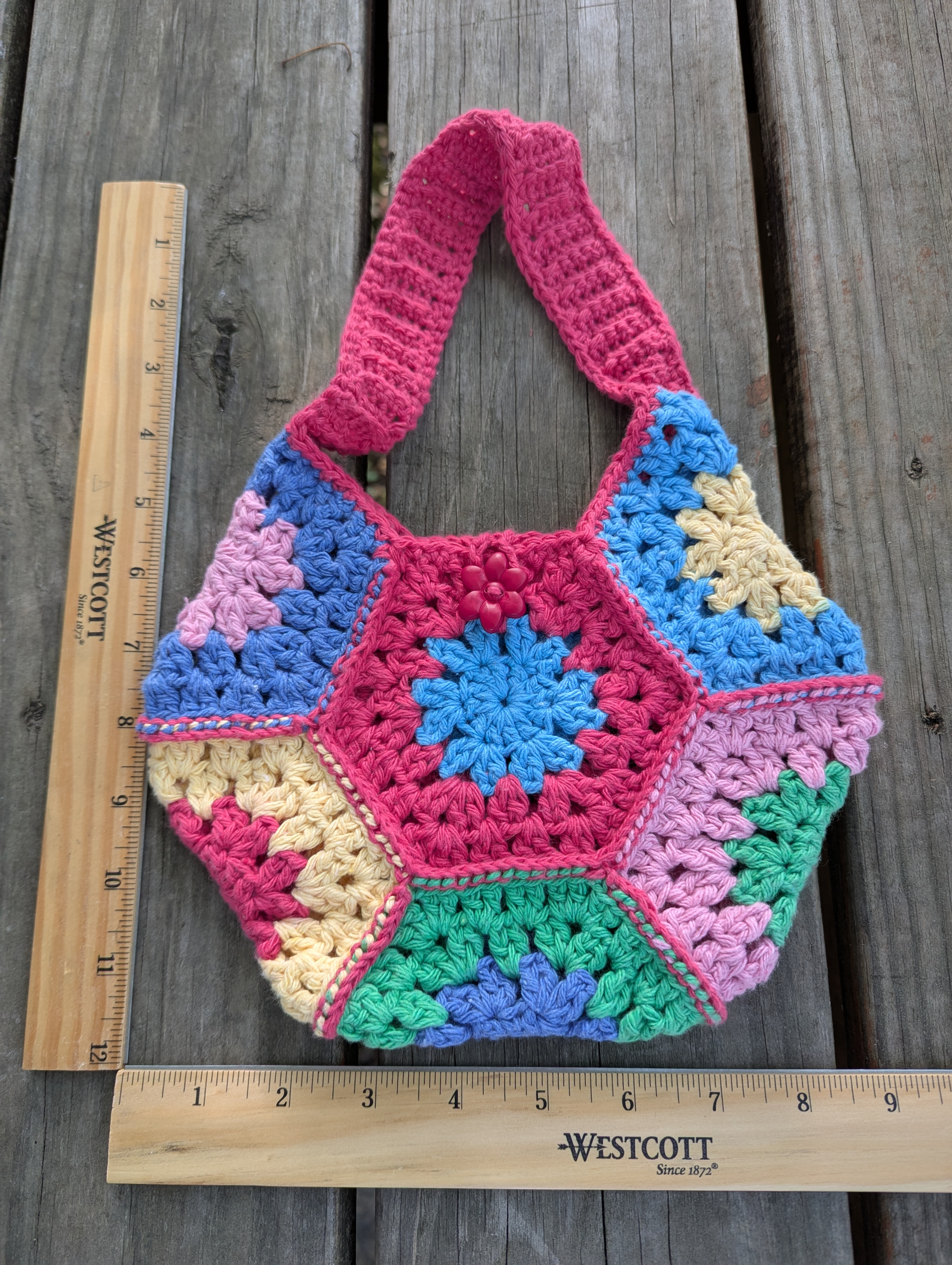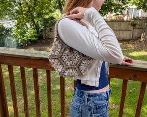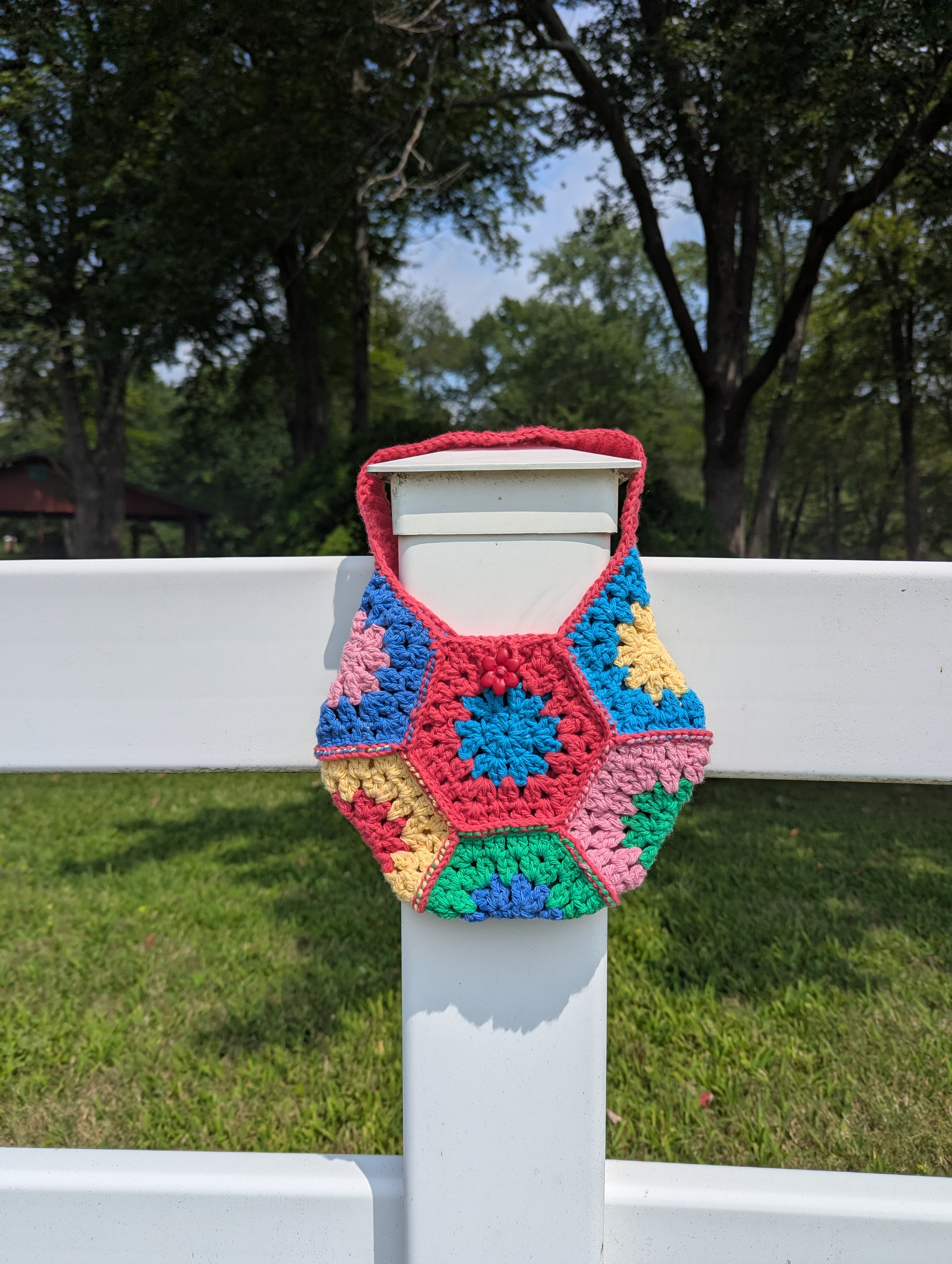 This crochet hexagon bag is small but mighty! Made with a blend of 85% cotton and 15% polyester yarn, it's both durable and has enough give to accommodate all of your must-haves when you're on the go. The handle is made using a special stitch, which allows it to stretch just enough to wear comfortably on your shoulder. The hexagon bag also includes a center button and loop, allowing it to hold all of your important items safely inside. Machine washable and built to last. This hexagon bag would make a great gift for friends or family, or a lovely treat for yourself!