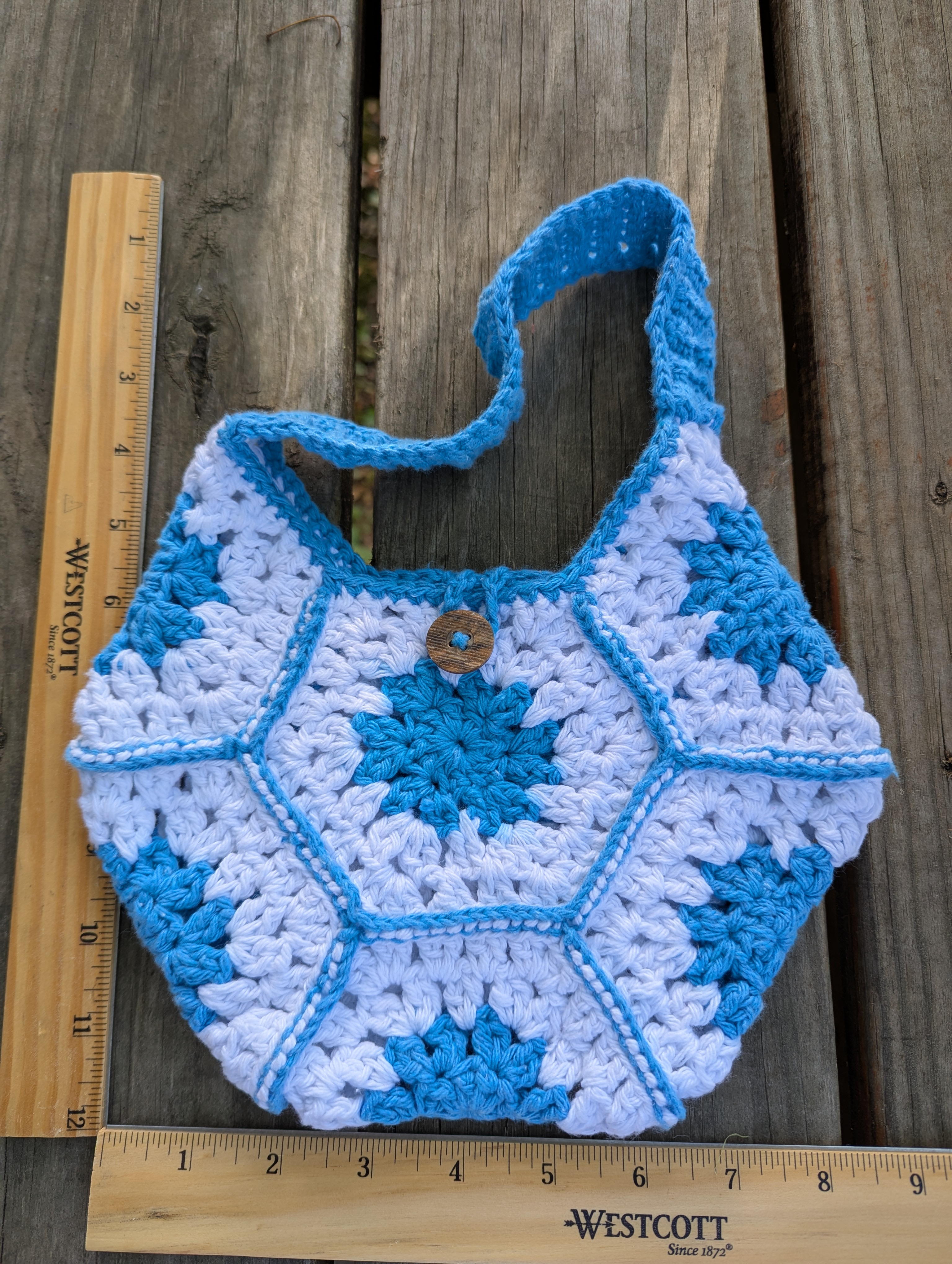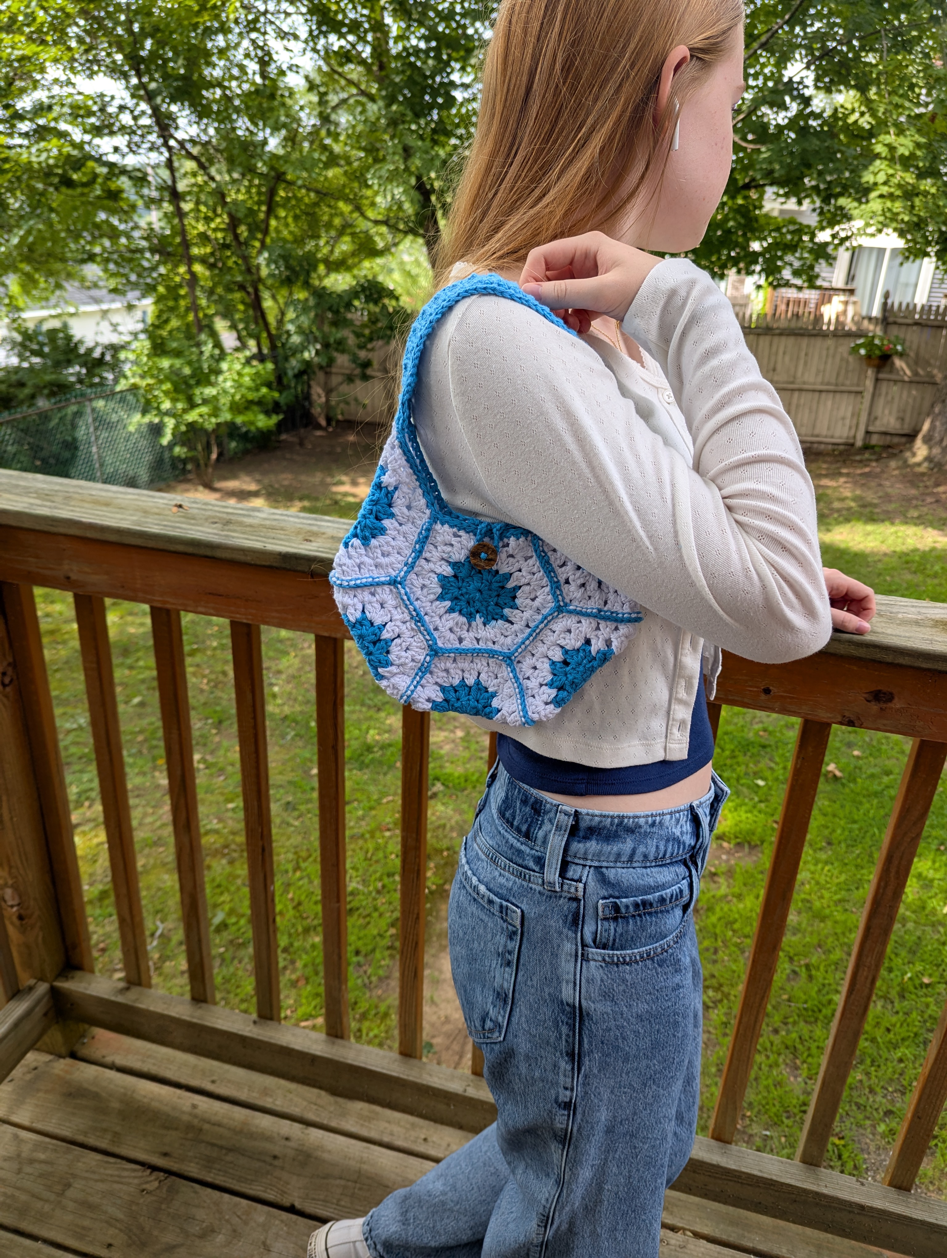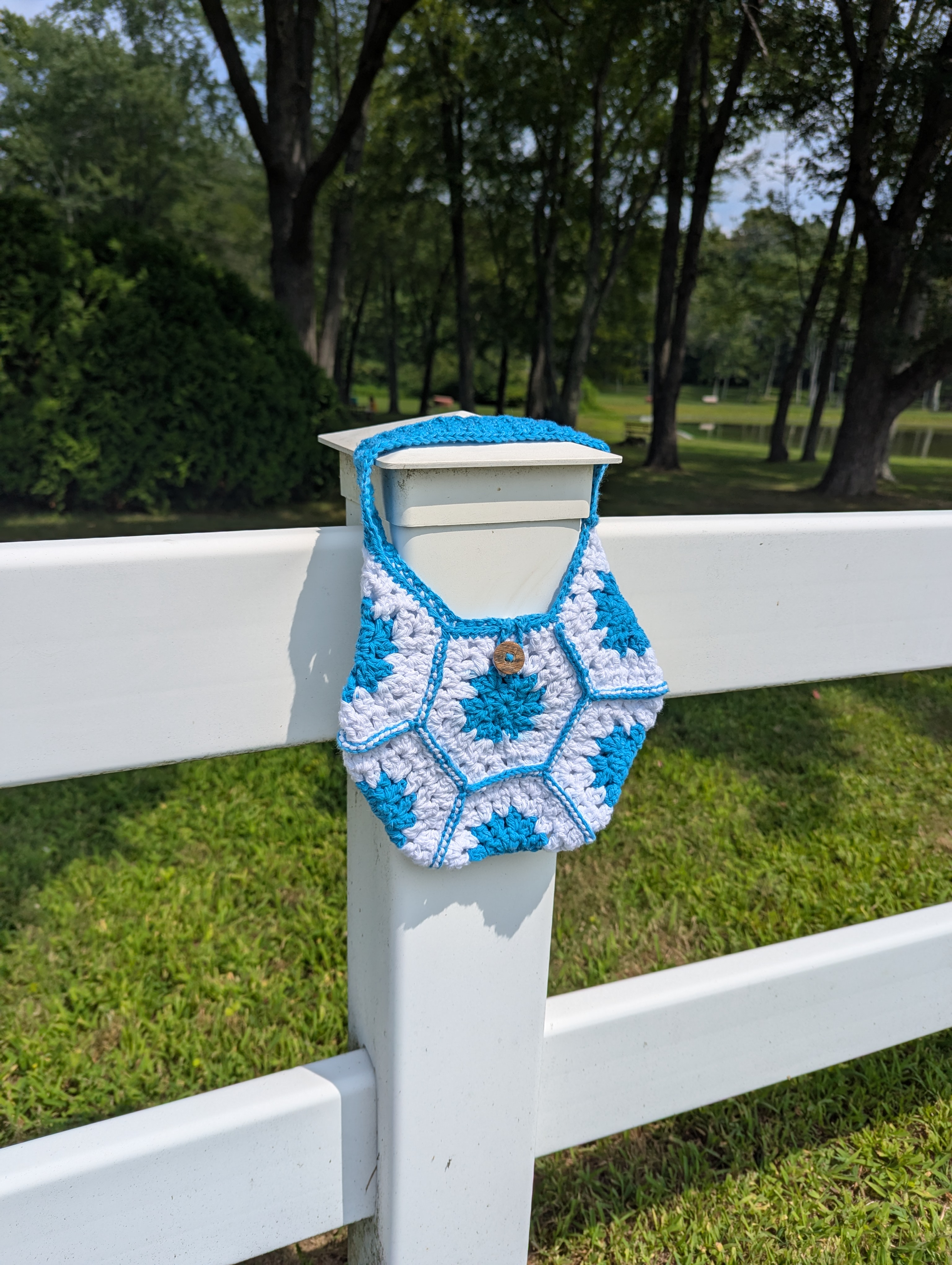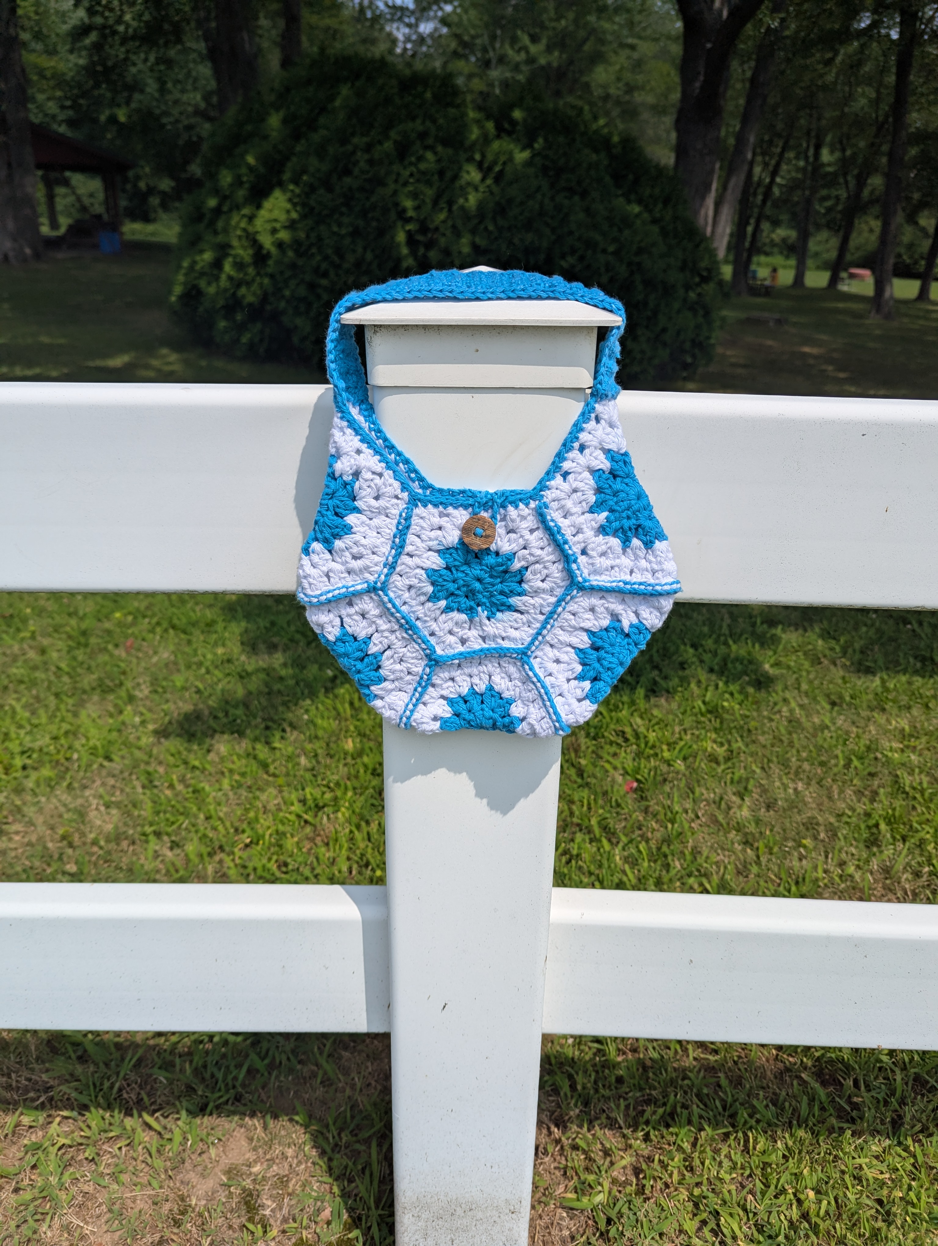 This crochet hexagon bag is small but mighty! Made with a blend of 85% cotton and 15% polyester yarn, it's both durable and has enough give to accommodate all of your must-haves when you're on the go. The handle is made using a special stitch, which allows it to stretch just enough to wear comfortably on your shoulder. The hexagon bag also includes a center button and loop, allowing it to hold all of your important items safely inside. Machine washable and built to last. This hexagon bag would make a great gift for friends or family, or a lovely treat for yourself!