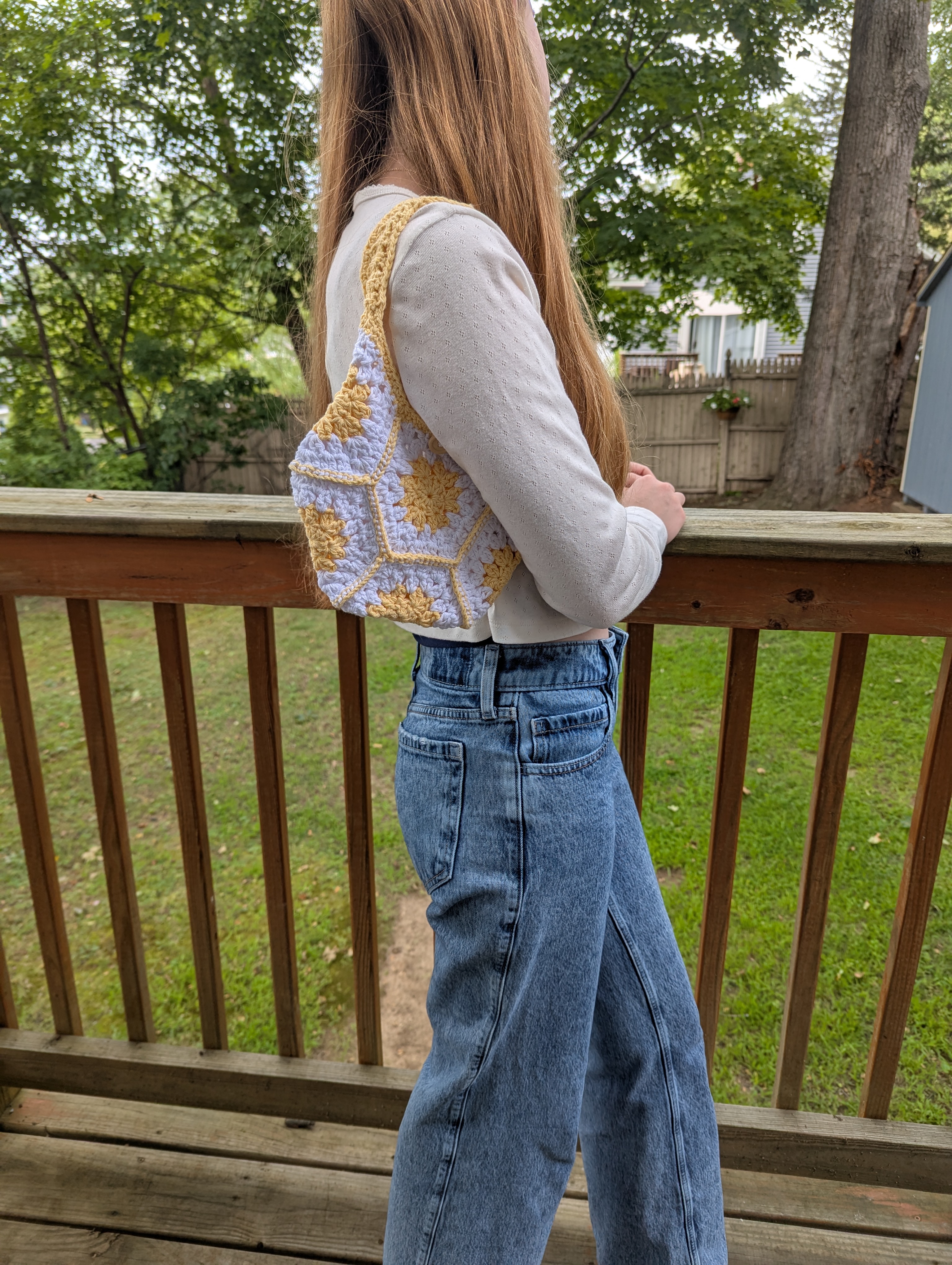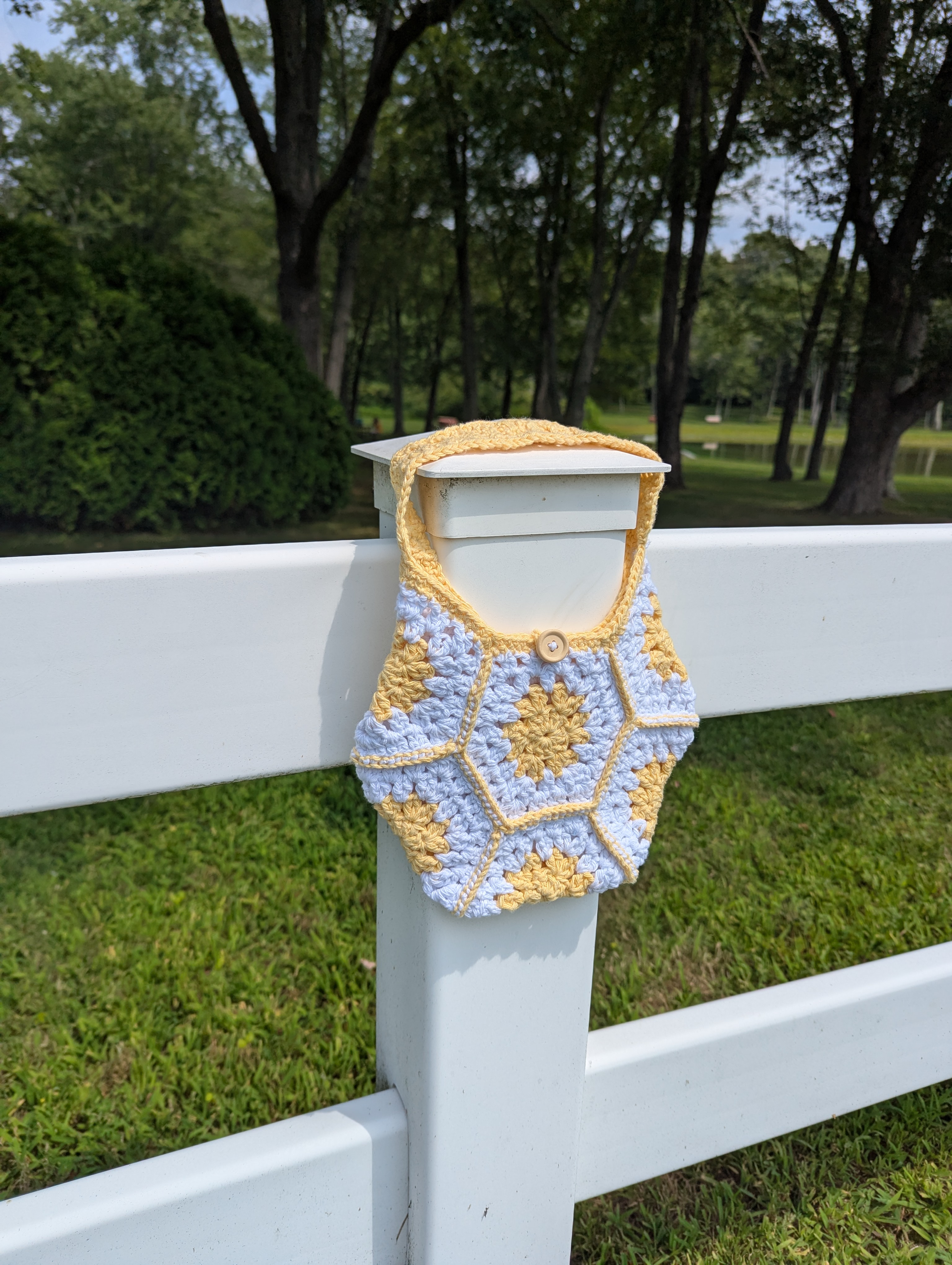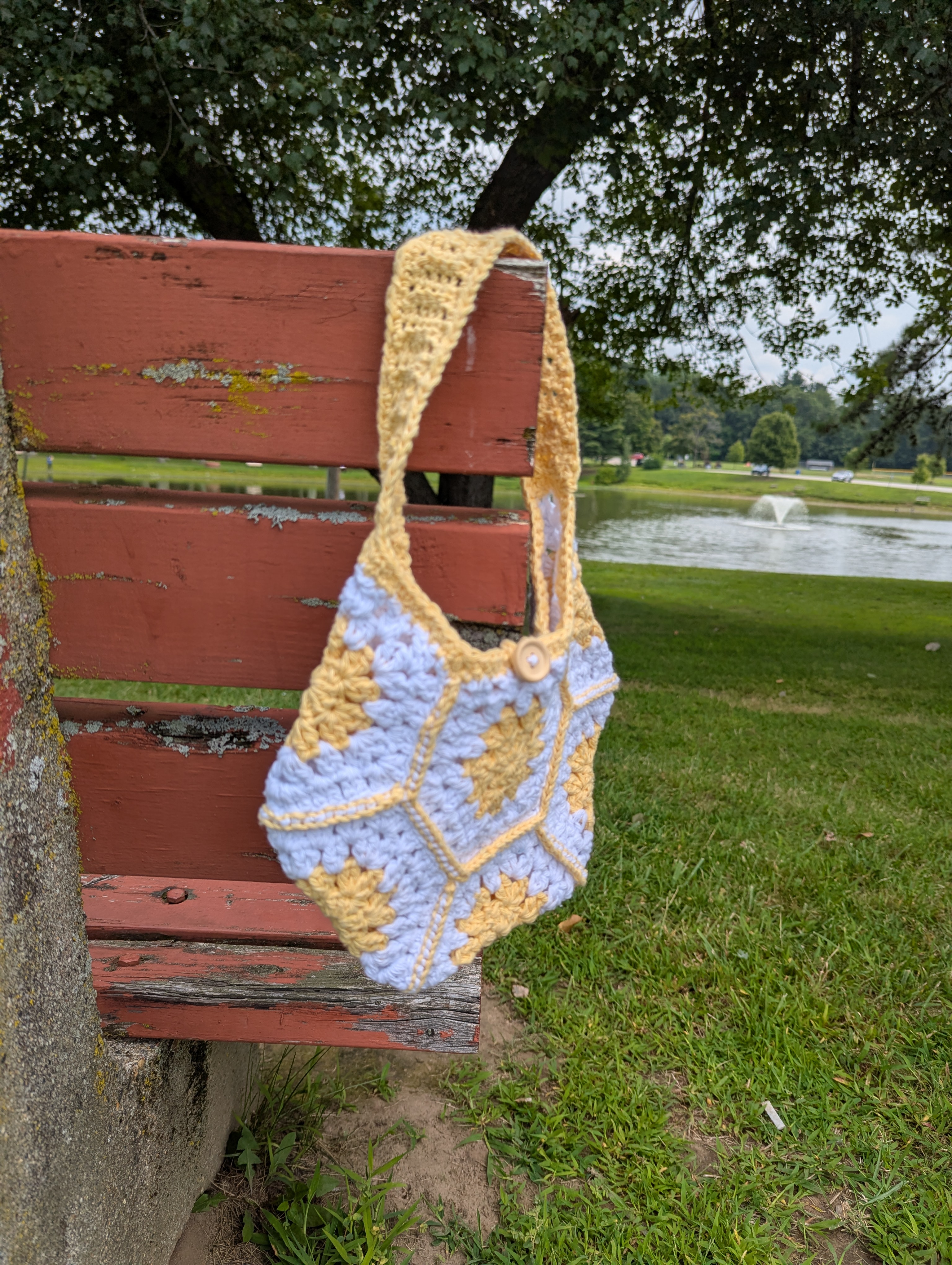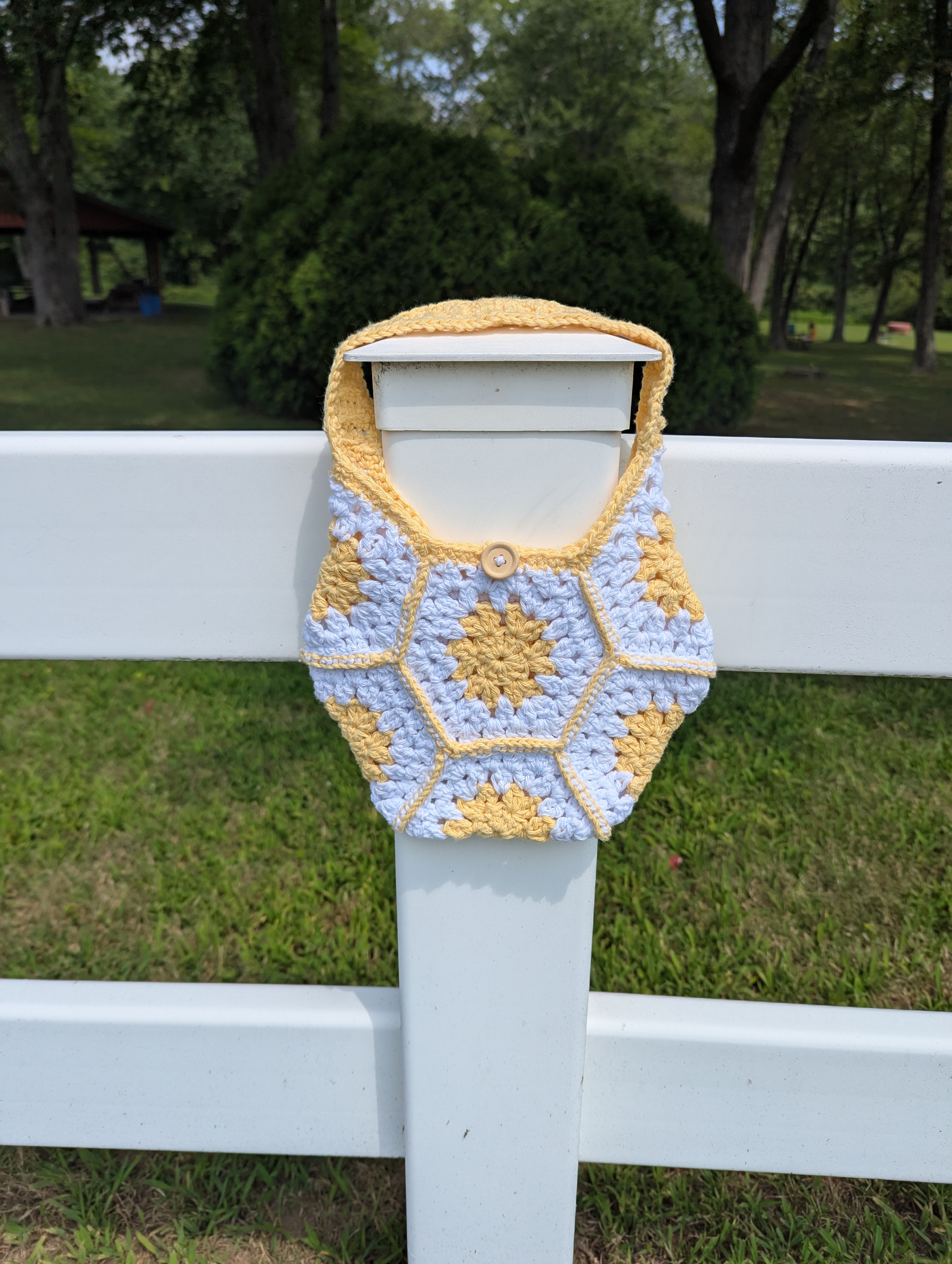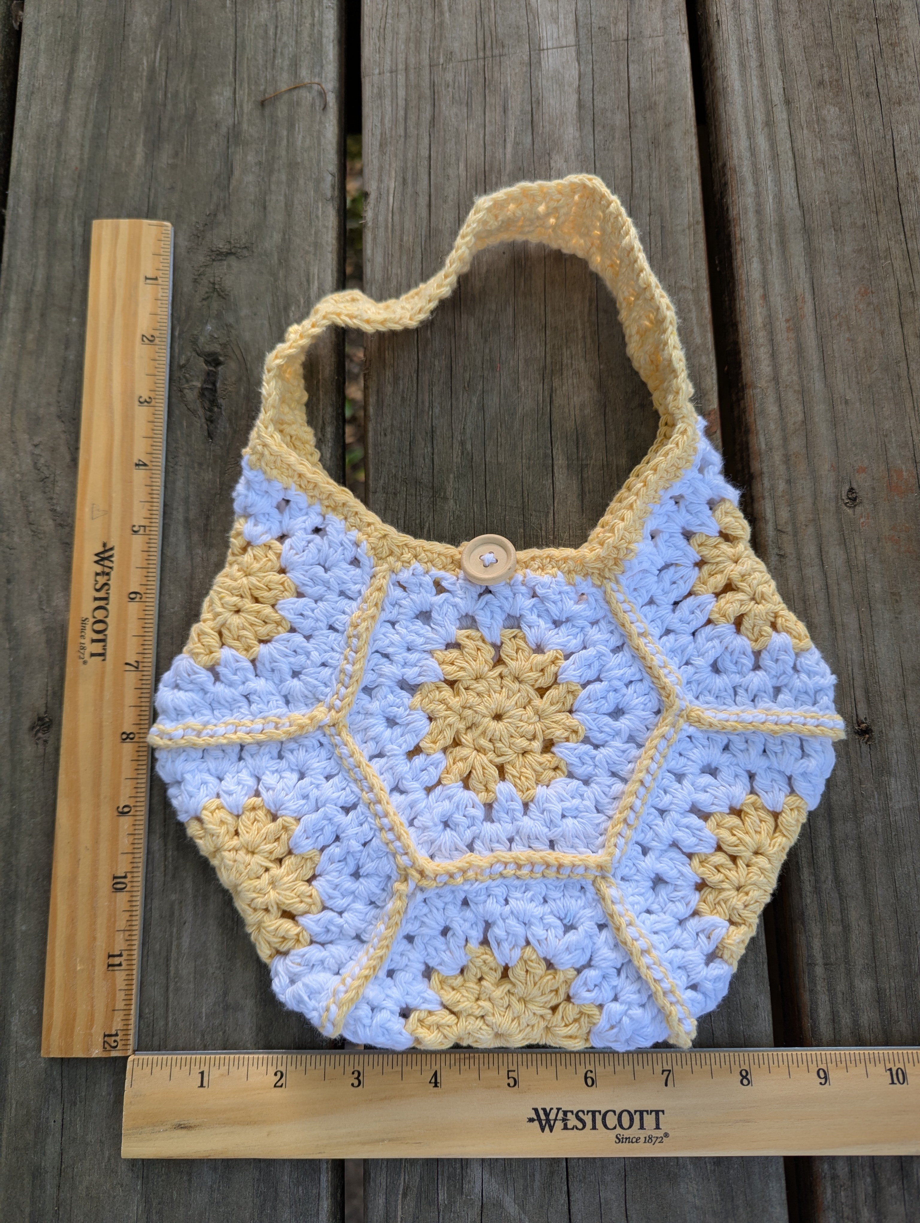 This crochet hexagon bag is small but mighty! Made with a blend of 85% cotton and 15% polyester yarn, it's both durable and has enough give to accommodate all of your must-haves when you're on the go. The handle is made using a special stitch, which allows it to stretch just enough to wear comfortably on your shoulder. The hexagon bag also includes a center button and loop, allowing it to hold all of your important items safely inside. Machine washable and built to last. This hexagon bag would make a great gift for friends or family, or a lovely treat for yourself!