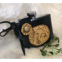 Glass ball decorated with alcohol ink covered with leather holder and hanger. Cork style fairy lights