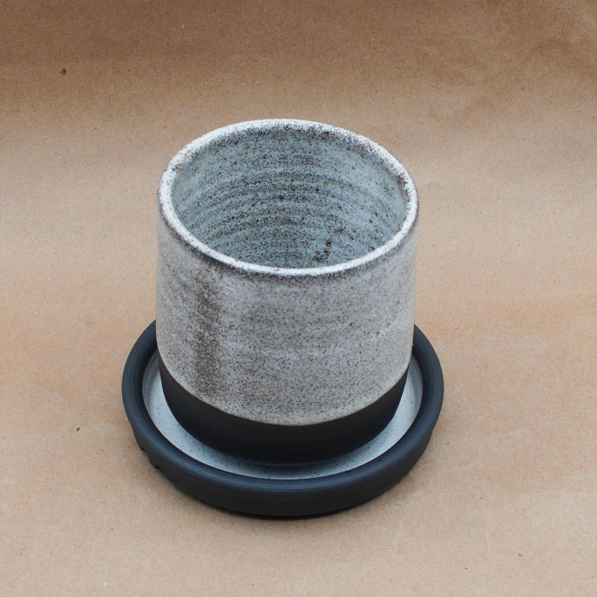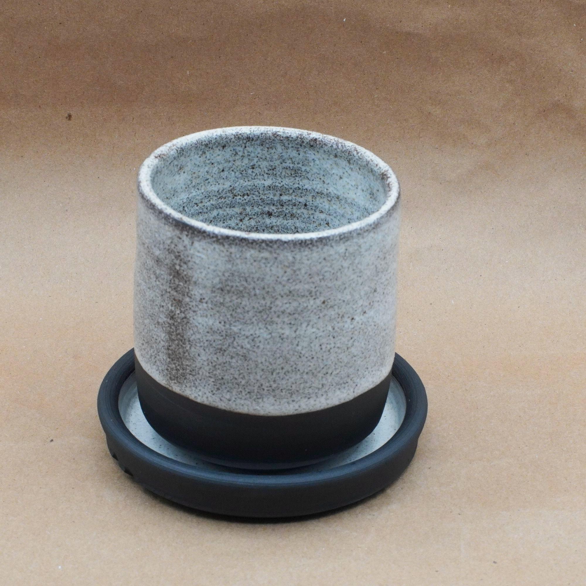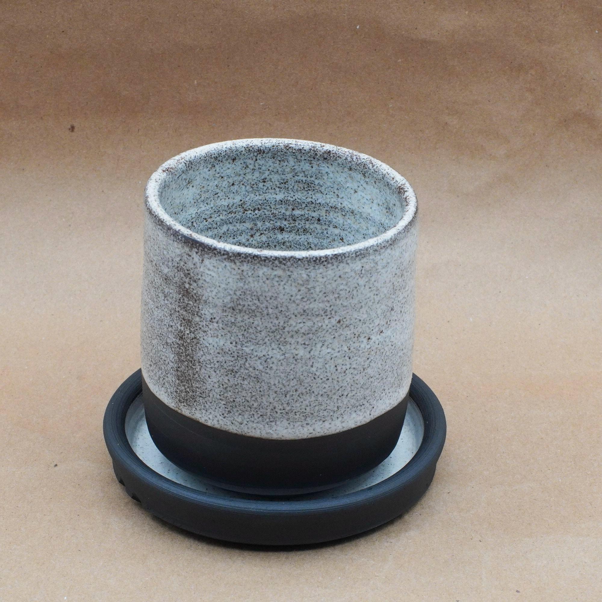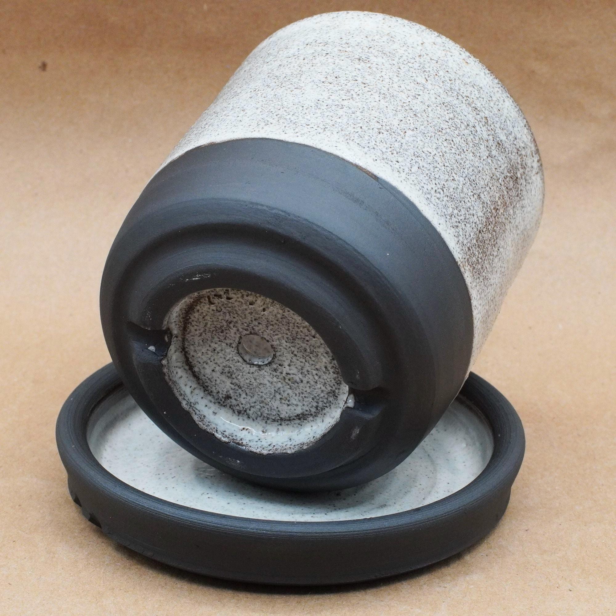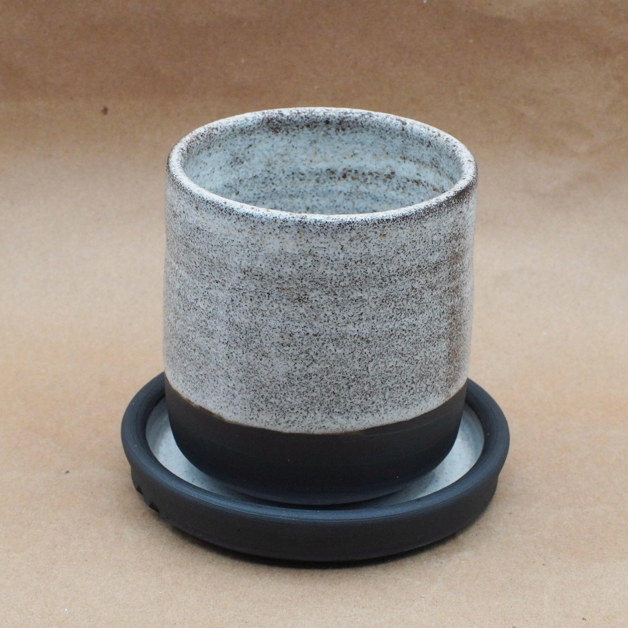Bring a touch of elegance to your home with this handmade ceramic planter. Handmade on the pottery wheel with obsidian stoneware and finished with a speckled white glaze. Designed with both beauty and function in mind, this small planter includes a drainage hole and a matching saucer to keep your house plant healthy while protecting your surfaces. Its earthy tones pair well with greenery, makes it perfect for succulents, herbs, or small houseplants.