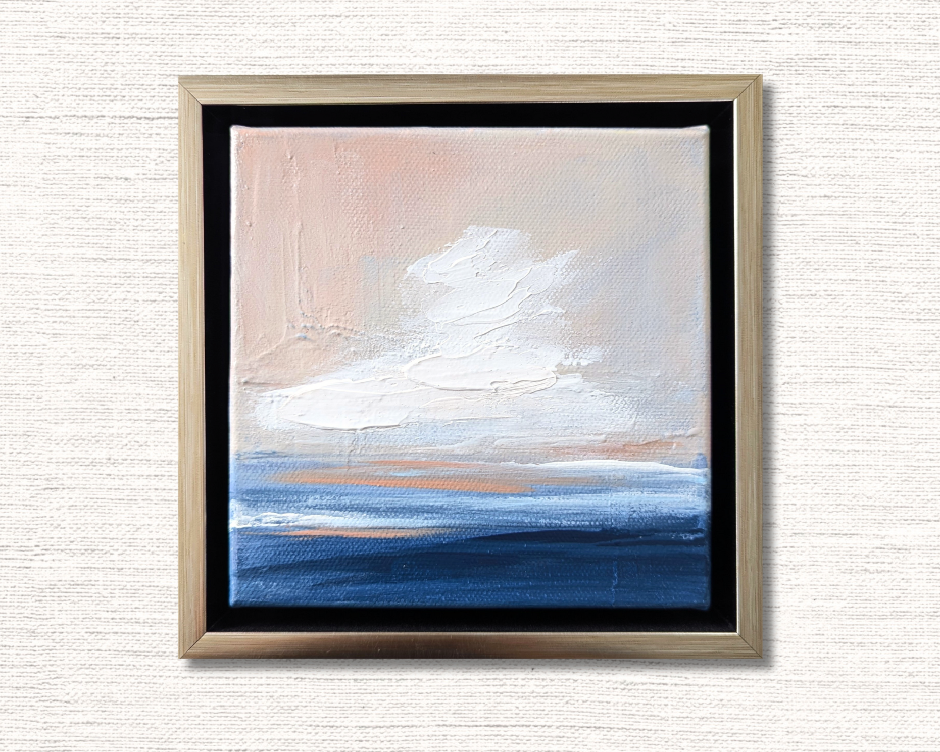 This painting is a small original abstract seascape in shades of peach, beige, blue and soft white on canvas, framed in a soft gold floater frame ( included in this listing). It was painted in my studio in Millsboro, DE., inspired by the beautiful Delaware coast line and beaches nearby. These beautiful small paintings not only look great on your wall, but are also great decor pieces for tables, consoles and bookshelves. Due to the deep canvas they can stand safely on their edges. A perfect gift for any occasion such as Christmas, birthdays, retirement or as new home gift.