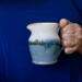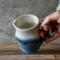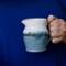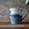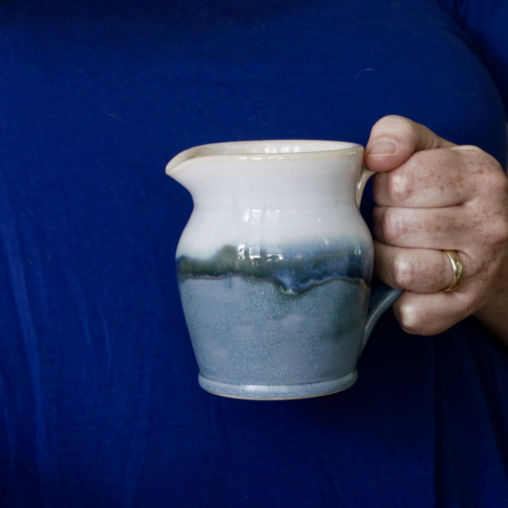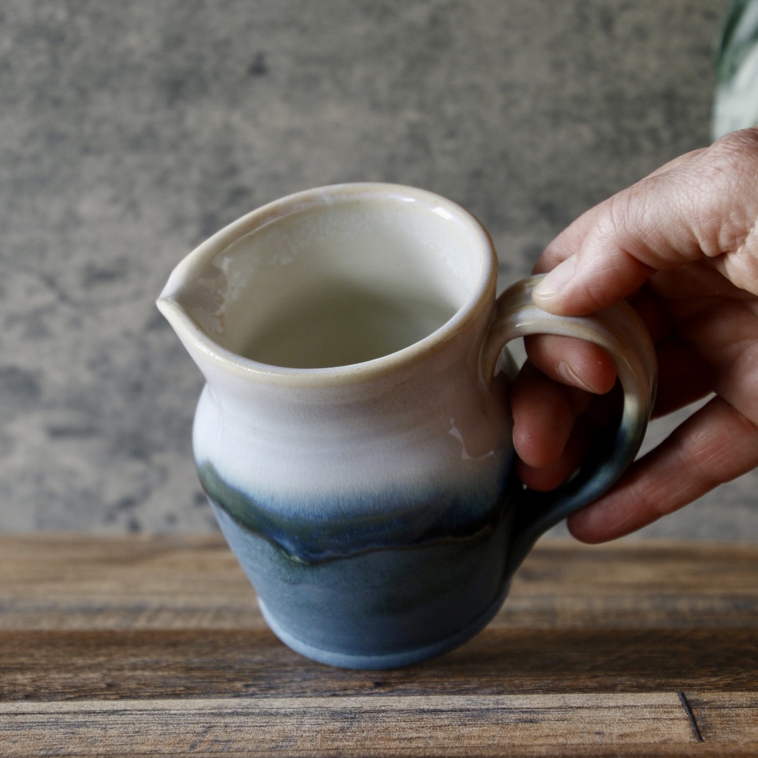 This beautiful pitcher will look lovely in any home, as decor or as a functional small pitcher for cream, milk, water, or wine. It holds up to 12oz of liquid, and would be gorgeous as a centerpiece with flowers. The bottom is a satiny smooth patina blue green color, and the top is a luminous glossy white.