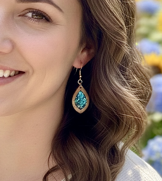 These small pointed ellipse earrings are made with open back wood bezels, with sparkling Deep Blue dichroic flakes. A clear resin coat makes them shine!