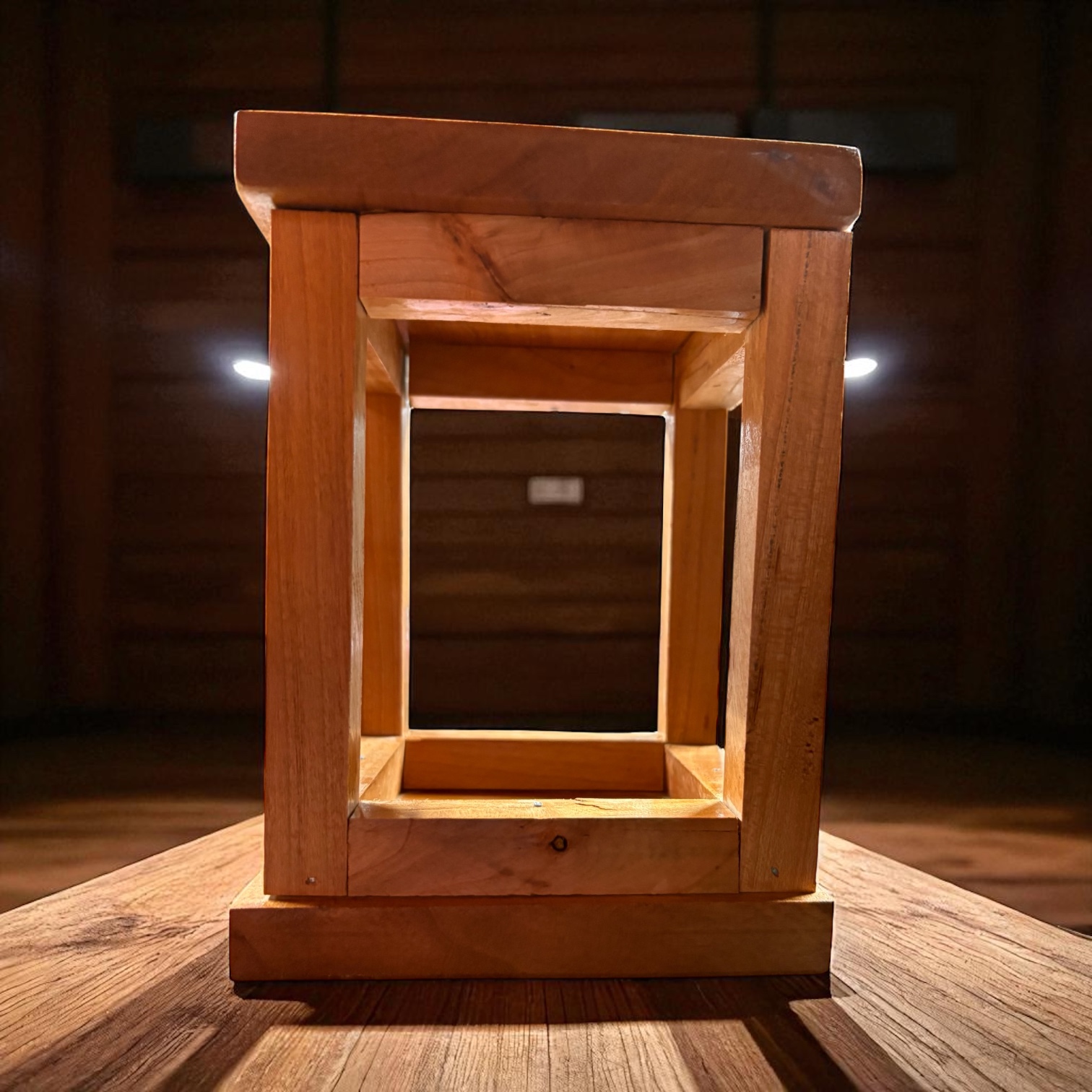 This candleholder measures 7.75 inches in height and is 5.5 inches square. The wood has been sealed with polyurethane.