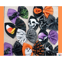 5 inch bow with smiley face prints on your choice of clip, nylon headband or nylon hair tie.