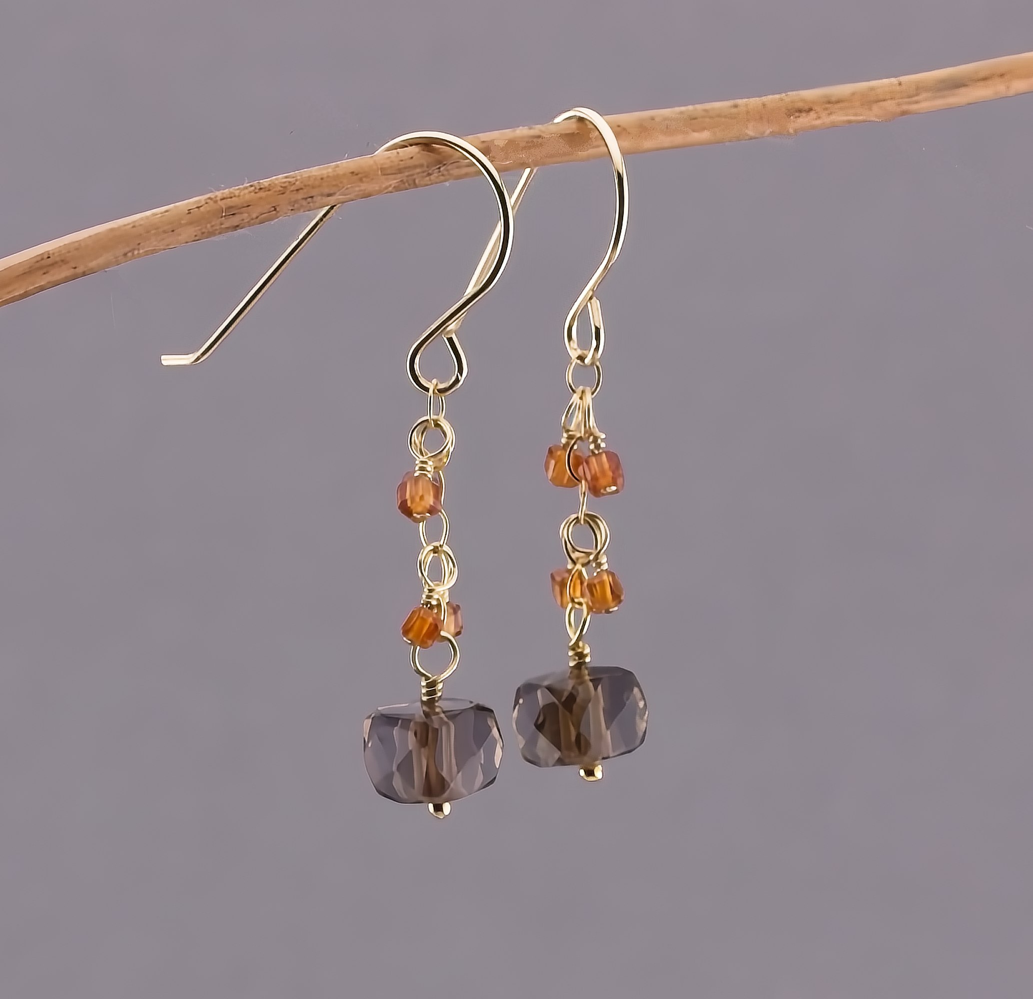 Earthy sophistication with a golden glow. Faceted smoky quartz cubes and their rich, smoky tones paired with delicate hessonite garnet dangles in warm amber-orange hues. The perfect balance of shadow and light, these earrings are very lightweight, versatile, and fiery. Suspended from hand forged gold-filled earwires and all gold filled materials.