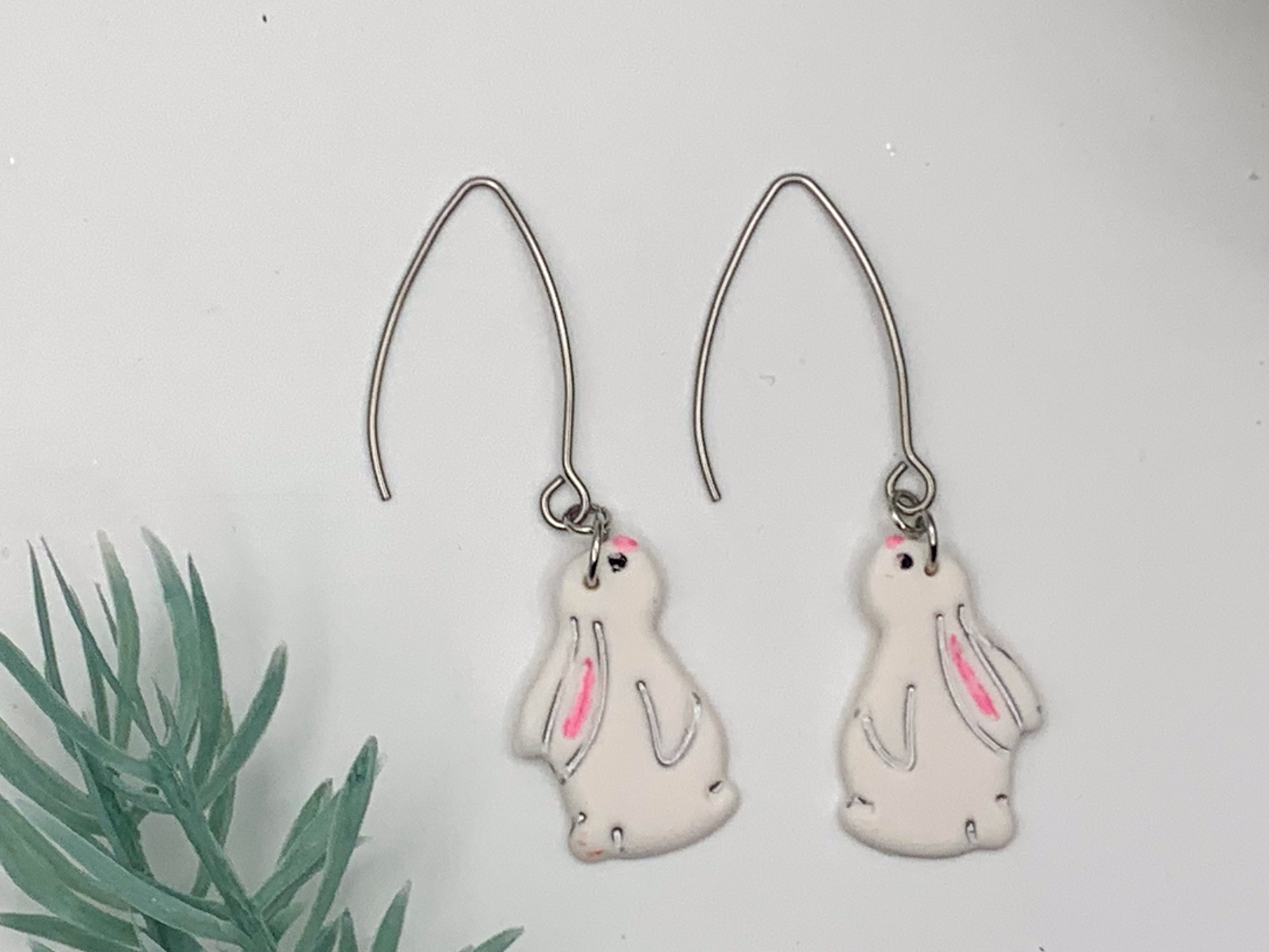 Sweet and simple! These white bunny earrings with soft pink accents are perfect for adding a touch of whimsy to your outfit.