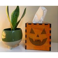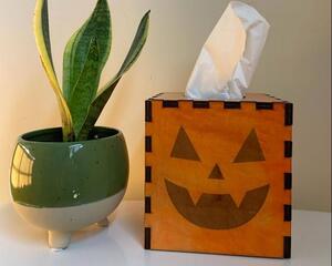 Each handcrafted tissue box is made of 1/4" Baltic birch, stained with a Lime Cordial stain and sealed with semi-gloss clear coat protectant to preserve the laser engraved design. A great way to get ready for Halloween!