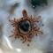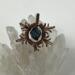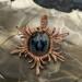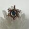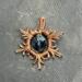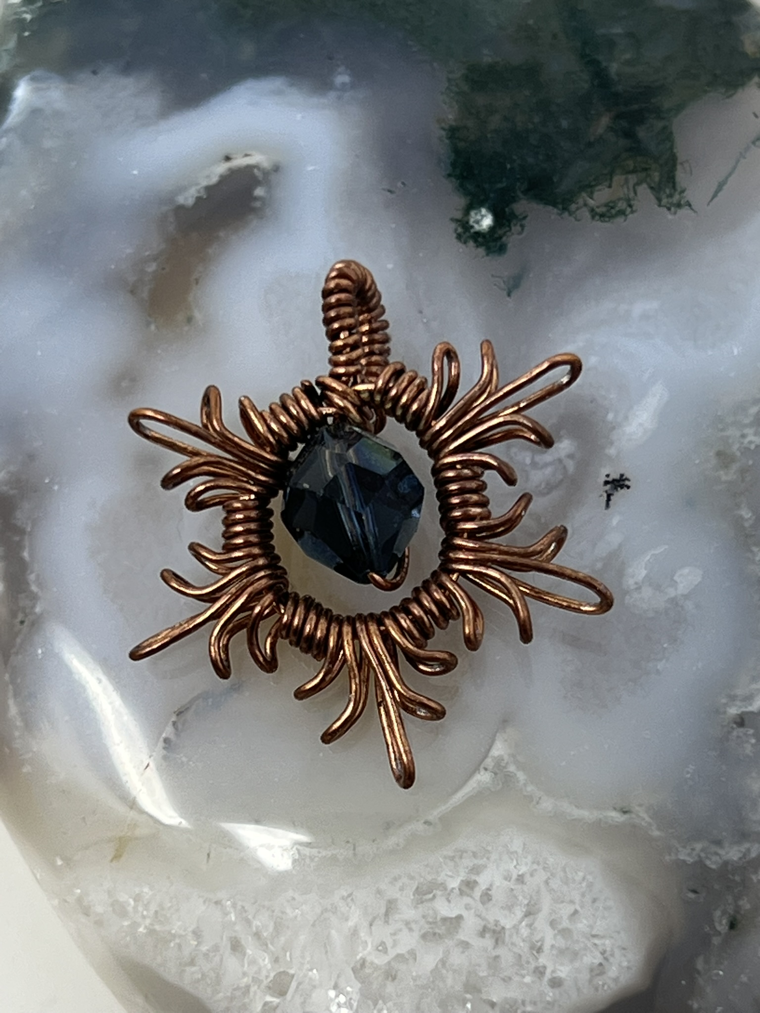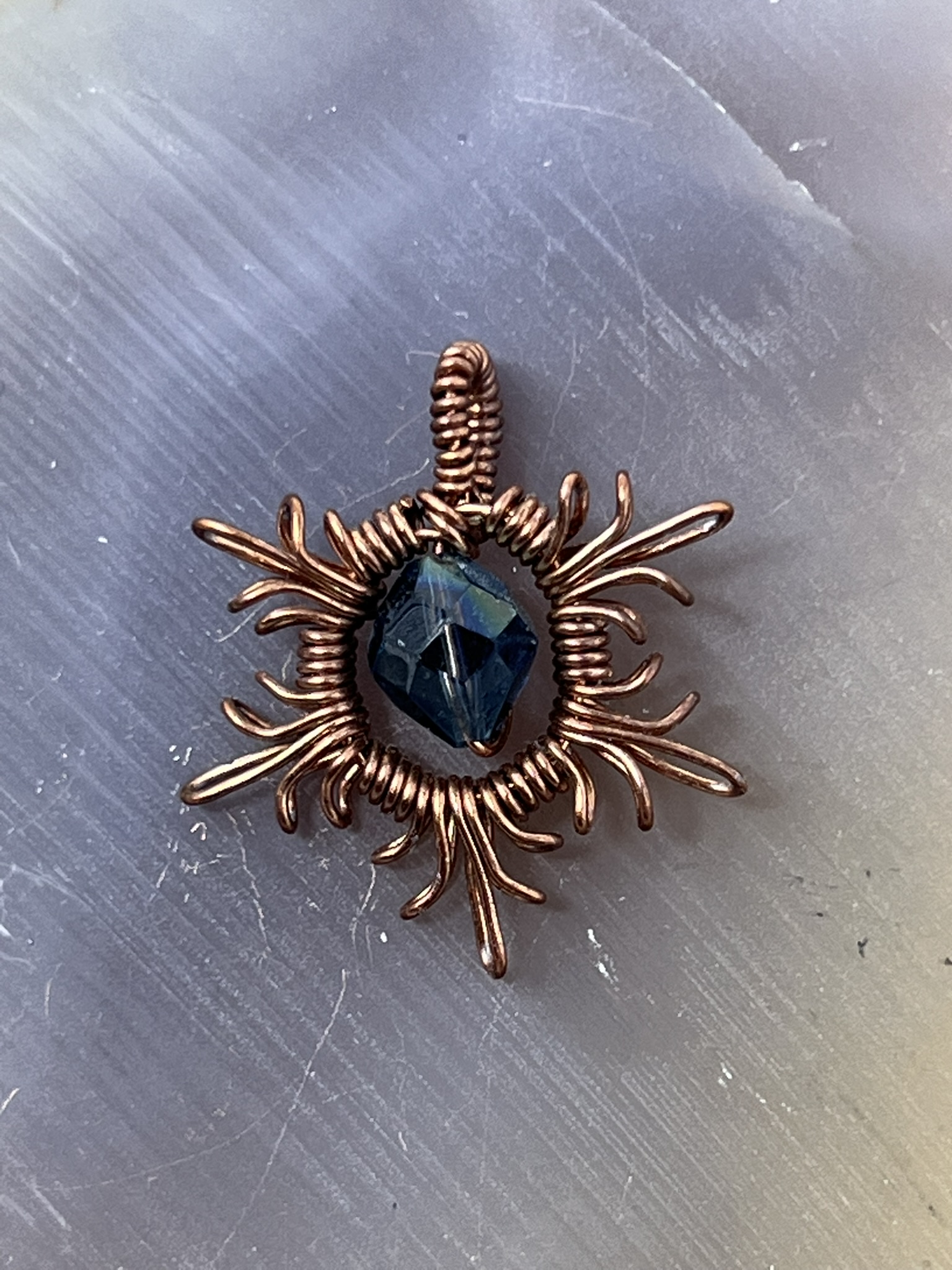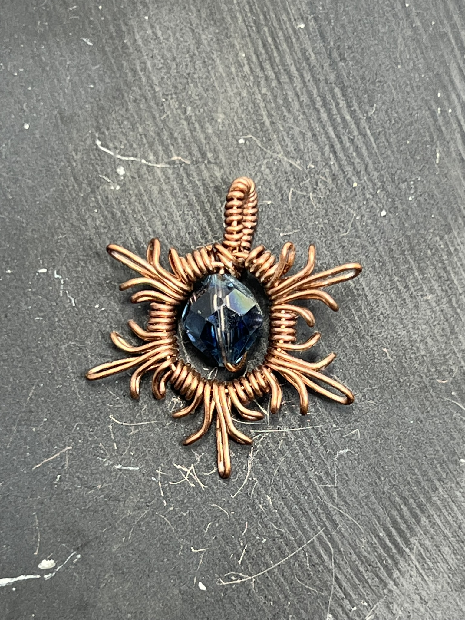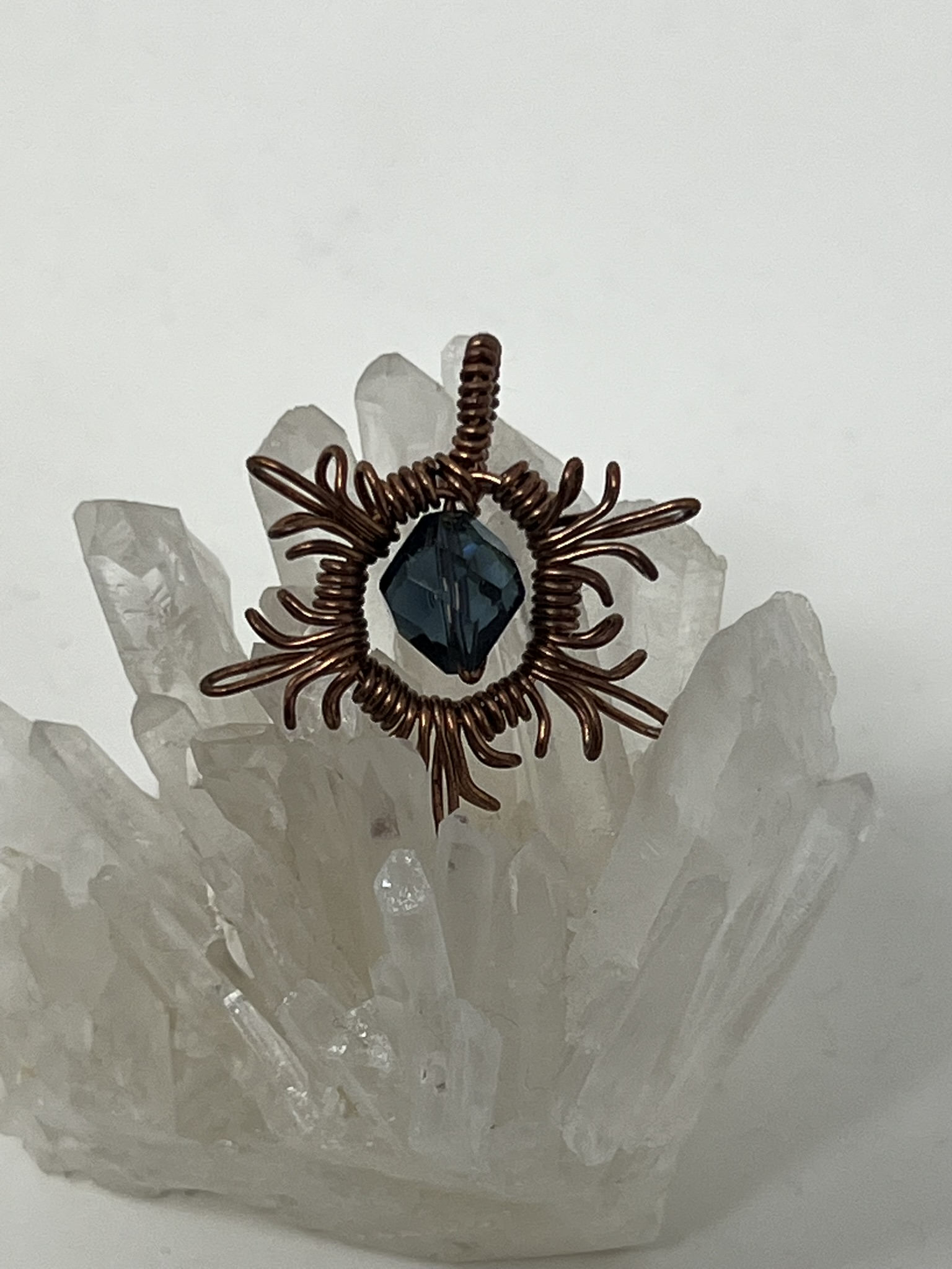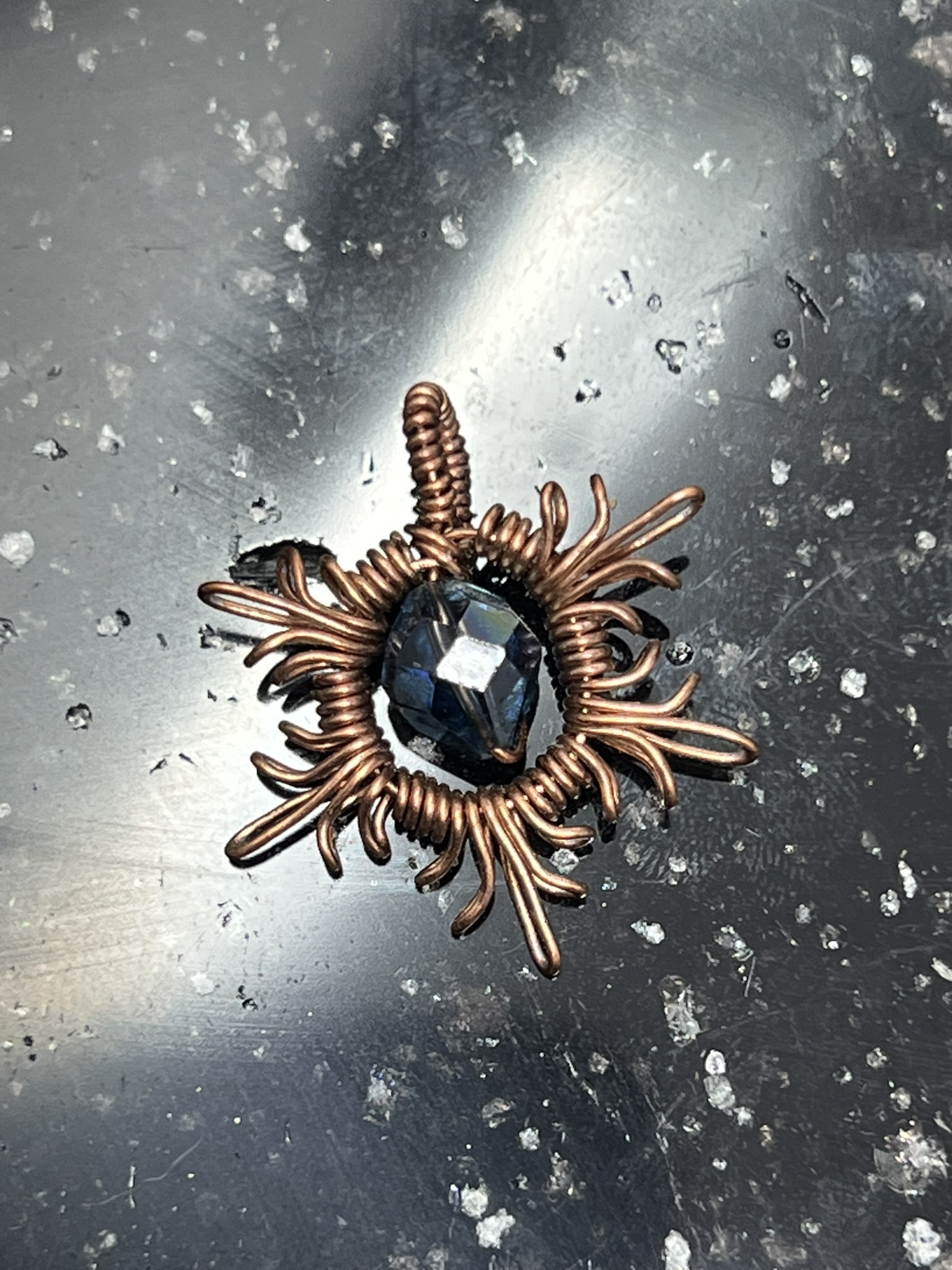 This fun pendant features a blue glass bead that has been wrapped in a snowflake style wrap that is made with copper wire. To make this piece, I took 4 small rods and started weaving a piece of 22 gauge round copper wire to make the snowflake pattern. Once I was done making the snowflake pattern, I pulled the rods from the wrap, added a blue glass bead, and strung the weaved wire onto it and wrapped it around the bead to make the snowflake shape. I then wrapped the extra wire from the snowflake frame around the end of the piece that has the bead to make the bail and to secure everything into place. Once that was done, I bent the longer pieces of the snowflake to give it the unique shape. This piece is handmade in Minnesota.