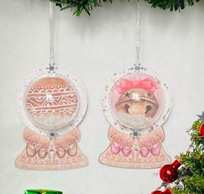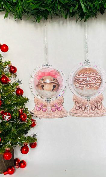 Sparkly snowglobe ornaments for your Christmas tree! This set of 2 unique ornaments is like a tiny winter wonderland, with glittery frames and "snow" inside. Each one has a cute Christmas design printed on cardstock and a pretty teardrop rhinestone on the base. They're sure to be the hit of your holiday gathering!