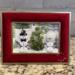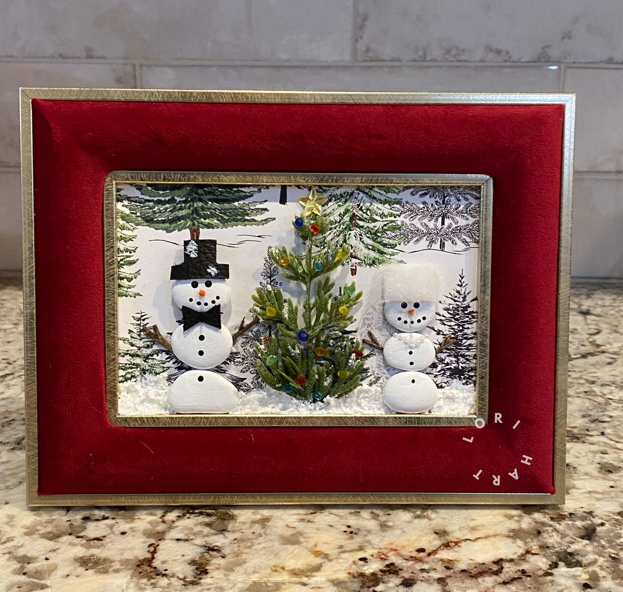 The snowman & snowlady are painted river rocks & decorated with various materials to achieve this result. The background is a decorative cardstock. The Christmas tree is made from artificial pine. The frame is a soft suede.