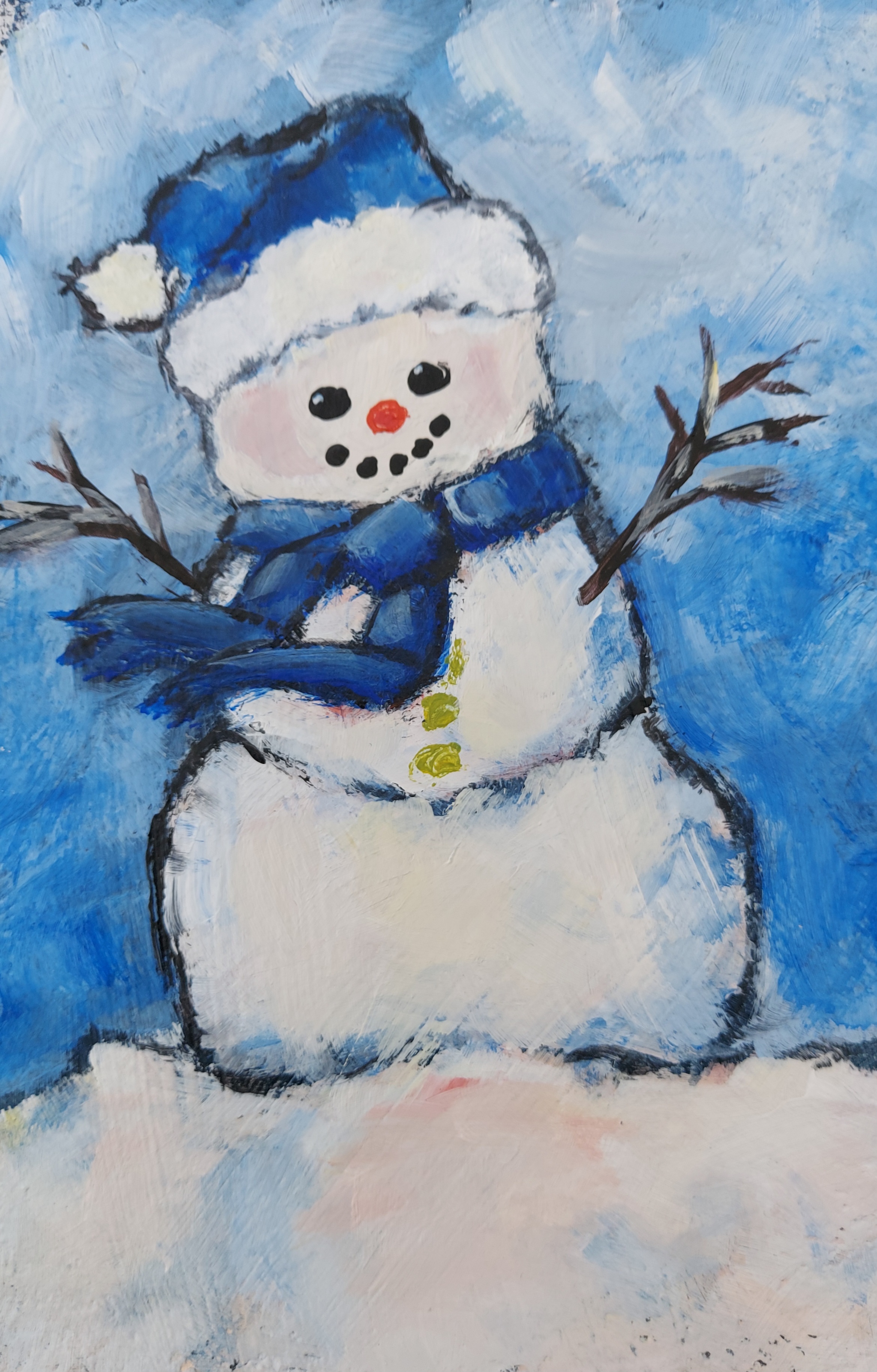 Original acrylic painting of a very happy snowman then printed on cardstock. He makes me smile every time zi see him.