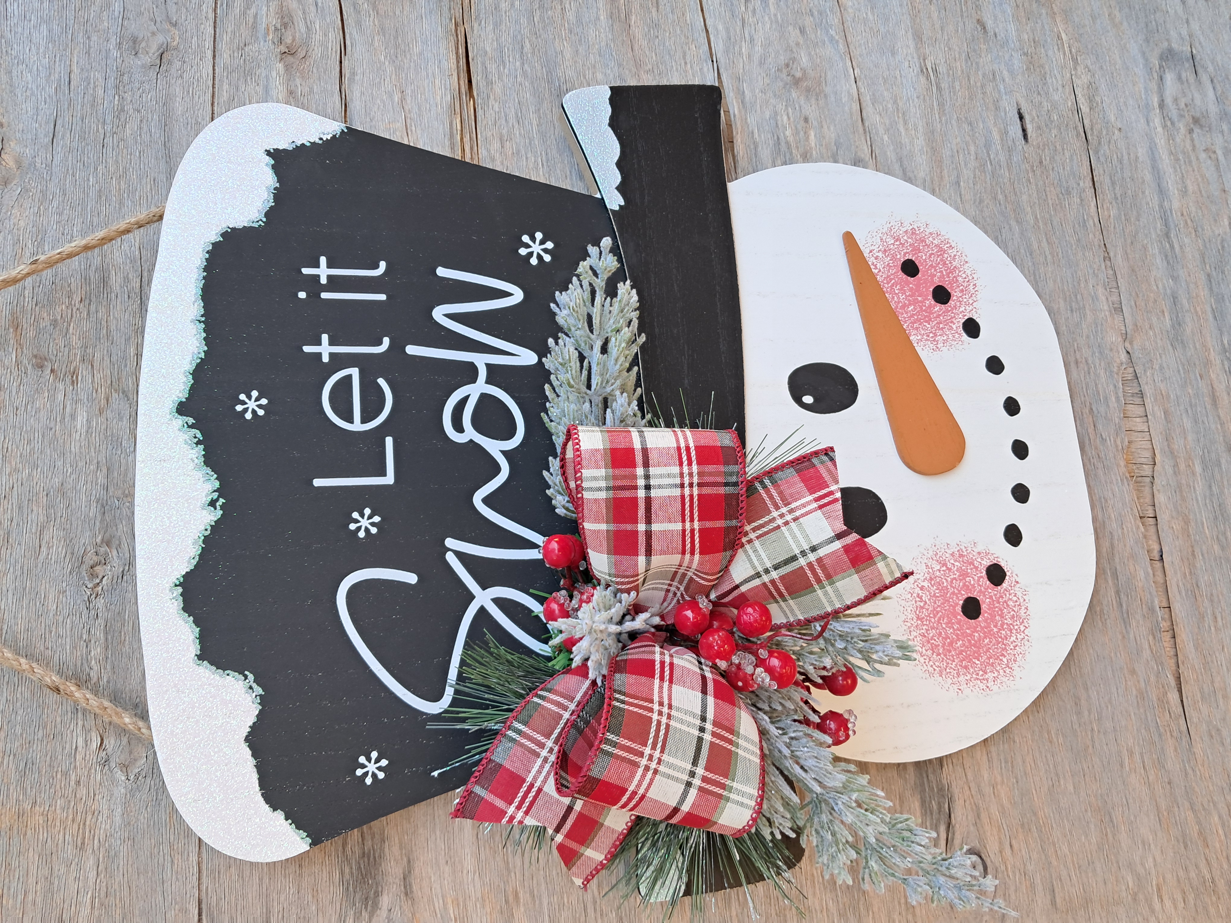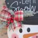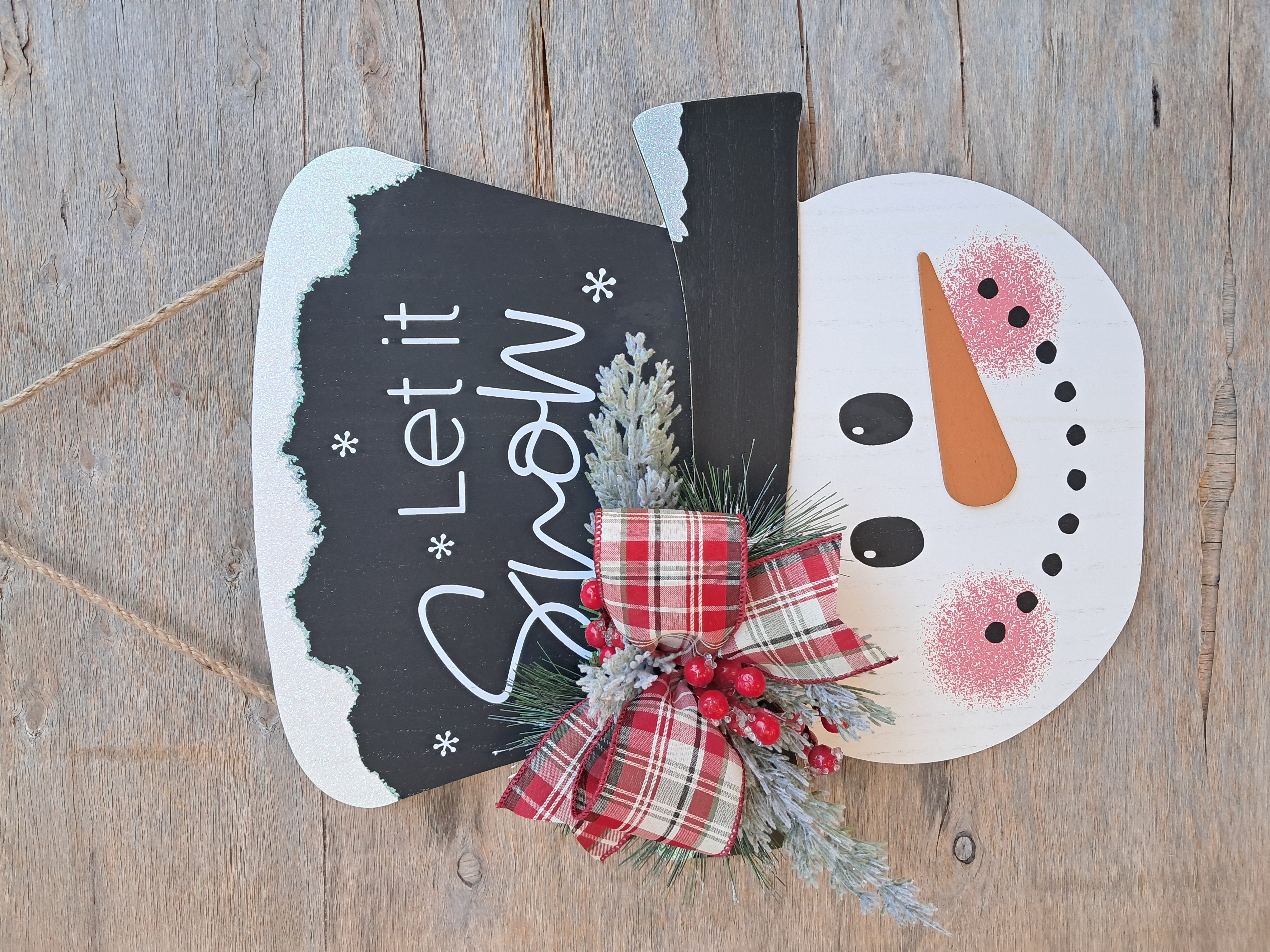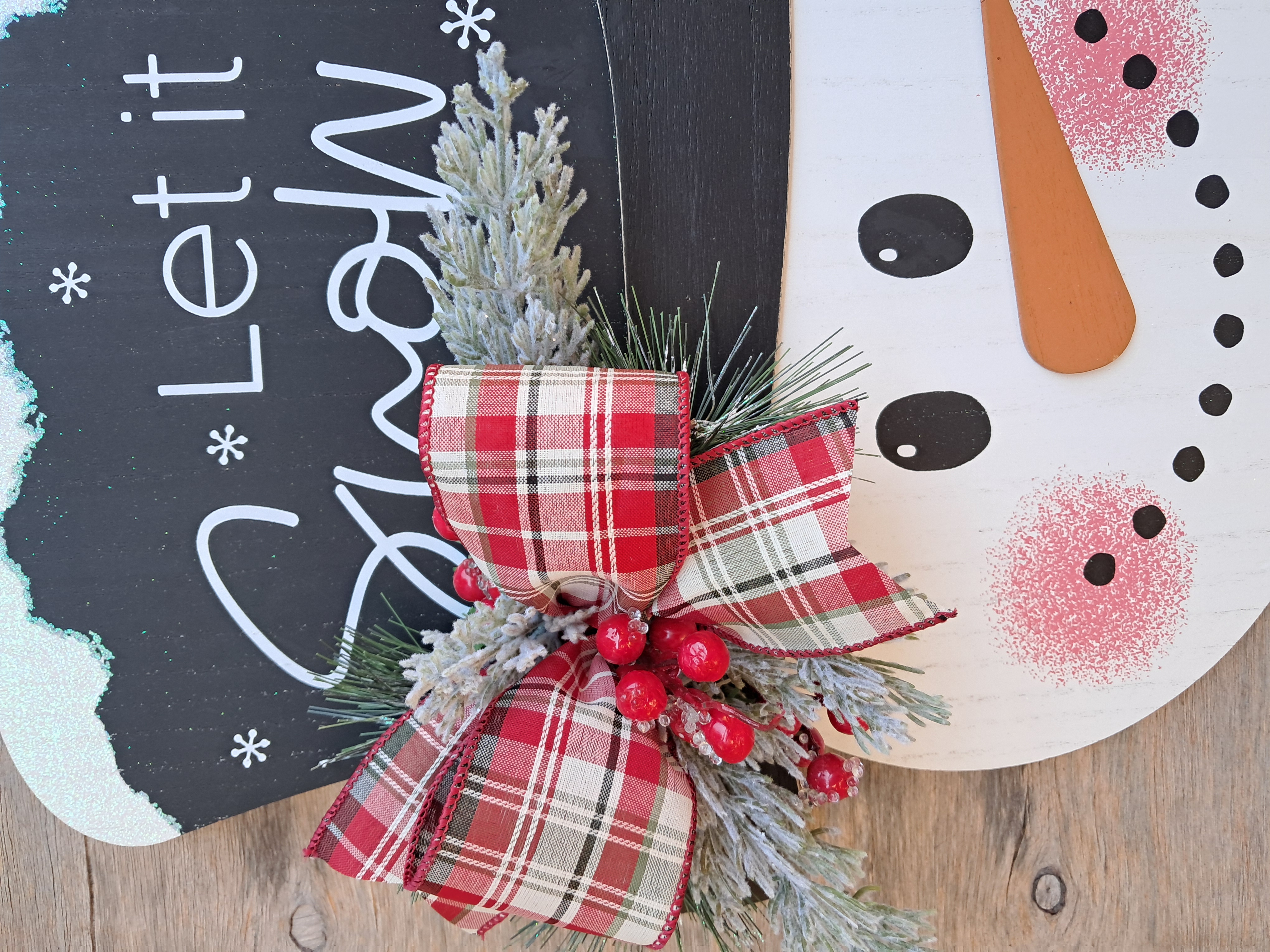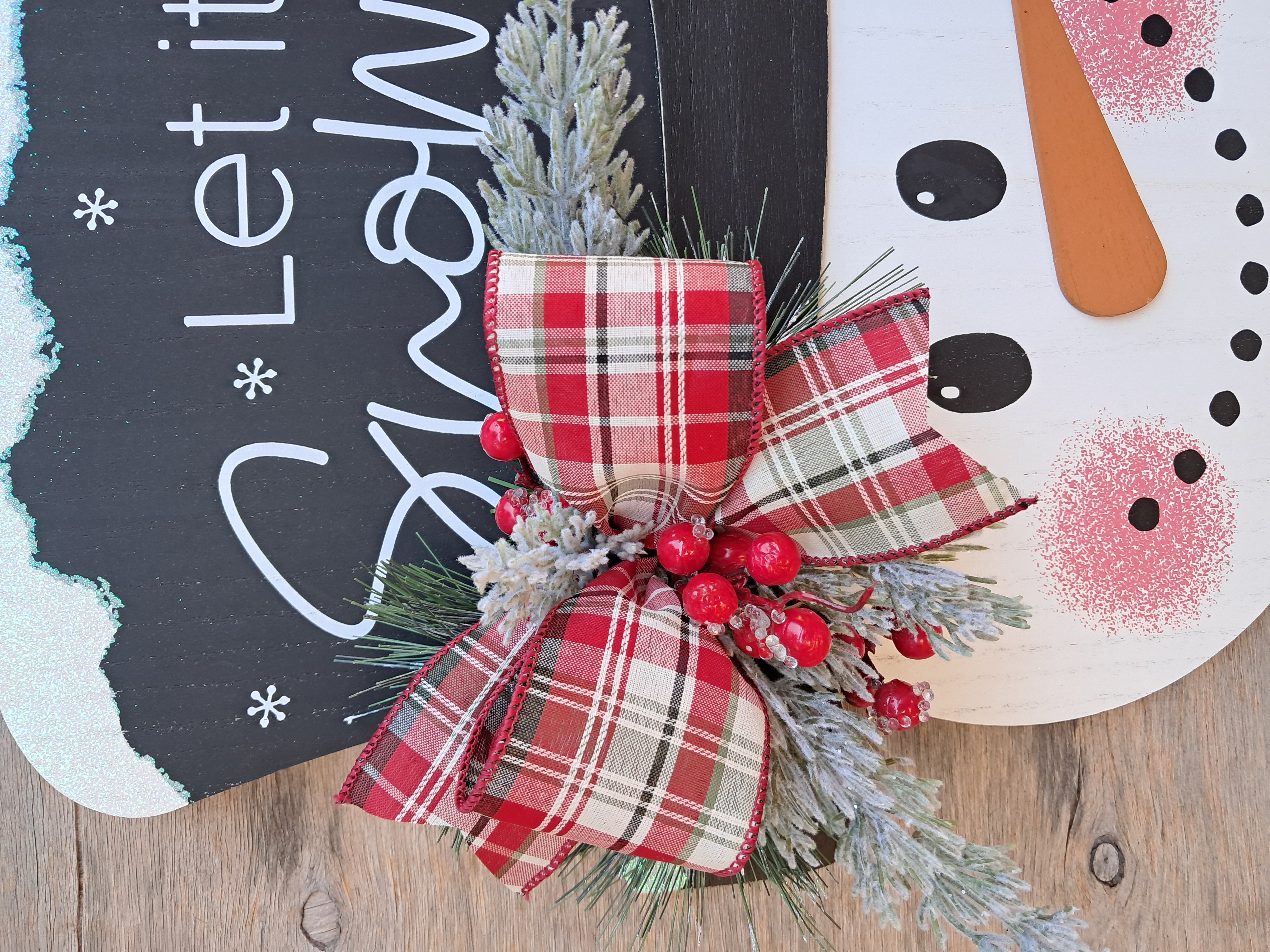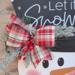 Bring a touch of whimsy and cheer to your holiday season with this delightful snowman door hanger. Adorned with glittery pine, flocked cedar, and iced berries, the snowman’s festive hat is finished with a festive red plaid bow for the perfect pop of Christmas charm.