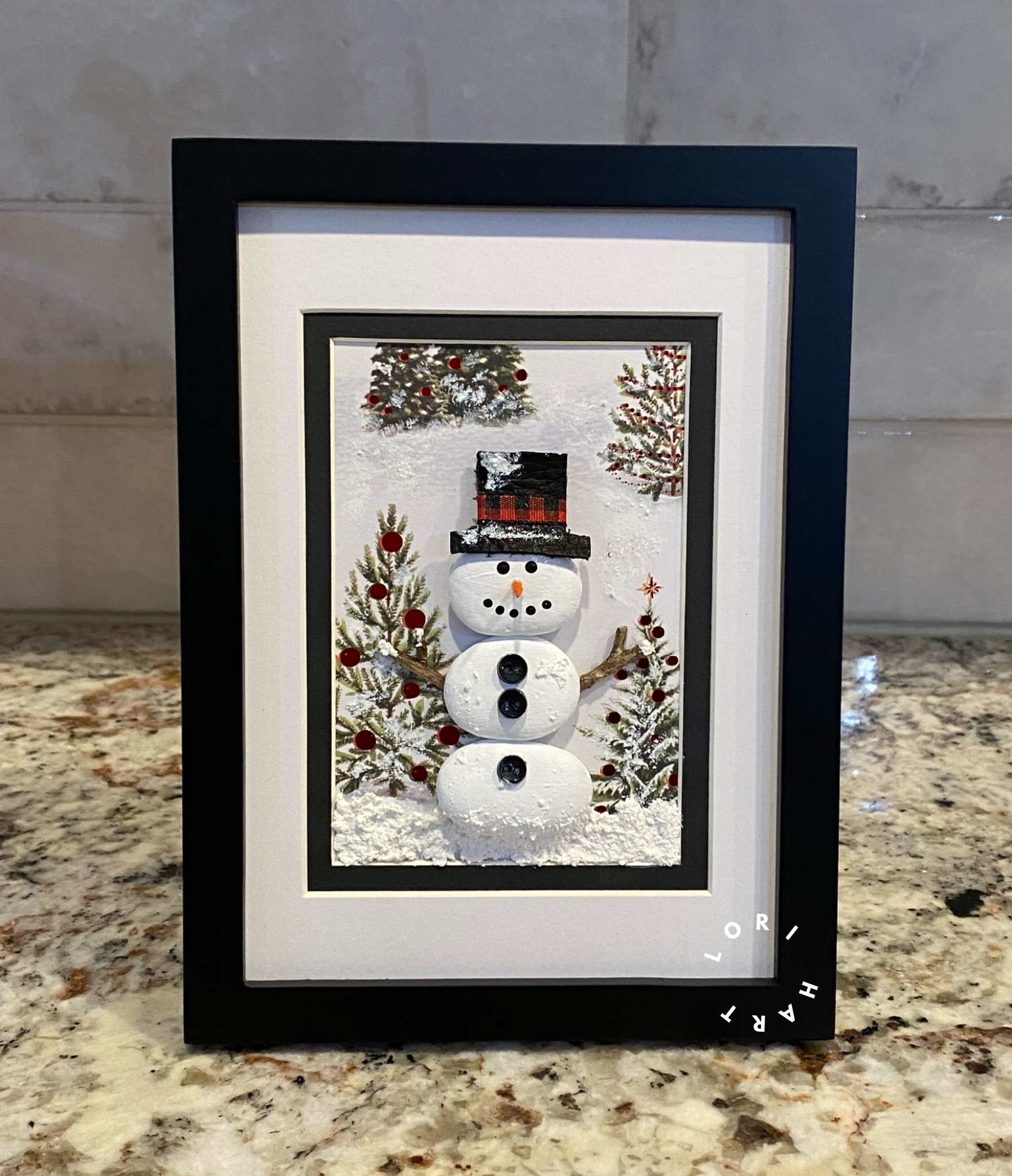 For the snowman lover ... this adorable snowman is creatively decorated to make you smile! He is made from river rocks & has unique accessories, including faux snow & a woodland scenic background. The black frame is double-matted & has an easel back. It measures 5-1/2" x 7-1/2". He would make a perfect gift for someone on your list, or a lovely addition to your holiday decor!