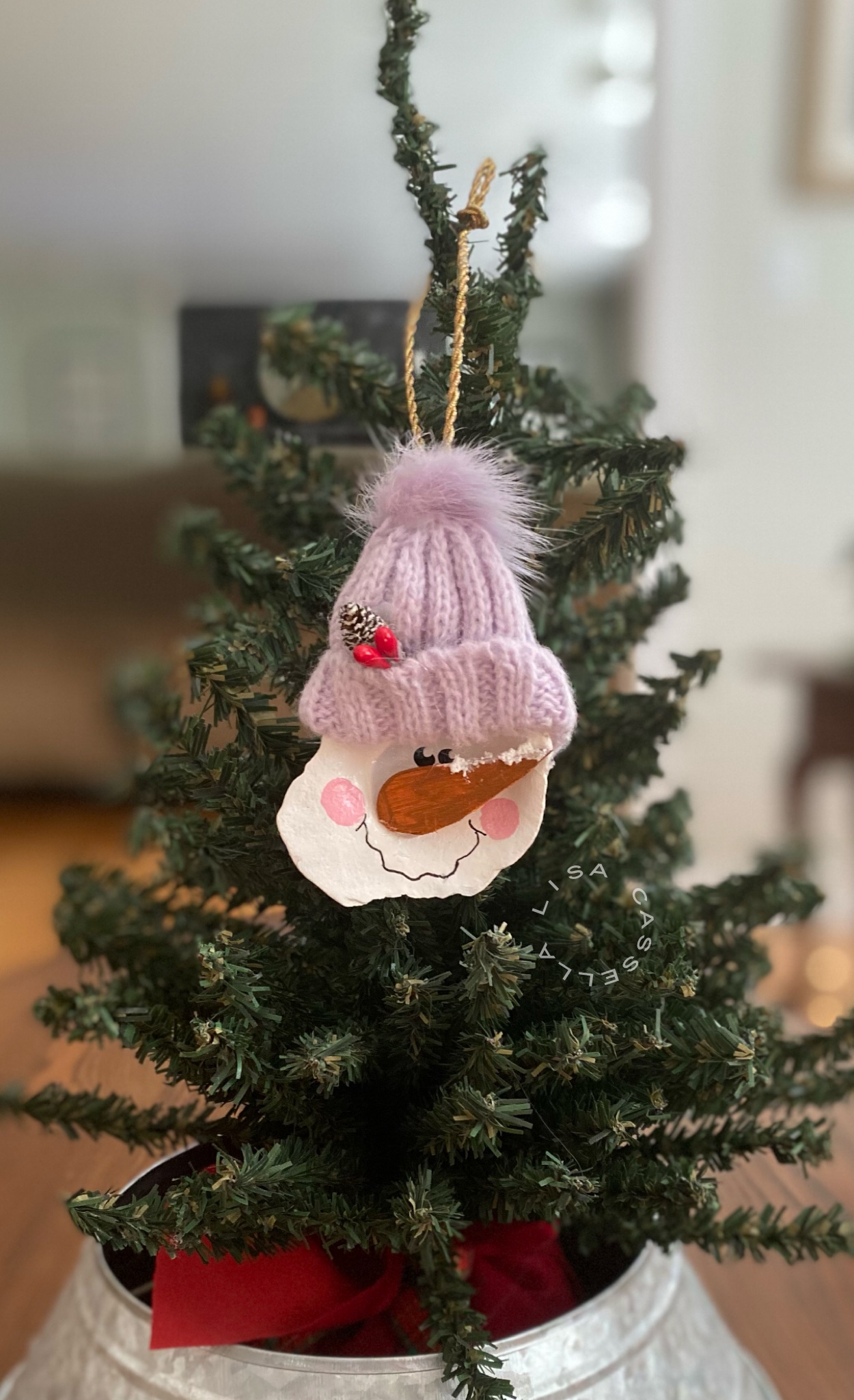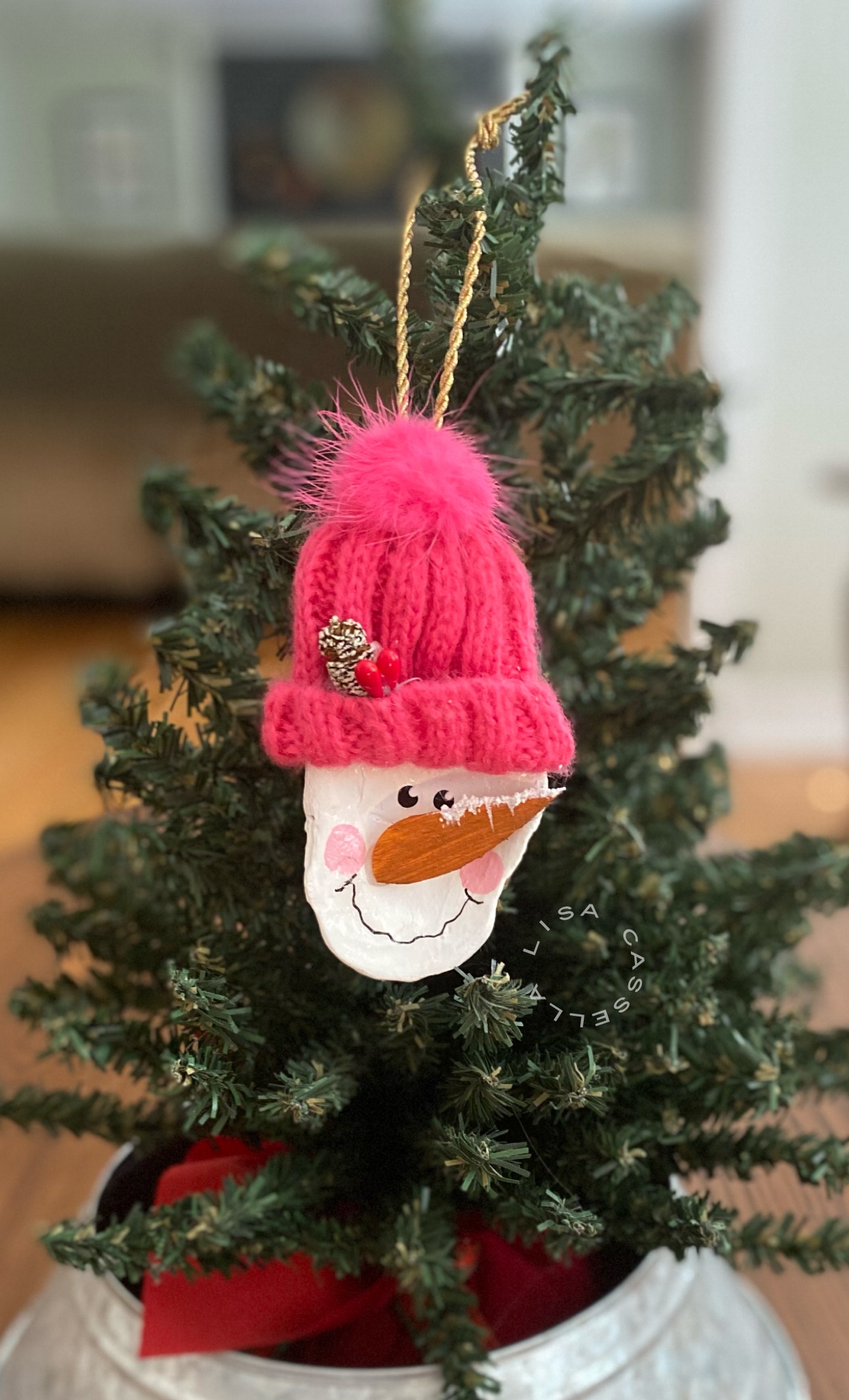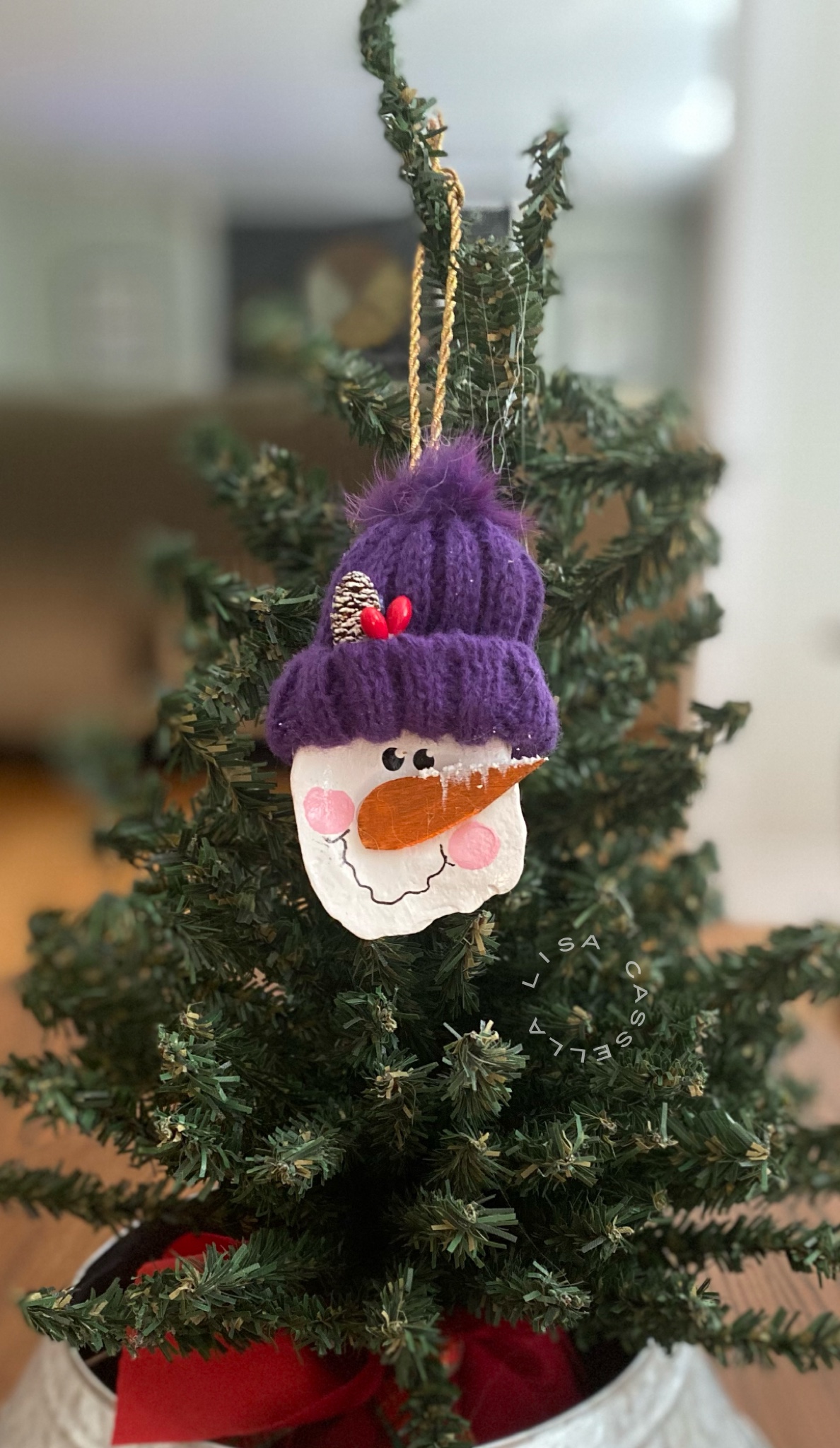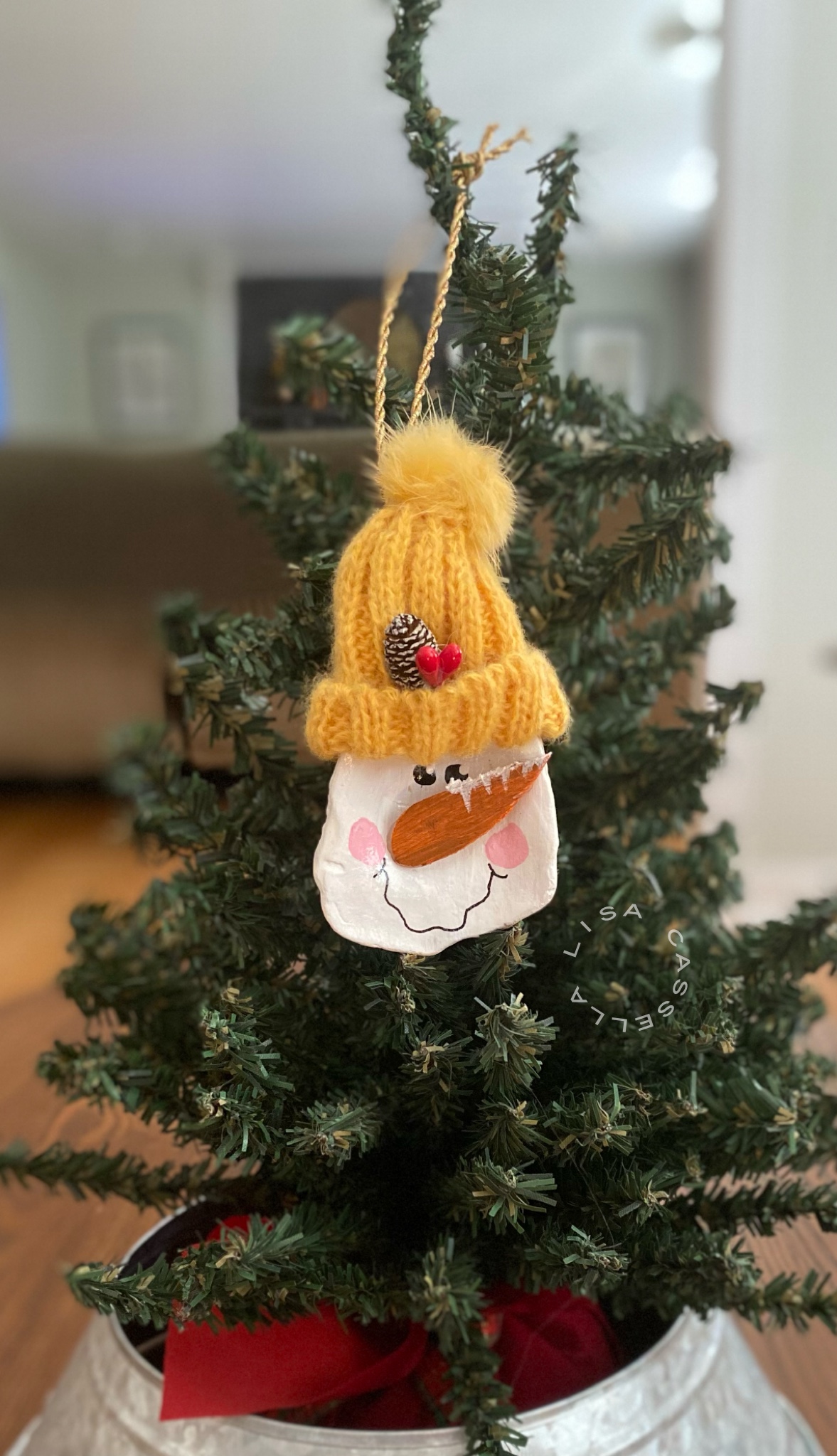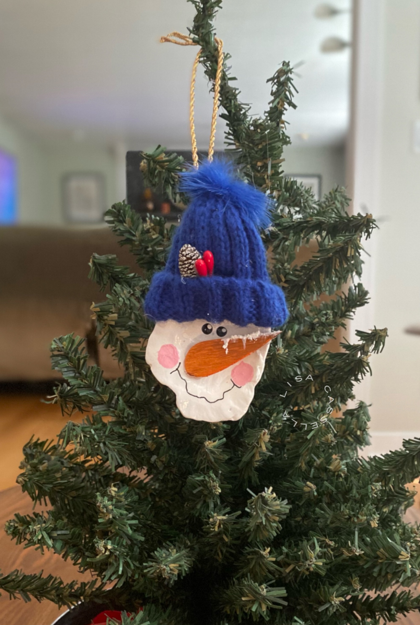 These ornaments are made from oyster shells that we found on a local beach. We then decorated them with adorable winter hats, a wooden carrot nose, and embellishments that completed their look!