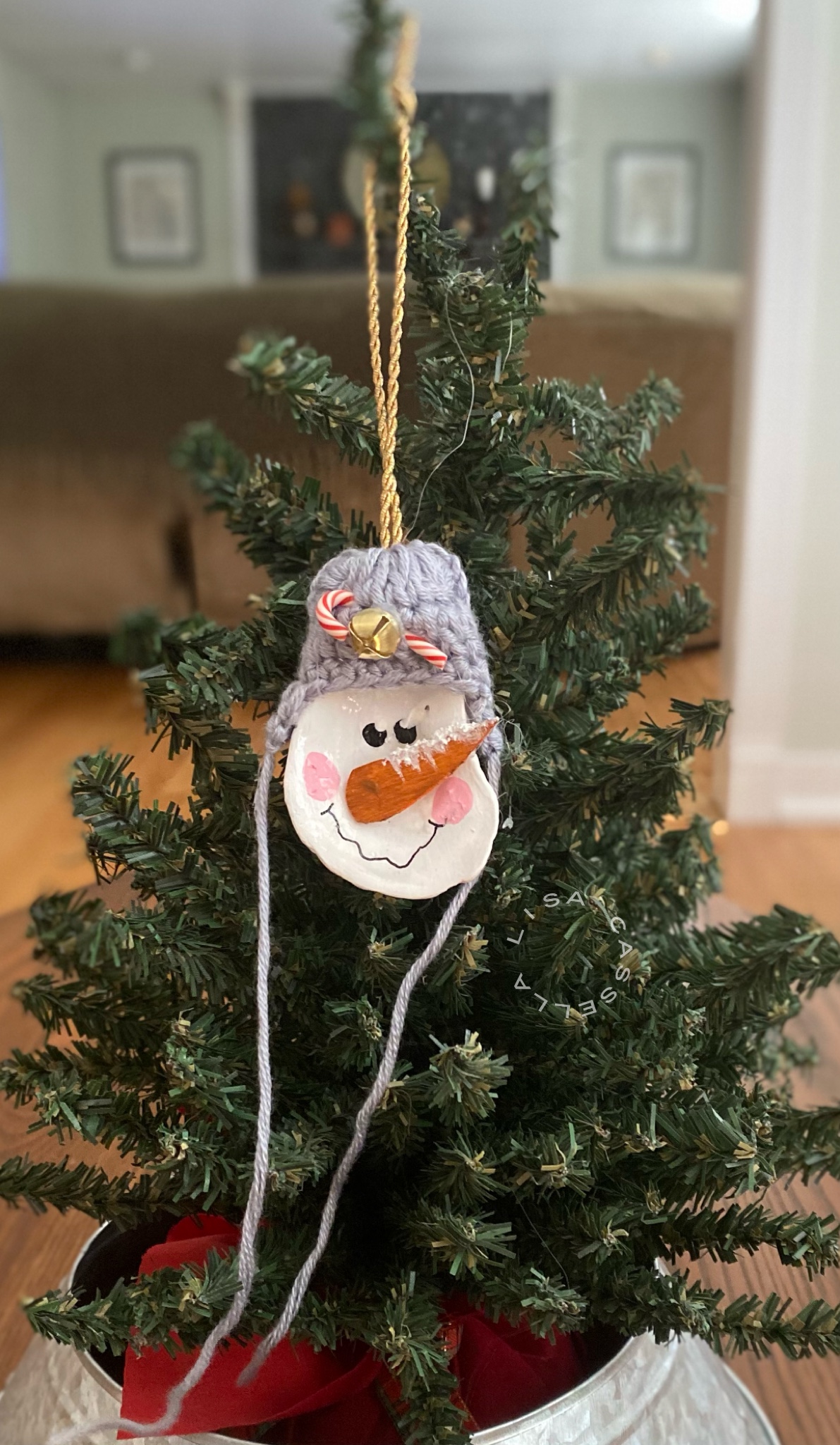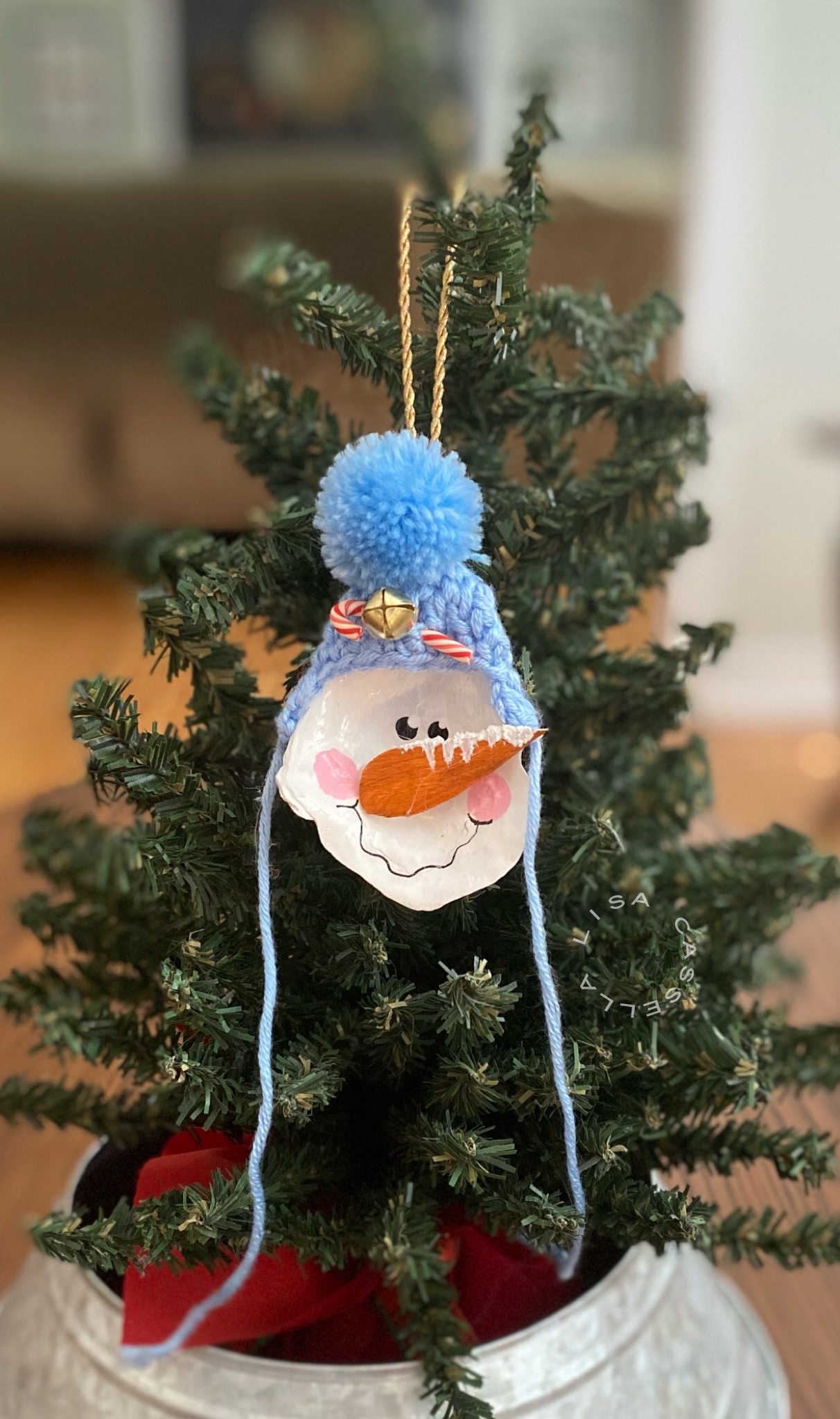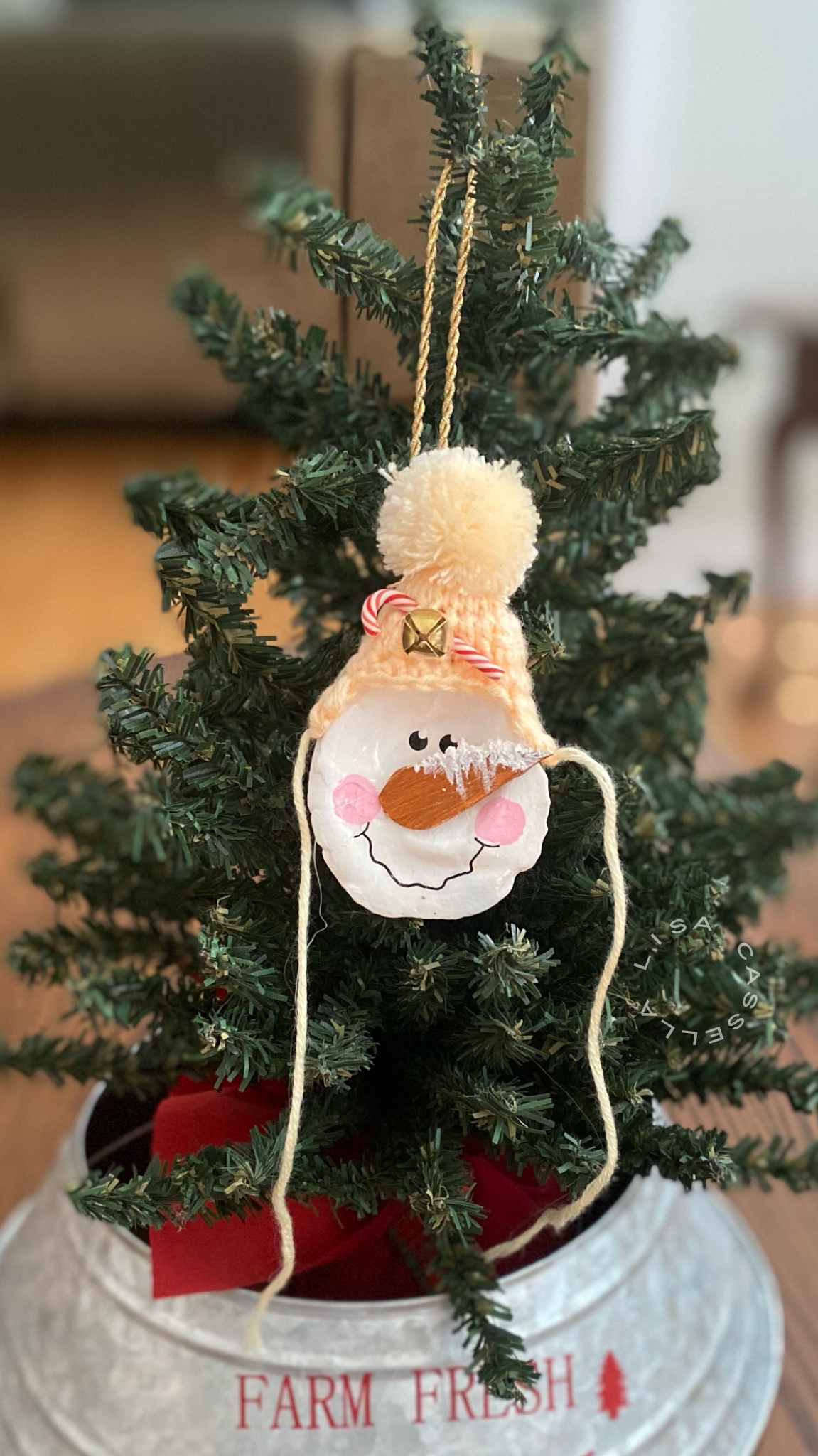 These ornaments are made from oyster shells that we found on a local beach. We then decorated them with adorable winter hats, a wooden carrot nose, and embellishments that completed their look!