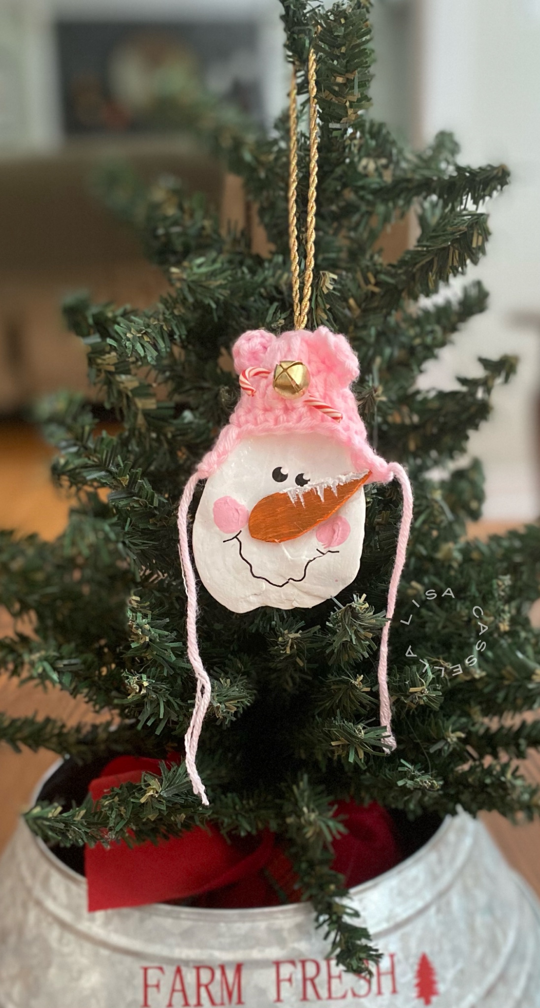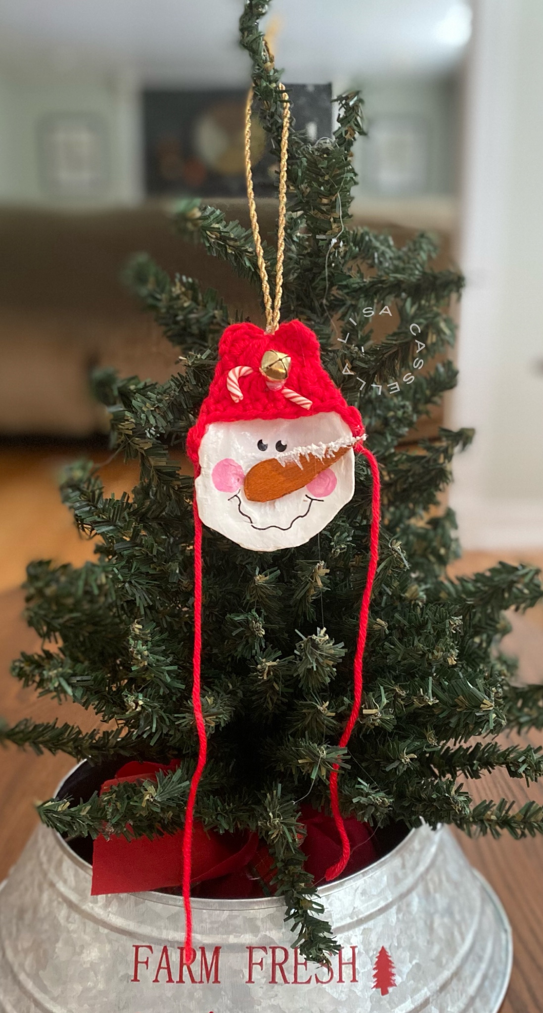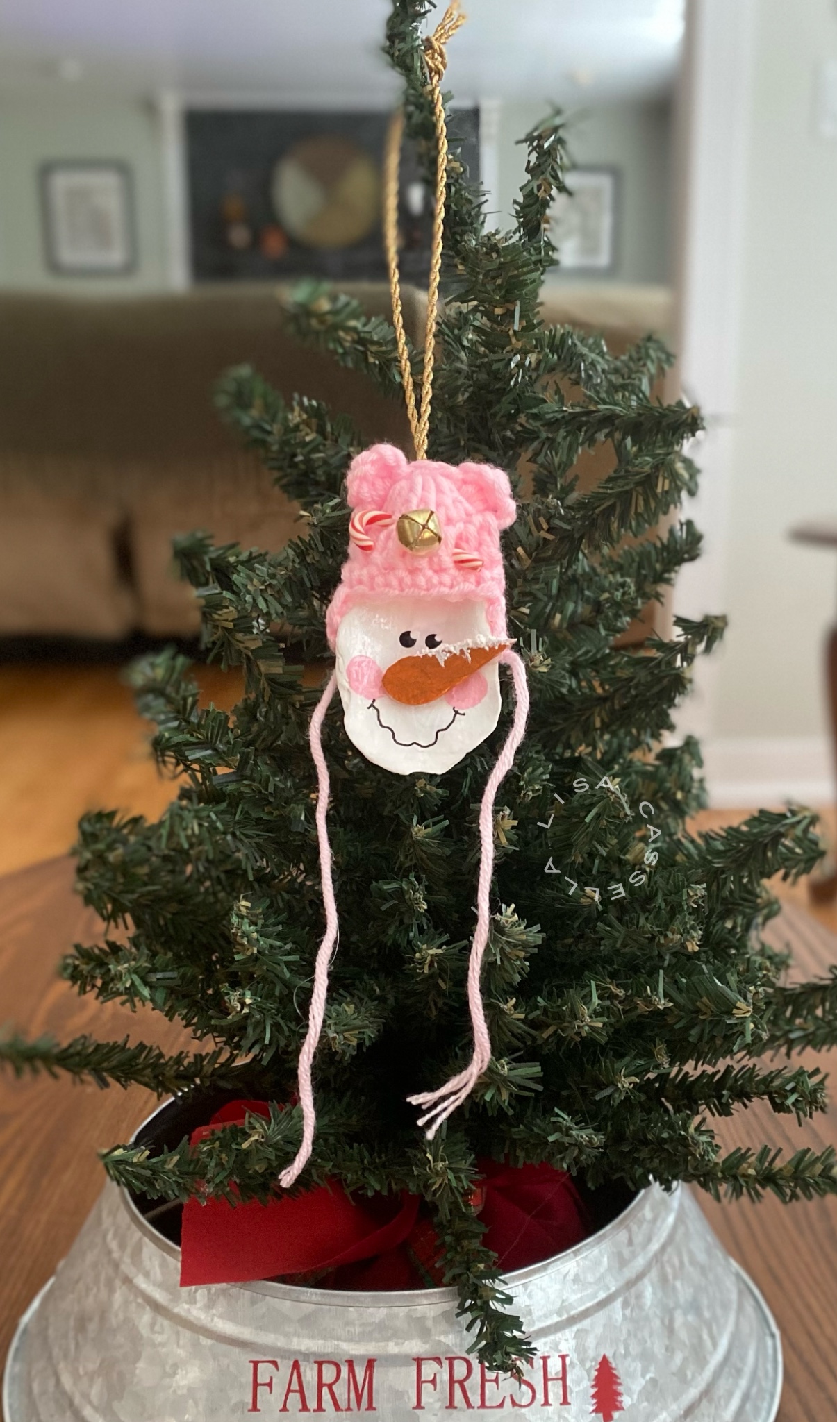 These ornaments are made from oyster shells that we found on a local beach. We then decorated them with adorable winter hats, a wooden carrot nose, and embellishments that completed their look!