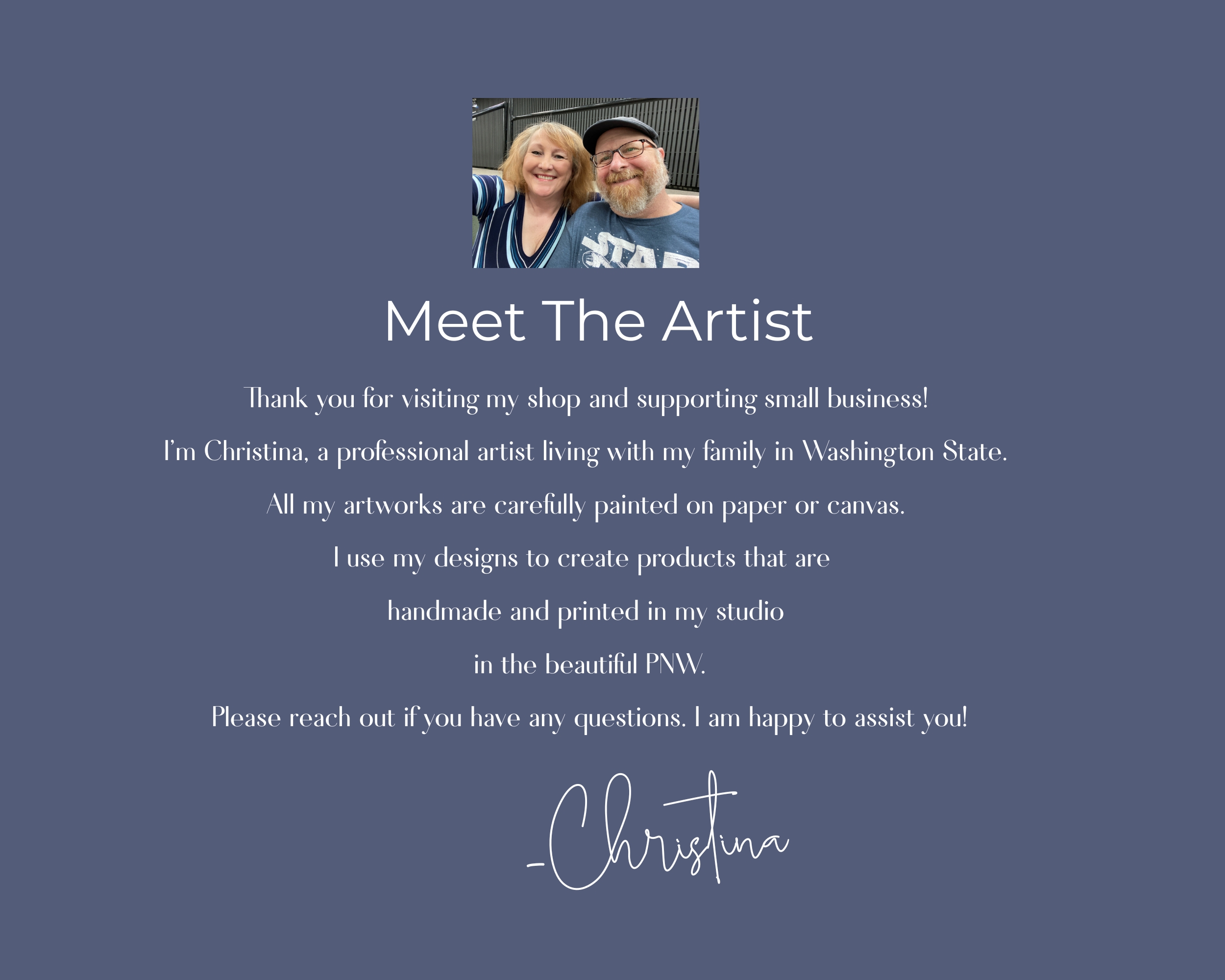 Christina Vilgiate Art is based in both Spokane, Washington, USA and Colorado Springs, Colorado, USA and has been selling watercolor paintings, acrylic paintings and prints on since 2016. She sells in the United States. Christina uses goimagine’s shipping partner to fulfill her orders and further USPS. Christina uses goimagine to host buyers’ personal information.