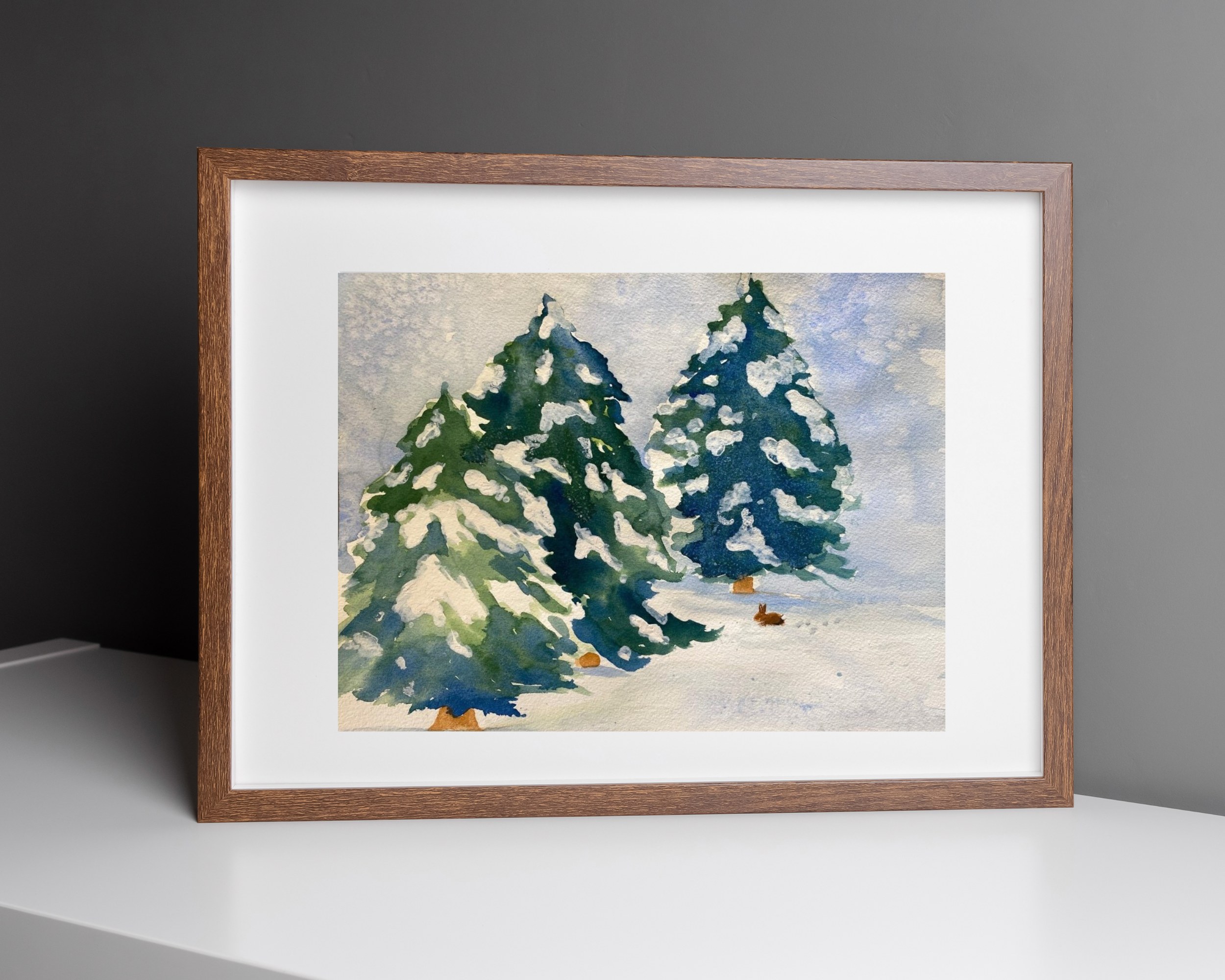 This artwork captures the peacefulness of falling snow and the fun of a rabbit running through the winter landscape. Hang this painting in your home or office and be reminded of rest. Whether you live in the mountains or just wish you did, this watercolor painting is sure to bring feelings of happiness. It makes a perfect gift for nature lovers, art enthusiasts, or anyone who appreciates the magic of forests and mountains.