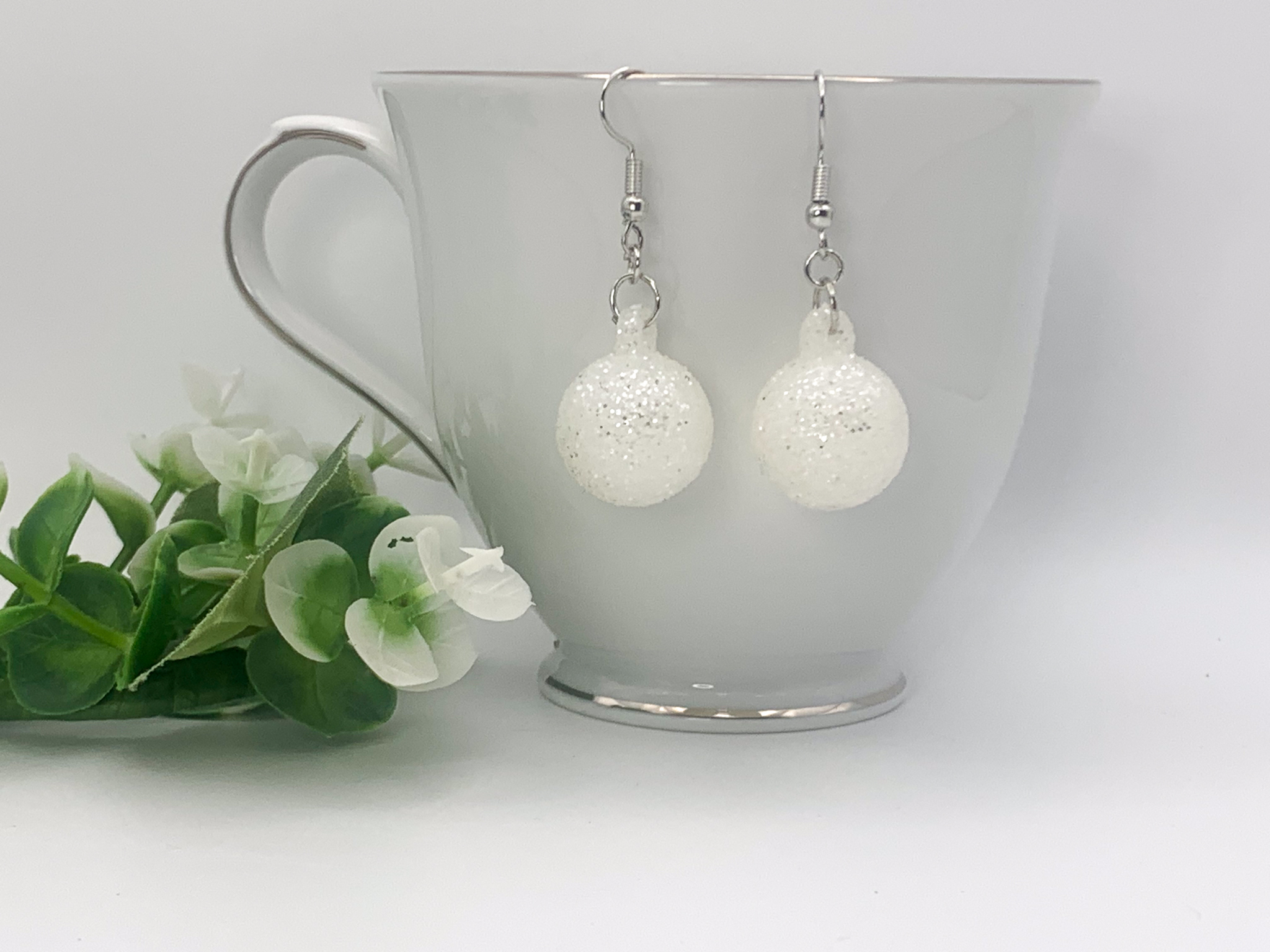 Celebrate the magic of winter with these white glitter ornament earrings! Elegant and festive, they’re perfect for seasonal sparkle.
