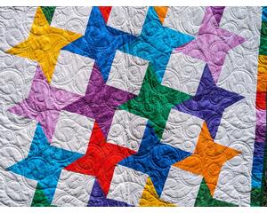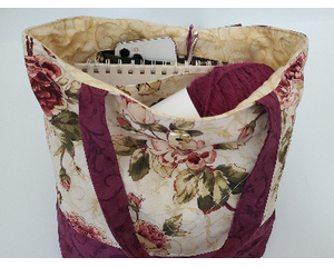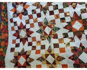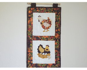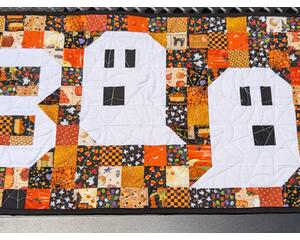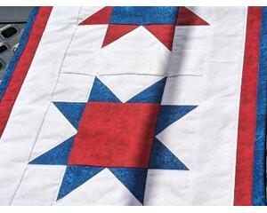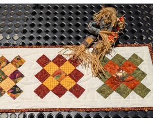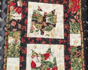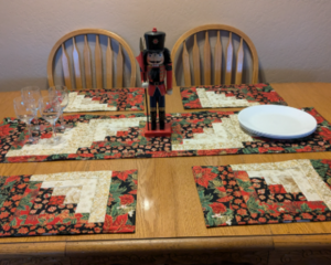 Small table runner with elegant red, green, and black fabric in a chevron pattern.
