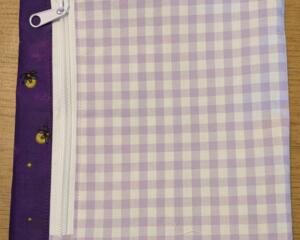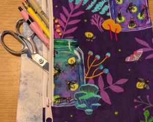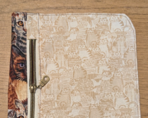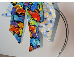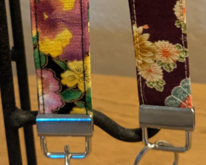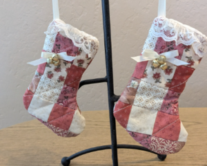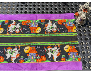 Small table runner with elegant red, green, and black fabric in a chevron pattern.