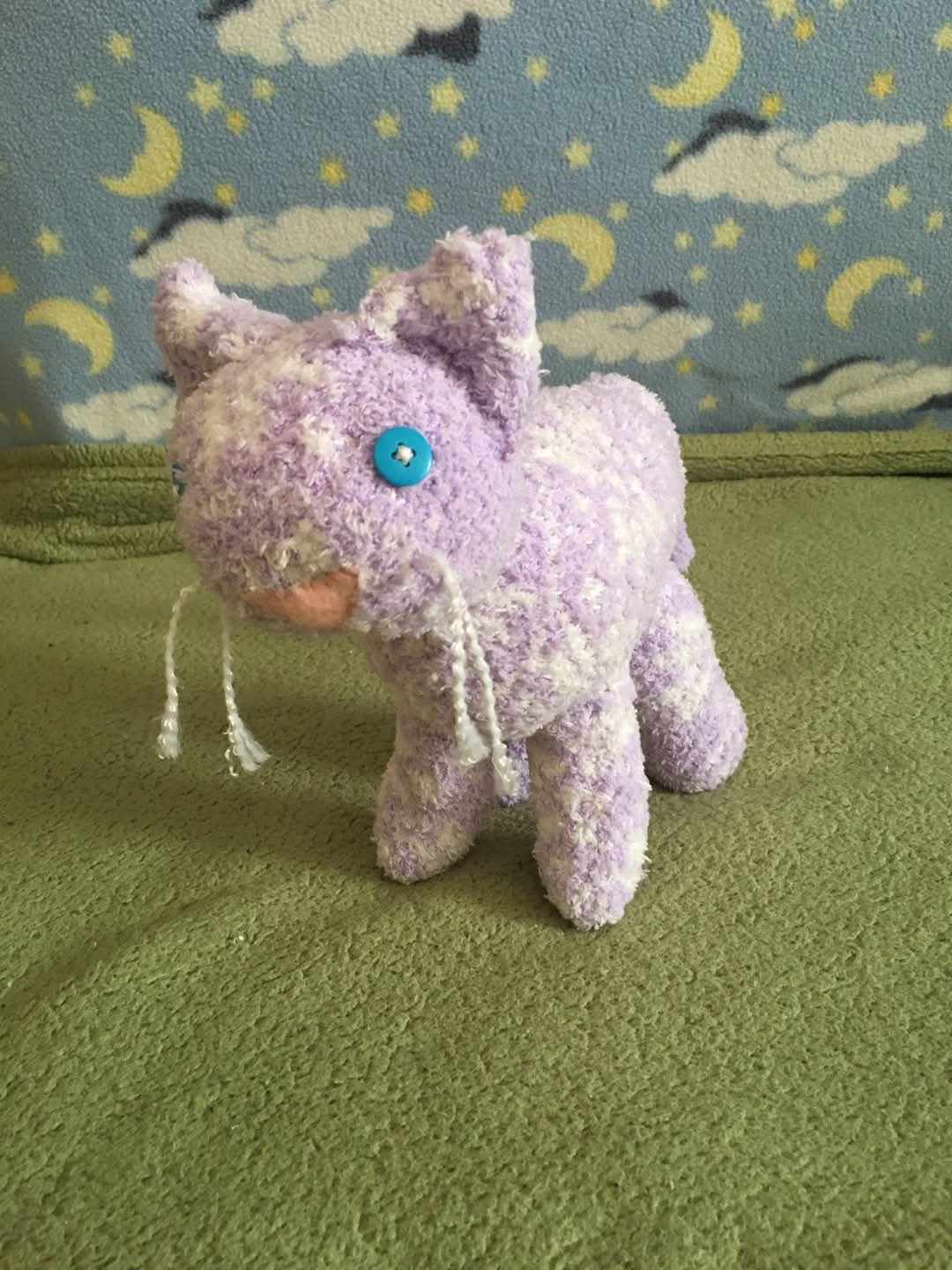 I hand sew every single one of these cats using the fuzziest coziest socks. That's to ensure they're super cuddly. As an option I also offer the flat textured socks if you prefer. I also hand sew on all the details out of fleece or felt or soft fabric to make eyes and the nose. If you'd prefer the old fashioned button look just let me know. I typically don't use them because I often make these for very small children. And I can add a lot of personality to the eyes if I'm using fabric because I also draw them in as well.