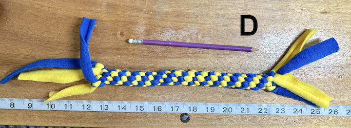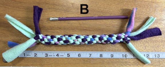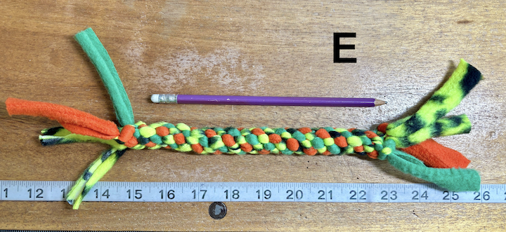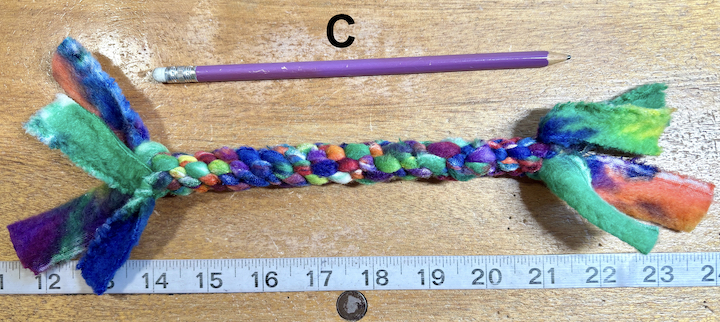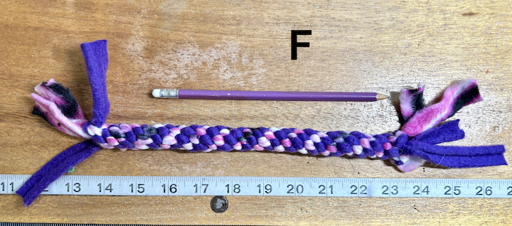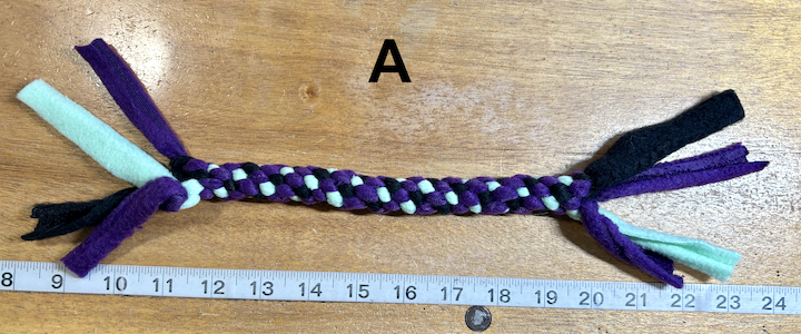 Upcycled - made with leftover soft fleece selvedge edges (new unused fabric) - only, no additions. These are densely knotted, firm but soft tug toys, see photos for approximate measurements, the photos show a standard pencil for scale.