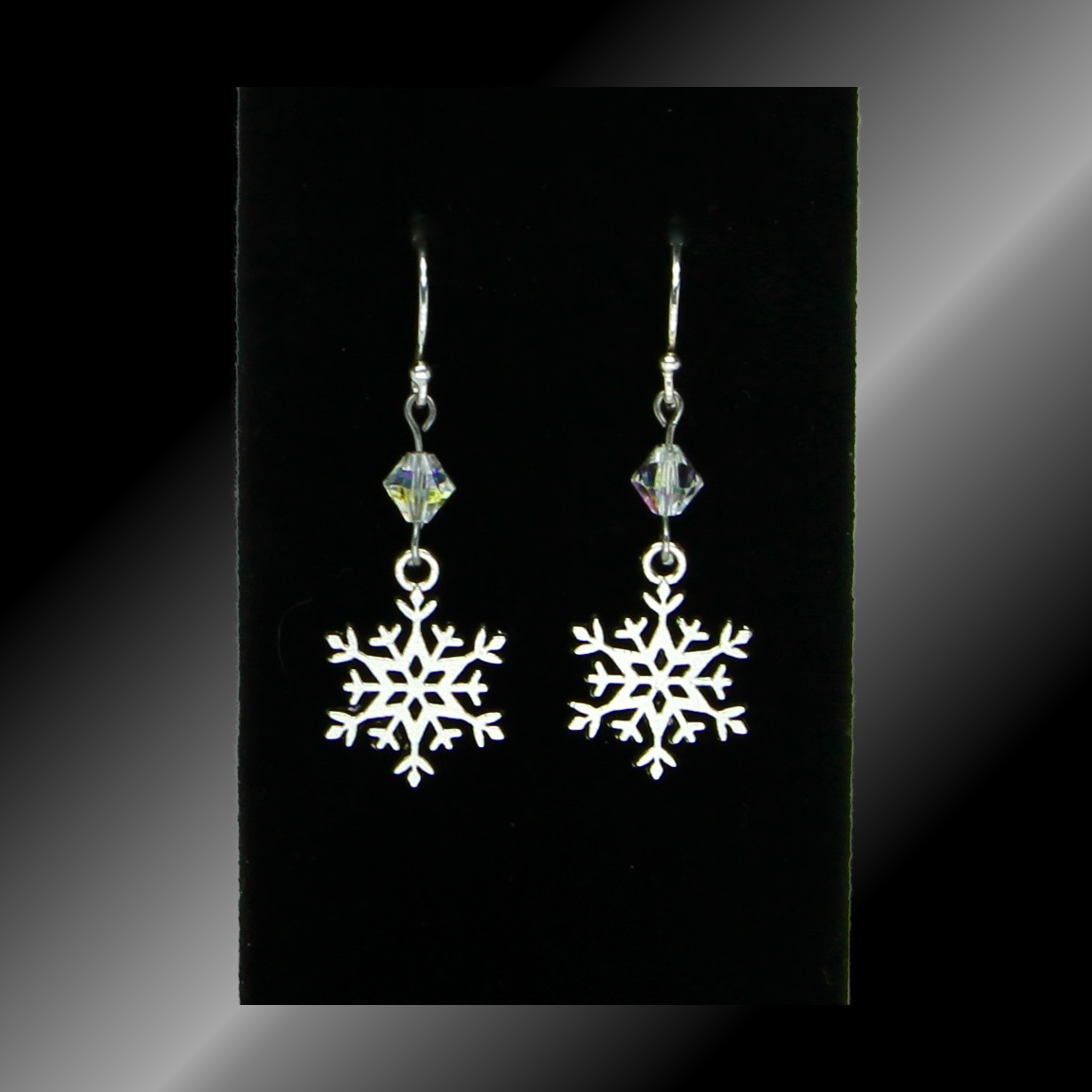 I carefully select my Iridescent European Crystals and Snowflake Charms, then use wire and connectors to assemble everything together. I finish them off with a pair of Solid 925 Sterling Silver ear wires!