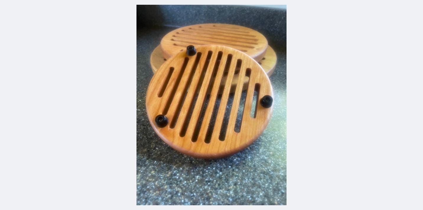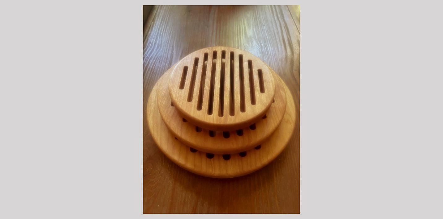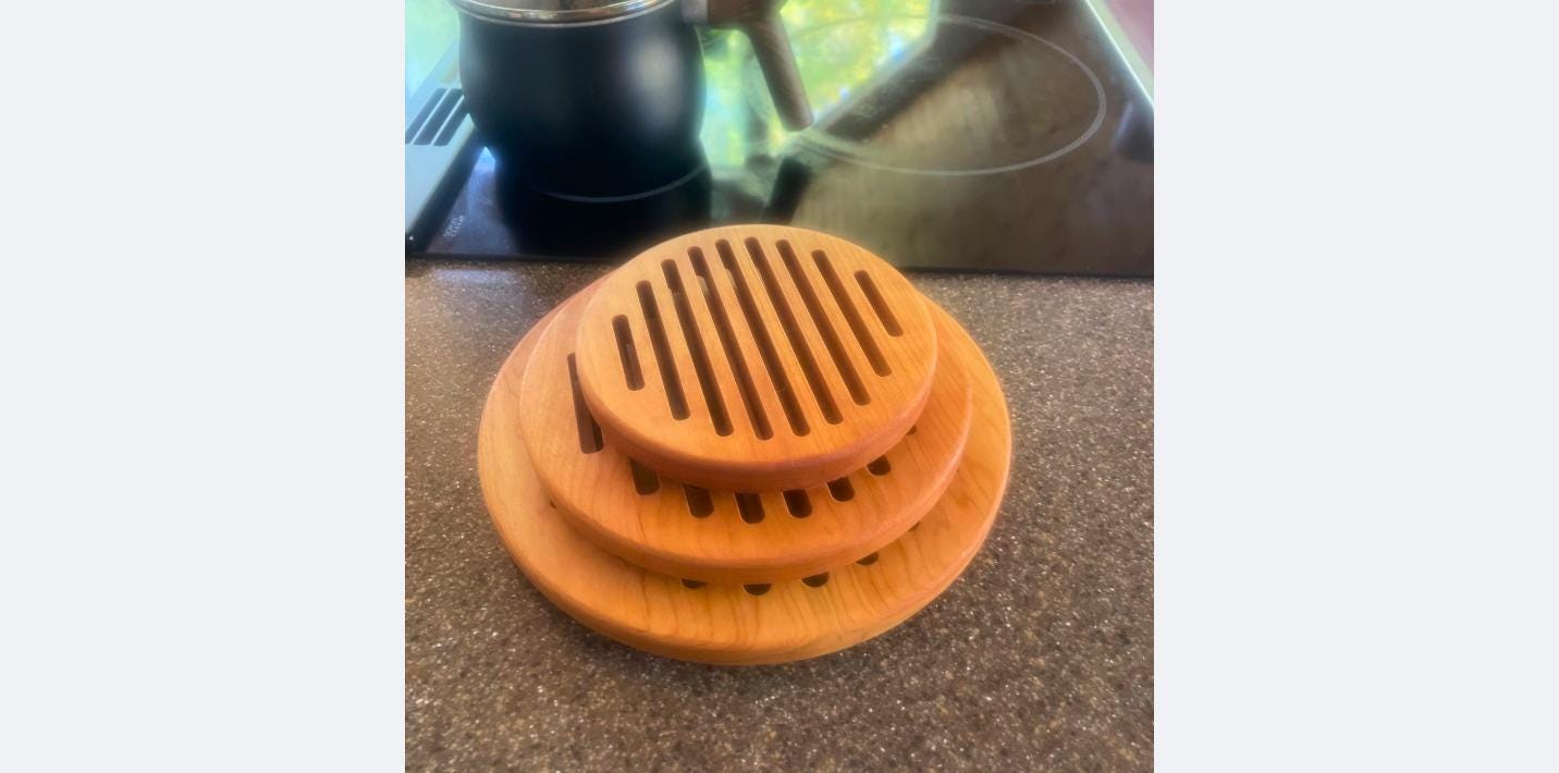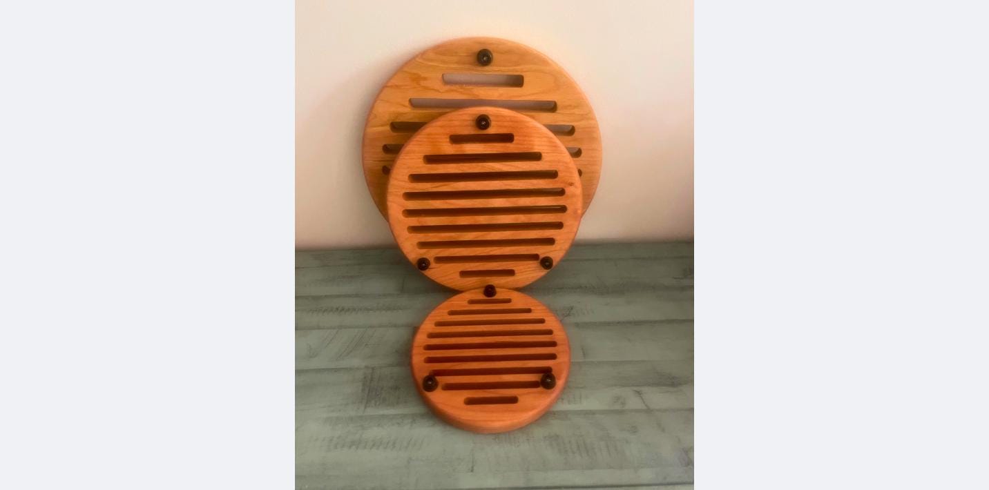 Solid Cherry wood Trivet Sets ready to use right out of the box. Set comes with 3 sizes of solid Cherry Trivets. (small is 6. inches, medium is 8.5 inches, Large is 10.5 inches) Each trivet has 3 rubber ft. with stainless steel screws to attach to the trivets. These are made in the USA and shipping is free! Order today for use on Thanksgiving or get a Xmas set for your favorite cook!
