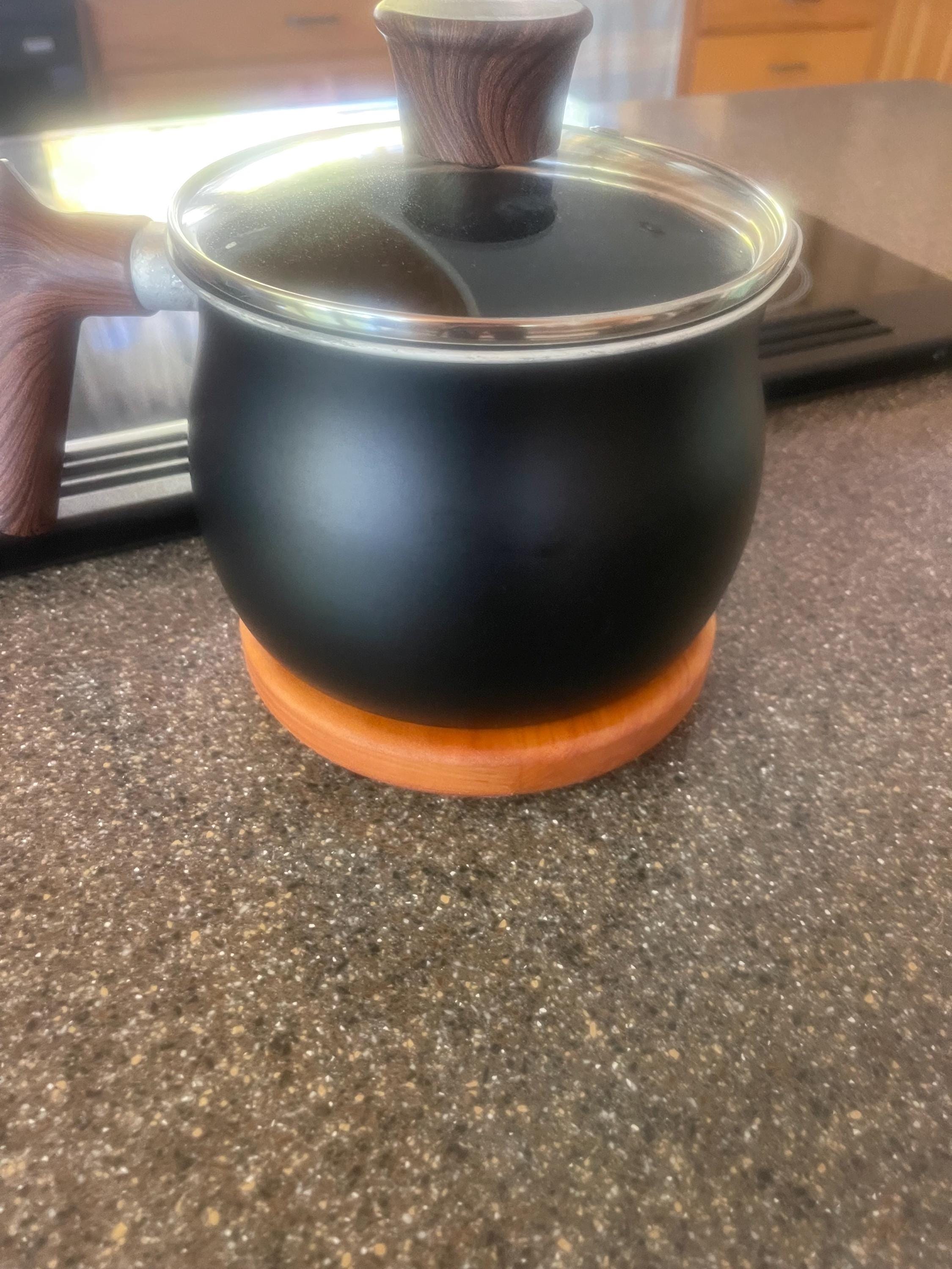 These are made from scratch using solid hardwood (cherry) and finished with a food safe oil. Each trivet has 3 rubber feet to avoid slippage on a countertop when being used.