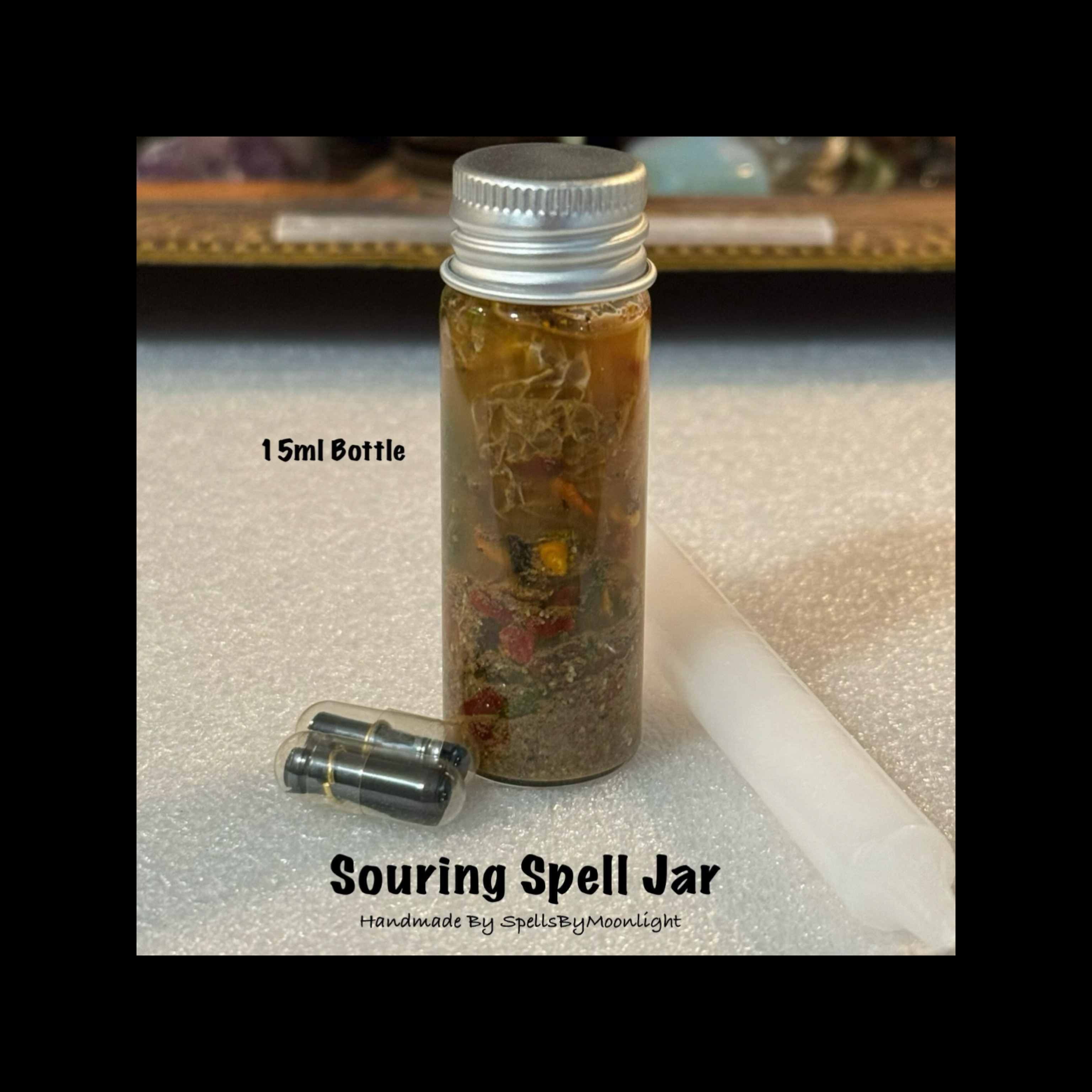 I created this Souring Spell Jar to make others lives turn sour! It can be used for: Removing someone from your life, Causing Chaos in someones life, Return To Sender, Karma Spells, Hexing, Banishing, Cursing, Jinxing, Break ups, and breaking connections. this is a 15ml Glass Jar that contains: Graveyard Dirt, Vinegar, Hot Pepper Flakes, Rusty Nails, Moss, Rattlesnake Skin, Cayenne Pepper Powder, and Black Pepper! **you write up to 3 peoples names and your intentions on the included scrolls inside the capsules, Put the scrolls in the Jar, replace the lid and use the candle to seal the Jar with wax. After the wax dries shake it while speaking your intentions. You can put it in the freezer, a cabinet, on your altar, or bury it.