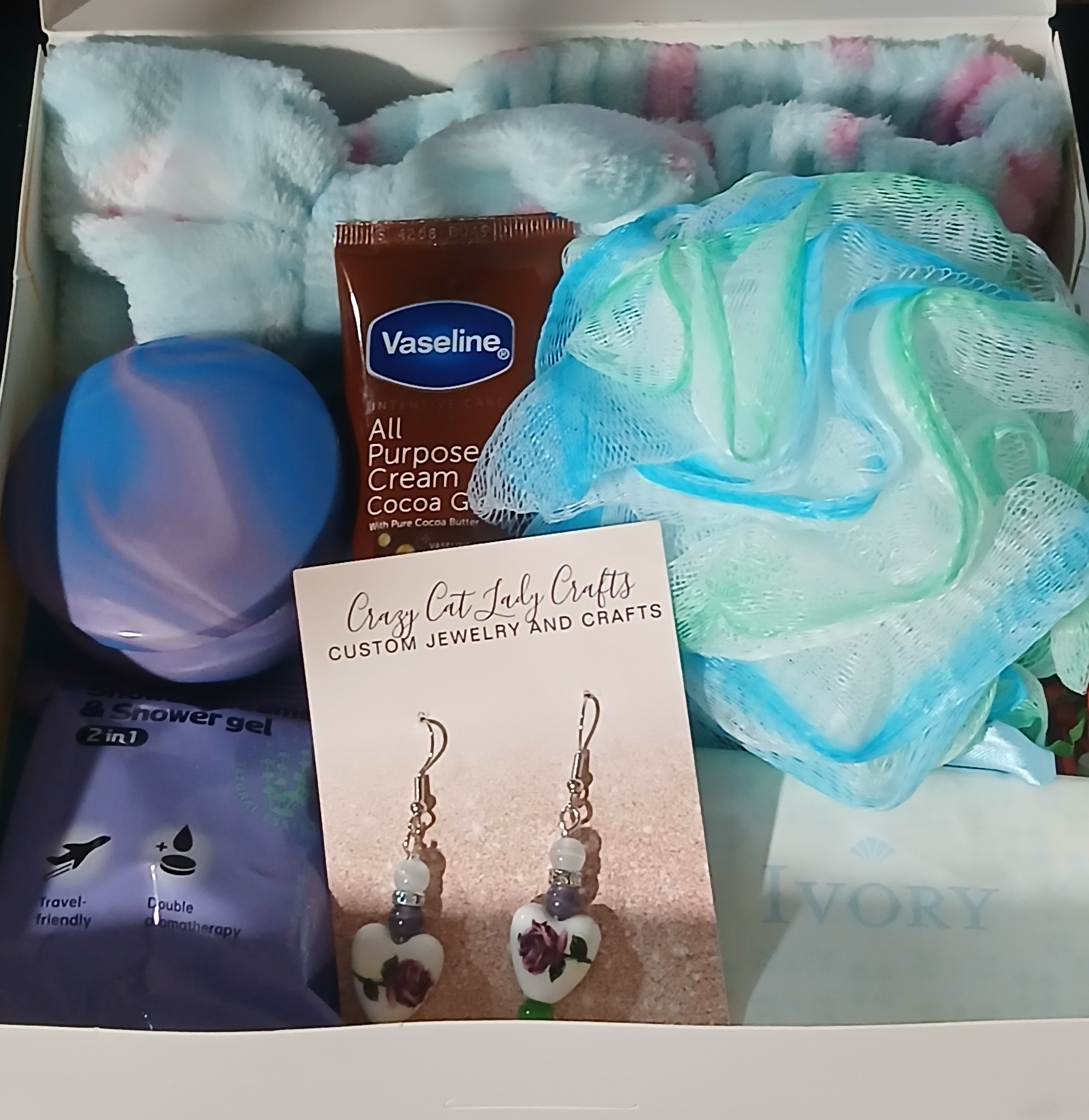 Your Mother or any woman in your life will love this spa in a box, In this box is a spa is a spa headband loofa bar of soap single shower gel and shower steamer both same scent in auromatherapy tube of lotion pair of earrings and a bag to carry it all in