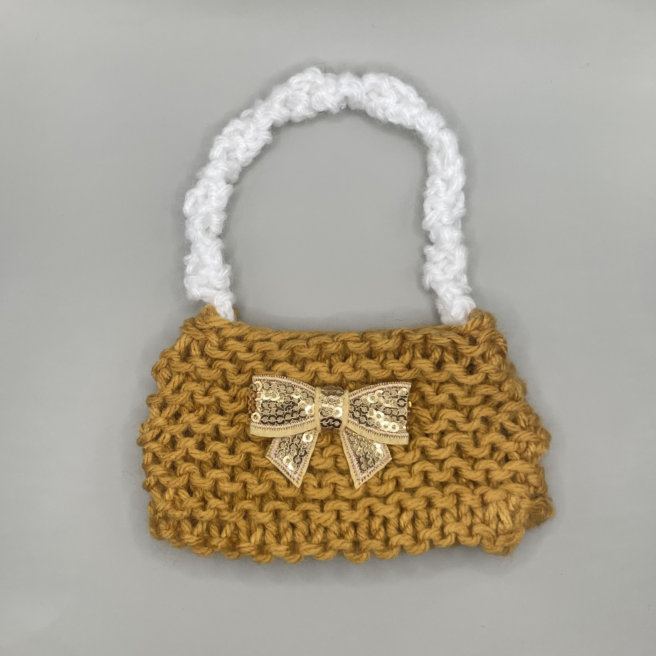 First, I always choose a yarn color that “speaks to me.” Next comes hand knitting the base of the bag followed by adding a strap - also hand knitted. The last step (my favorite) is adding the embellishment! Through the process I imagine the child receiving this doll accessory, or the person receiving a gift card/cash stashed in yarn! That always puts a big smile on my face especially at Christmas. Enjoy❣️