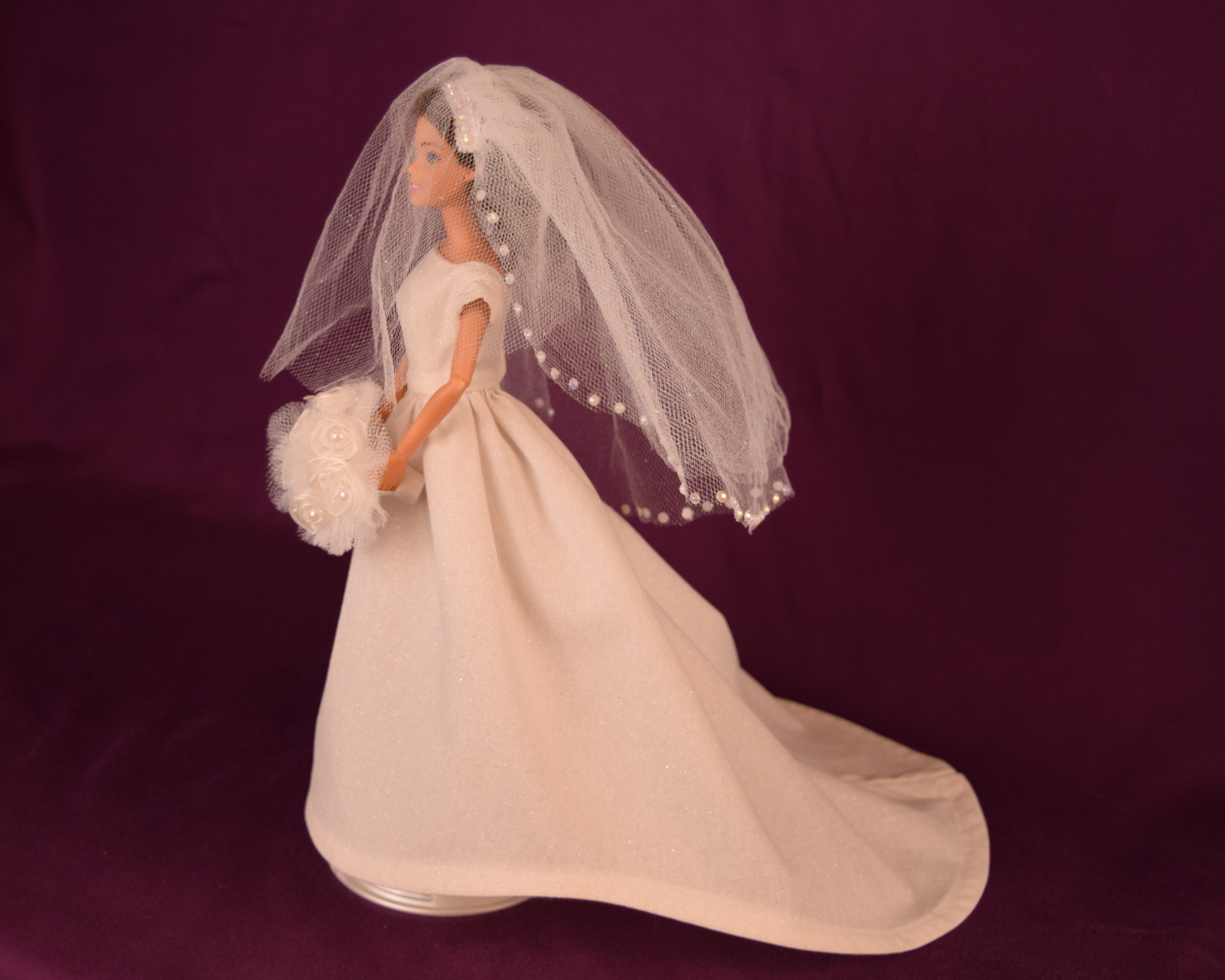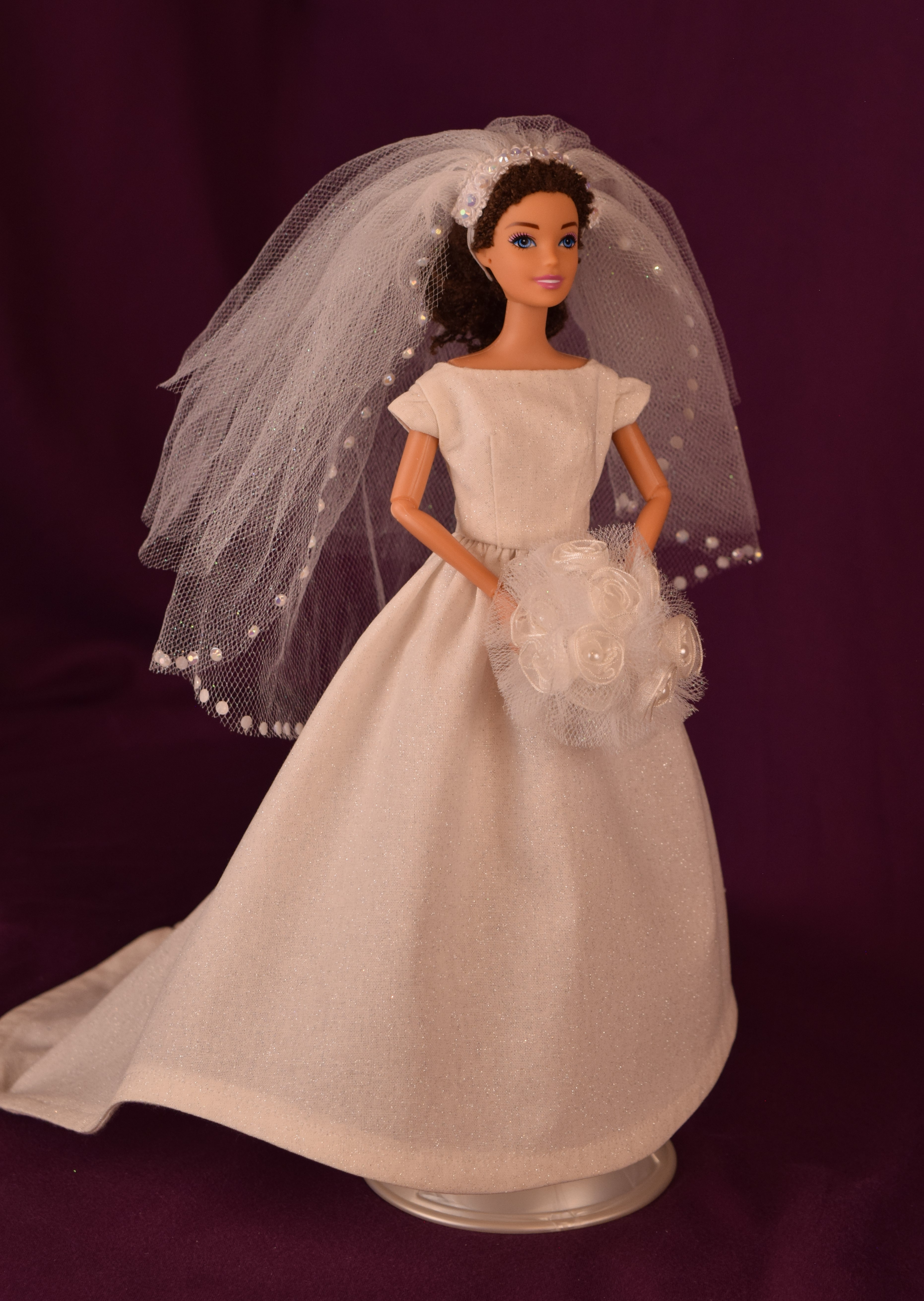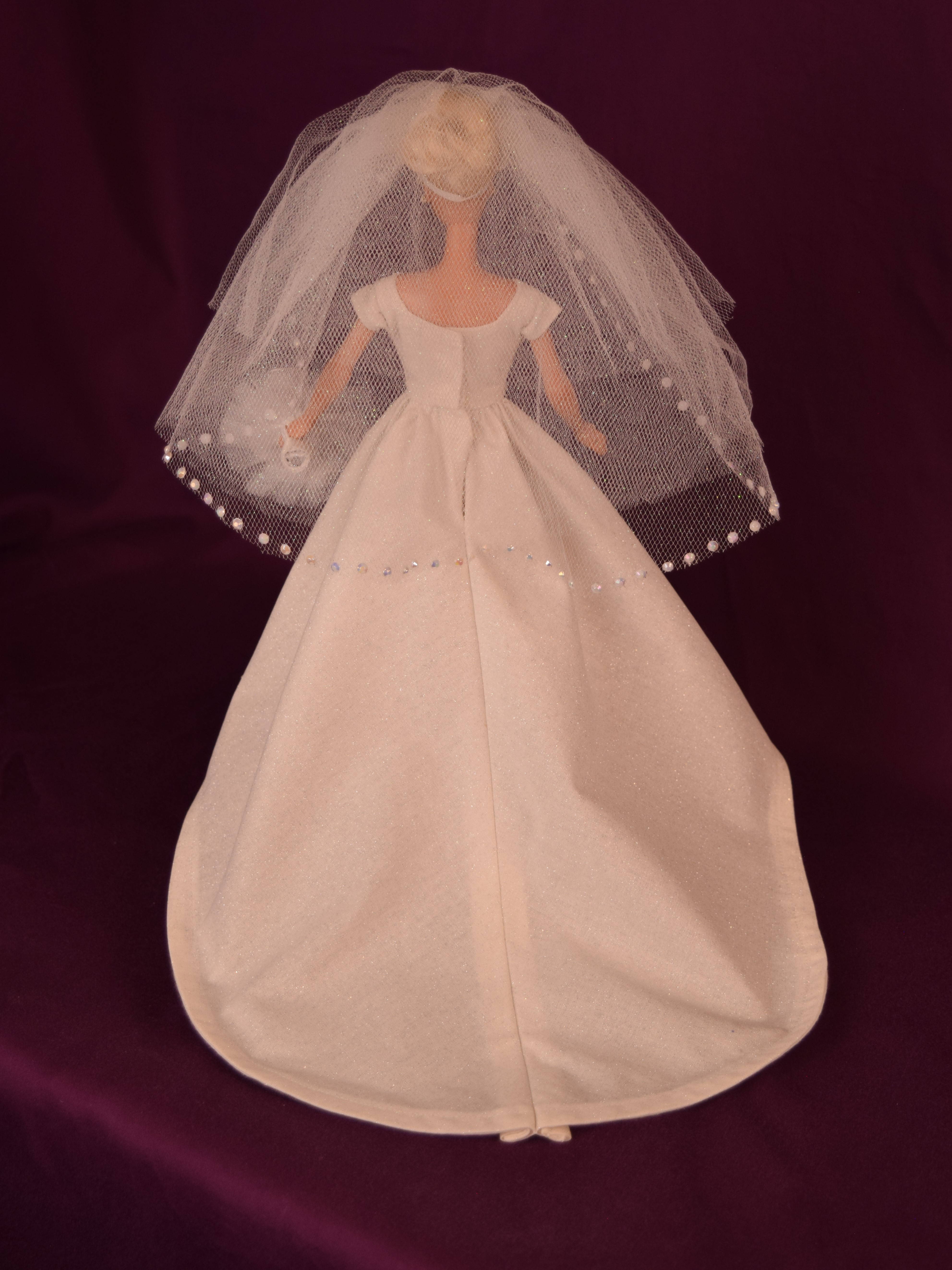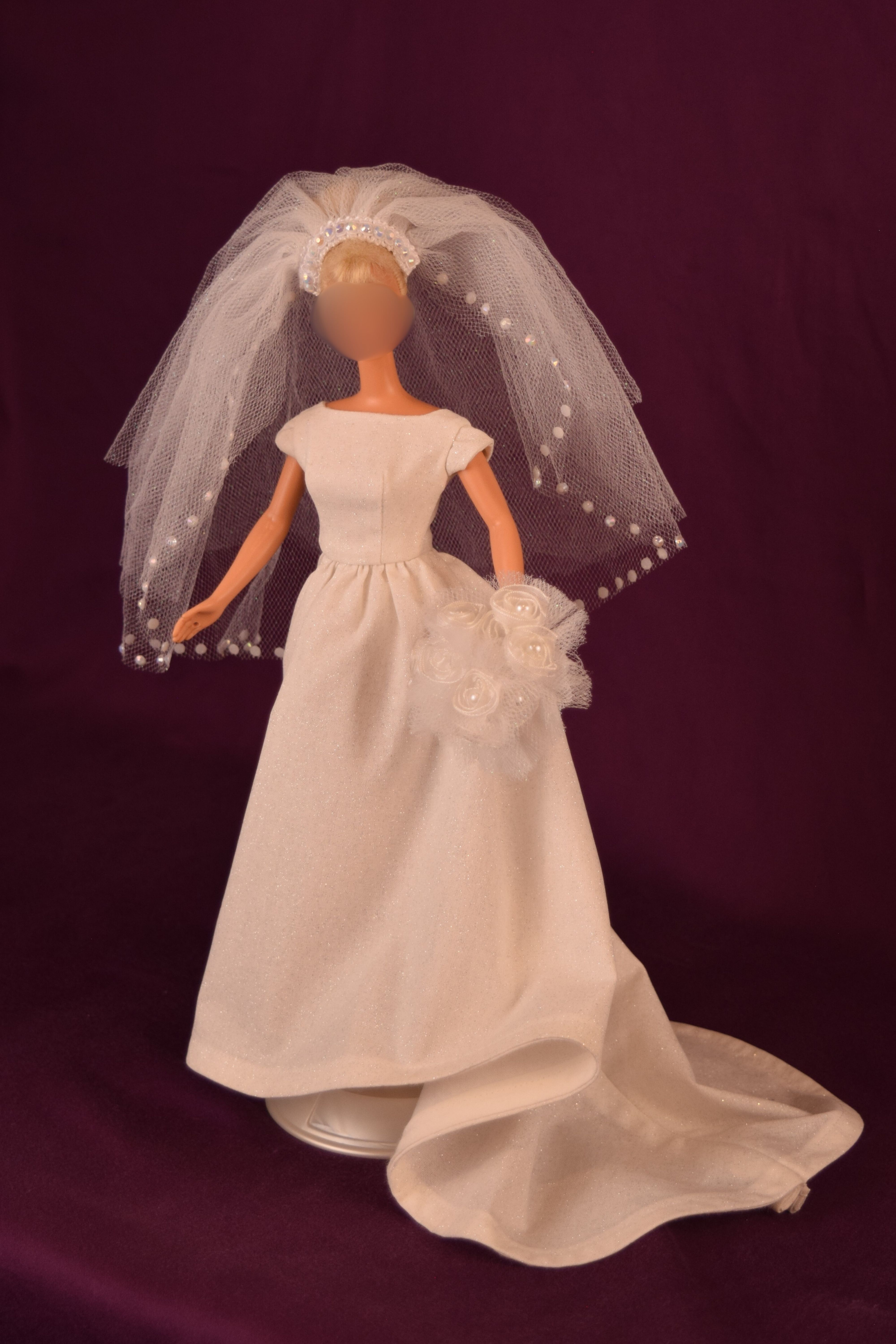 This wedding dress was made to reflect the elegant, refined, and classic side of wedding dresses-think Audrey Hepburn and Grace Kelly. Made from an ivory sparkle cotton fabric, this dress features cap sleeves and a simple plain bodice with a bateau neckline. The skirt is full and extends down into a cathedral wedding train. The fingertip length veil, made from sparkly tulle, is in the bouffant style and has three layers with the last layer featuring white little gemstones that are glued on. The front layer can be pulled over the top to create a blusher . The jeweled headband is attached to the veil. The round bouquet is made from sparkly tulle and ten white ribbon flowers with seed pearl middles. The stems are covered in white satin ribbon, and there is an elastic piece to slide your doll's hand in.