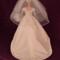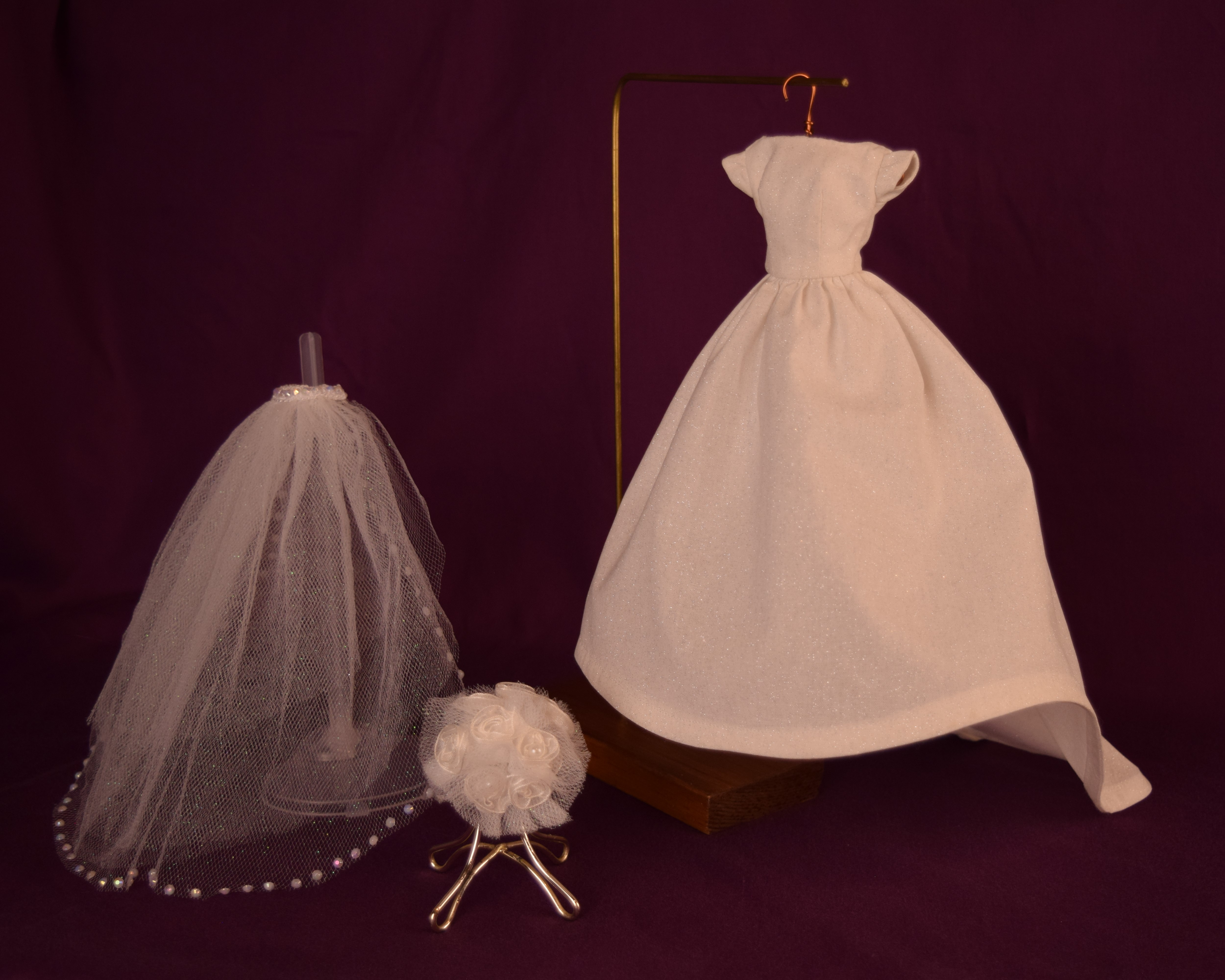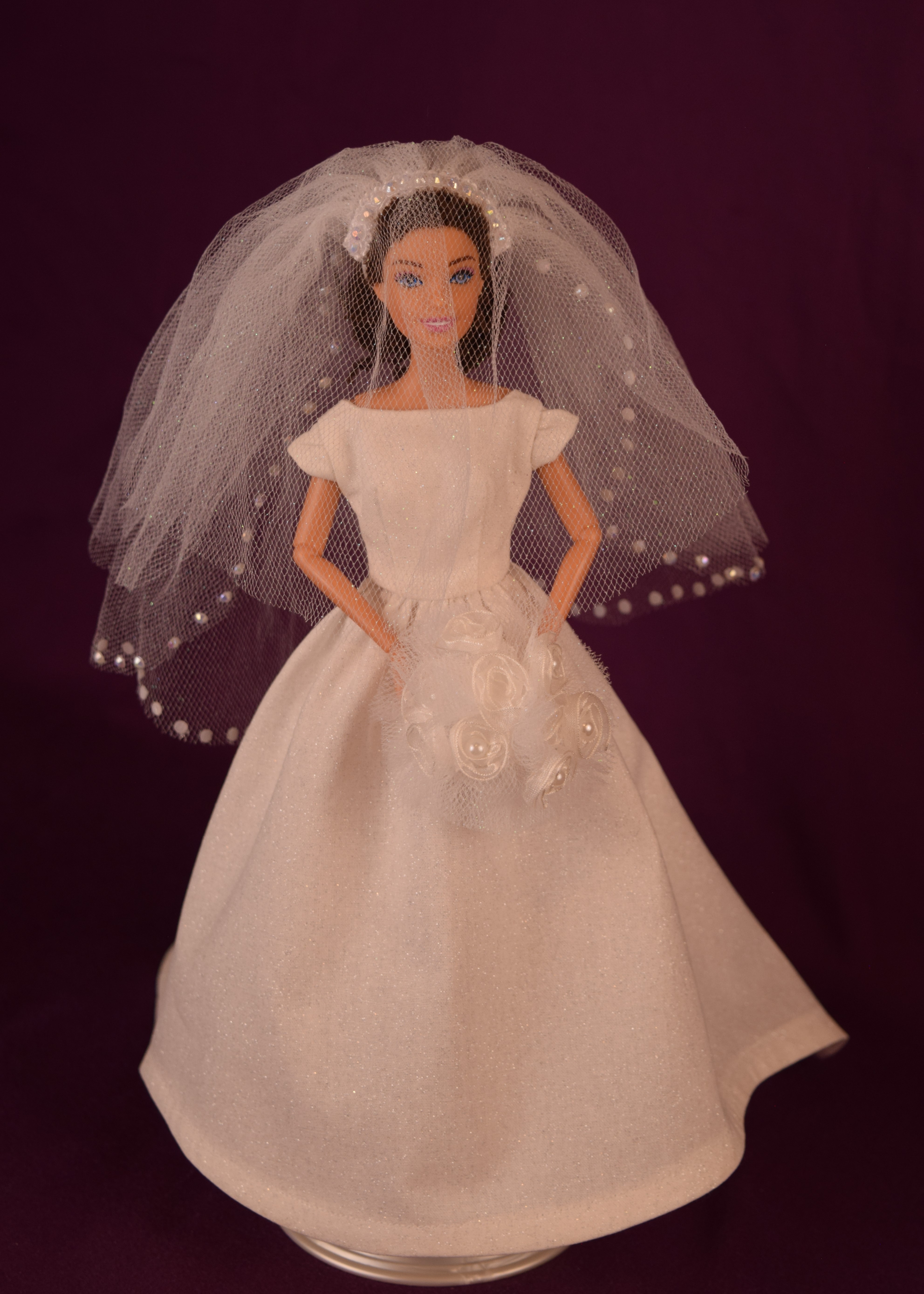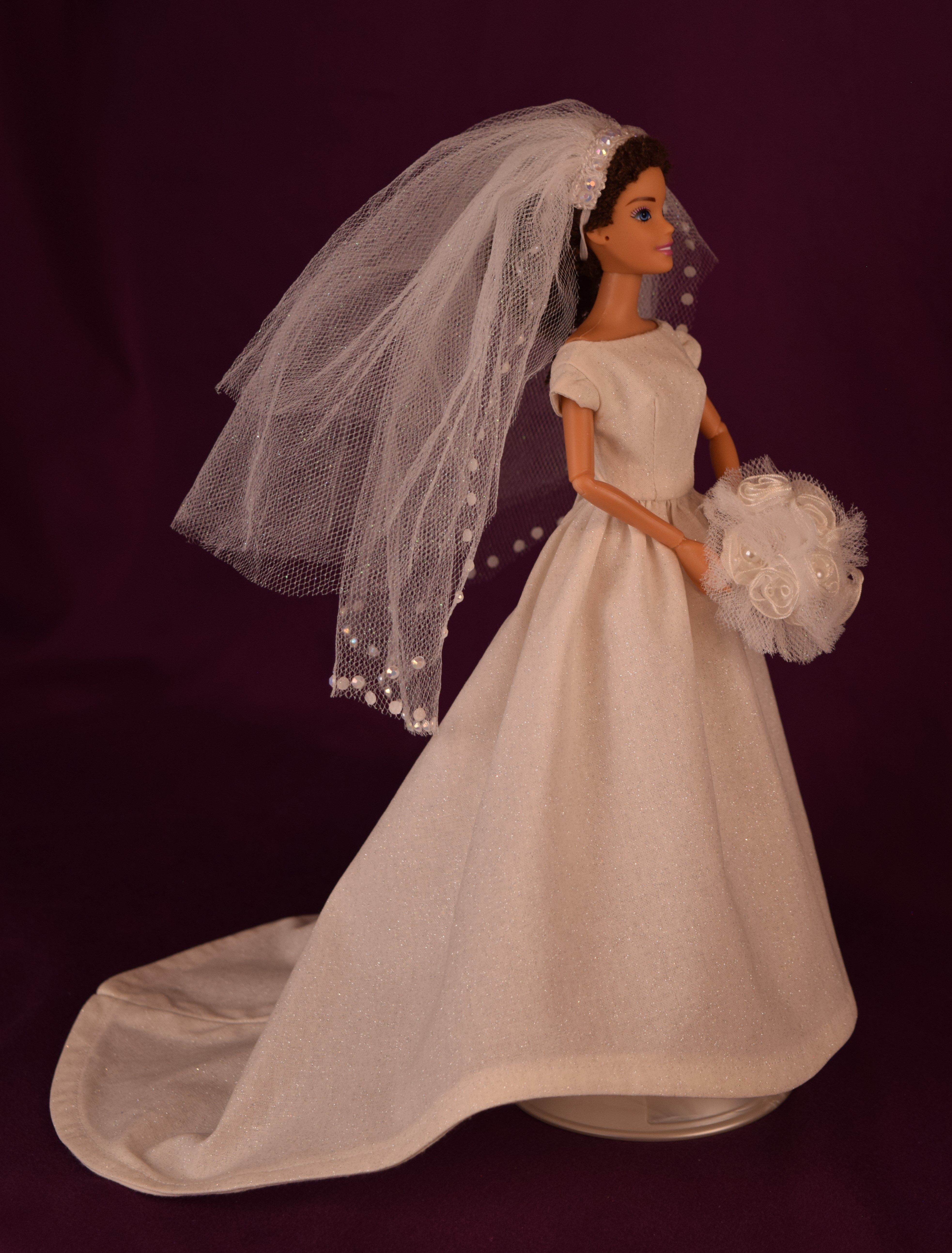 This wedding dress was made to reflect the elegant, refined, and classic side of wedding dresses-think Audrey Hepburn and Grace Kelly. Made from an ivory sparkle cotton fabric, this dress features cap sleeves and a simple plain bodice with a bateau neckline. The skirt is full and extends down into a cathedral wedding train. The fingertip length veil, made from sparkly tulle, is in the bouffant style and has three layers with the last layer featuring white little gemstones that are glued on. The front layer can be pulled over the top to create a blusher . The jeweled headband is attached to the veil. The round bouquet is made from sparkly tulle and ten white ribbon flowers with seed pearl middles. The stems are covered in white satin ribbon, and there is an elastic piece to slide your doll's hand in.
