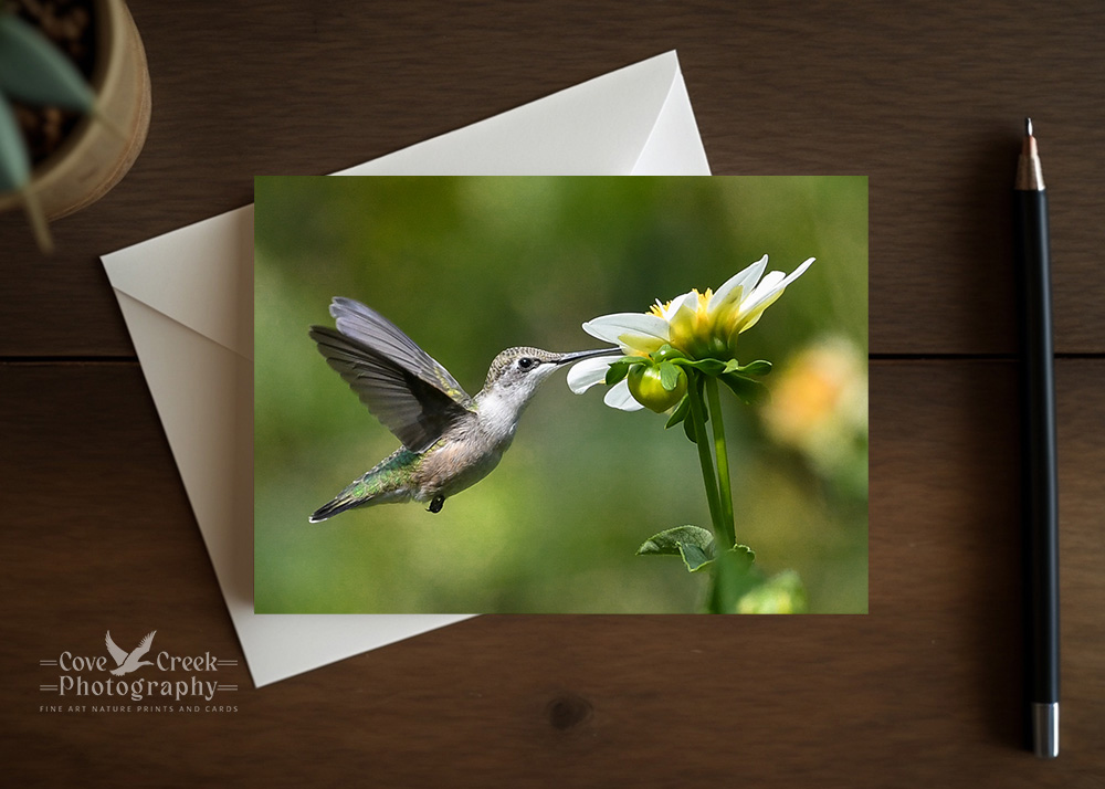Fine photography of a hummingbird in a dahlia garden is on the front of this blank, folding greeting card that can be used for any holiday or special occasionl Simply write or print your personal message on the inside. Card photography is suitable for framing, too! The card is offered in quantities of 1, 3 or 5 with white envelopes, but if you need quantities other than this, please feel free to contact me, and I will gladly accomodate your order.