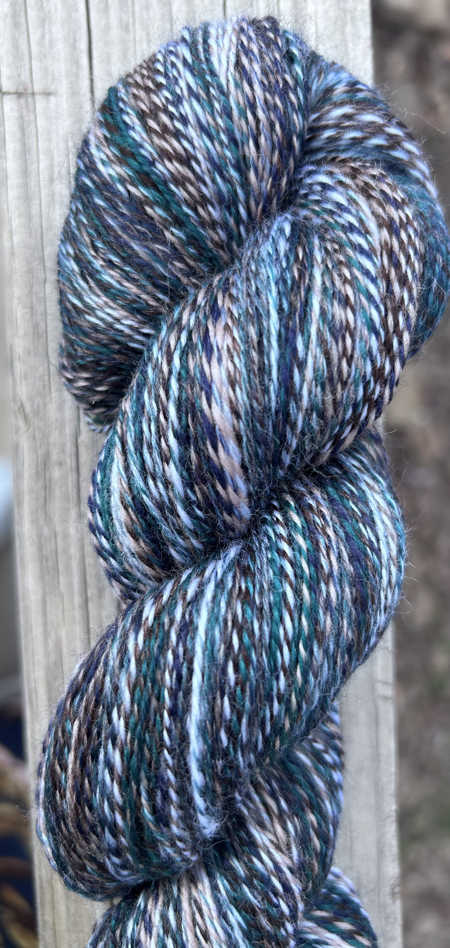 A hand-blended, hand-spun 100% merino yarn in a fingering weight. Total final yardage is 484 yards.