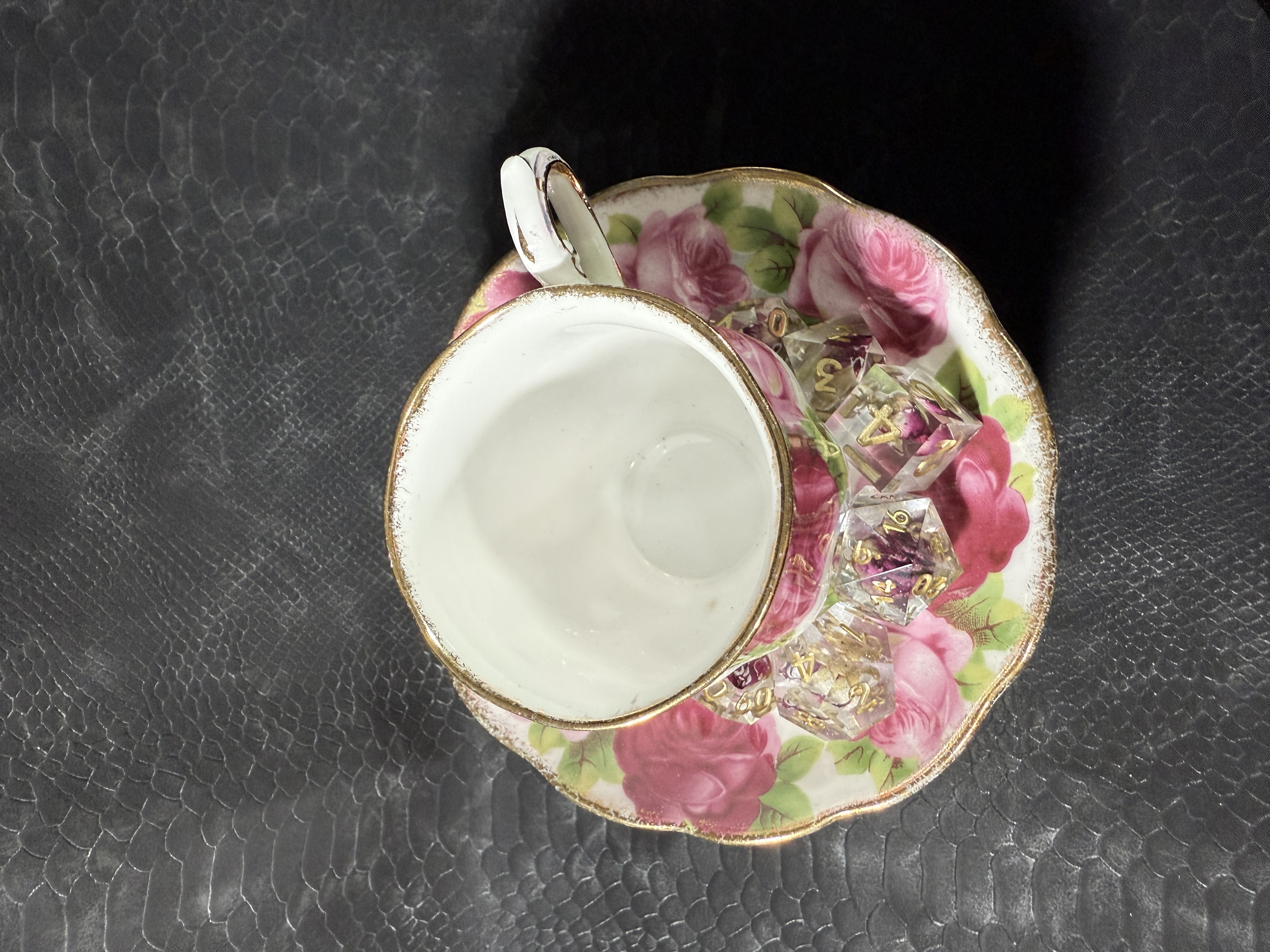 The Spill the Tea Tea Cup set includes a rose-painted porcelain teacup, rose bud sharp edge dice set, and a magic item card (also accessible on D&D Beyond). Each piece is designed to bring elegance, mystery, and a touch of mischievous magic to your tabletop adventures.