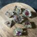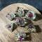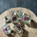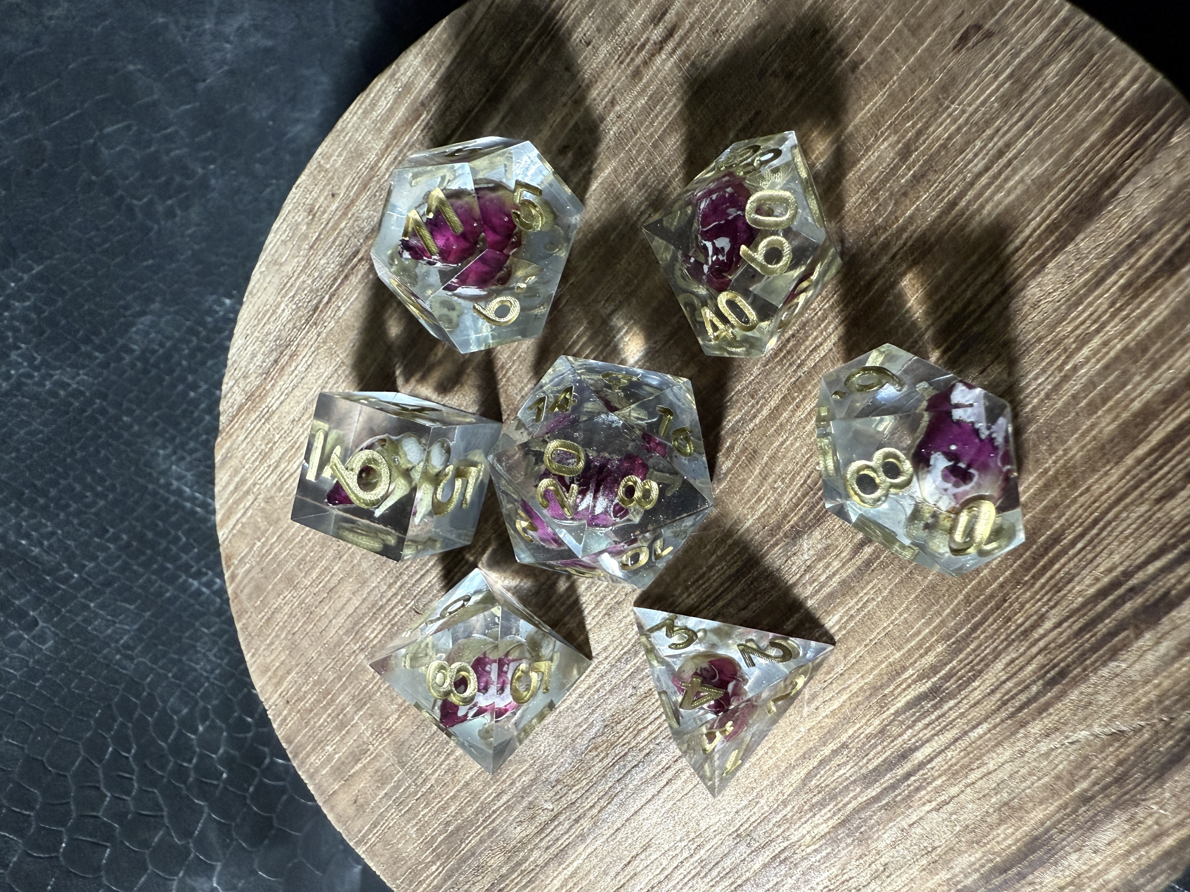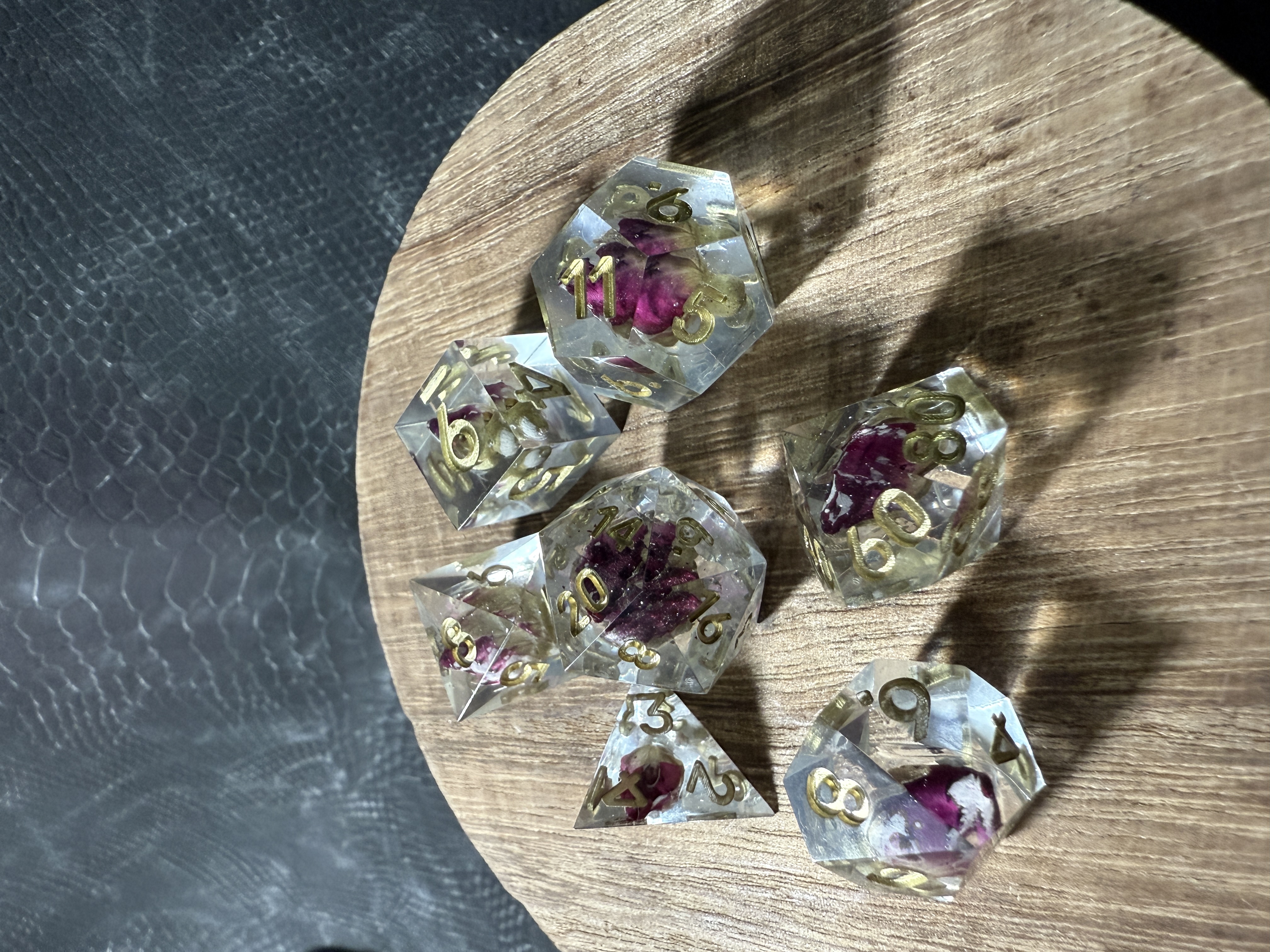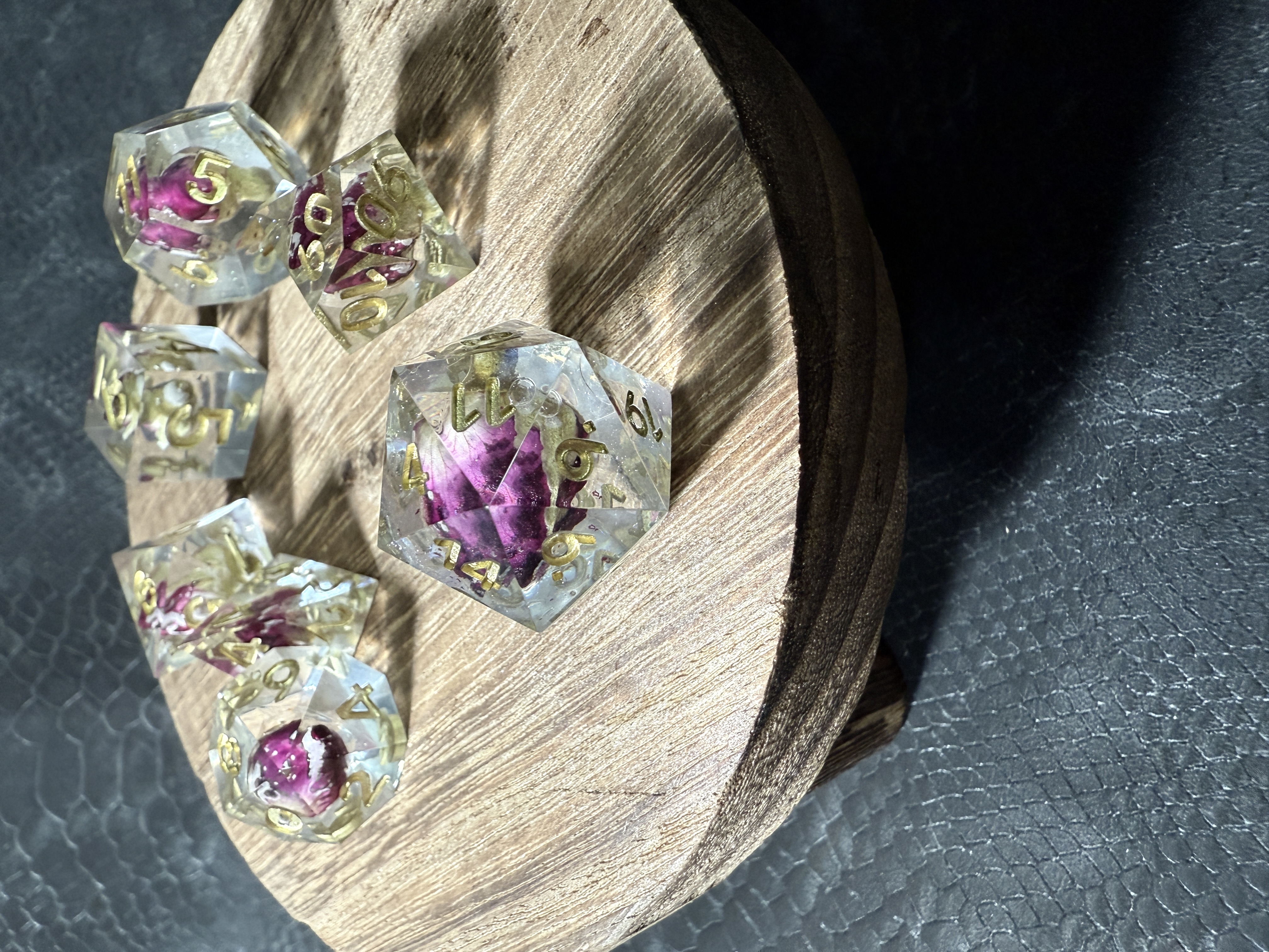 All of my dice are crafted from resin. I hand-pour the resin and add various alcohol inks and mica powders to create beautiful effects. My shell-type dice may include inclusions such as paper butterflies, moss, flowers, etc., and some have the inner shell wrapped in Washi tape. These dice are made using a double casting method (which requires two separate rounds in a pressure pot for 24 hours each): first, the inner dice are cast and a pattern or inclusion is applied, then a second casting of clear resin is done around the insert. The dice are then placed in a pressure pot for 24 hours to remove any bubbles. After curing for a few days, I sand off the excess resin. The dice are then polished in a tumbler with a polishing compound to give them a shine. They are cleaned with soap and water, and then prepared for inking. I hand ink each die, usually in a complementary color, using acrylic inks. Finally, they are polished by hand one last time.