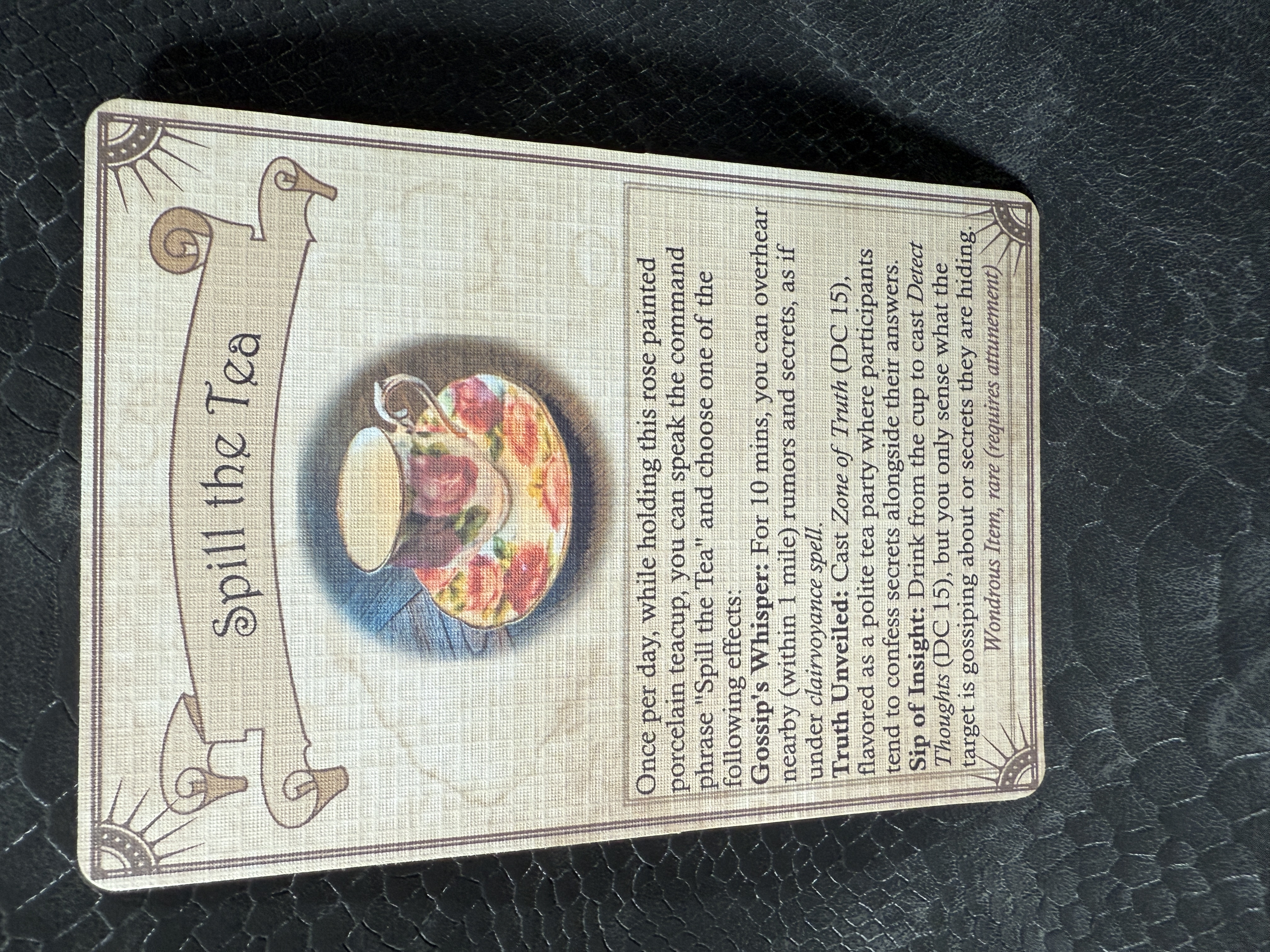 • Sip of Insight: As a bonus action, drink from the cup to cast Detect Thoughts (DC 15), but you can only sense what the target is gossiping about or hiding.