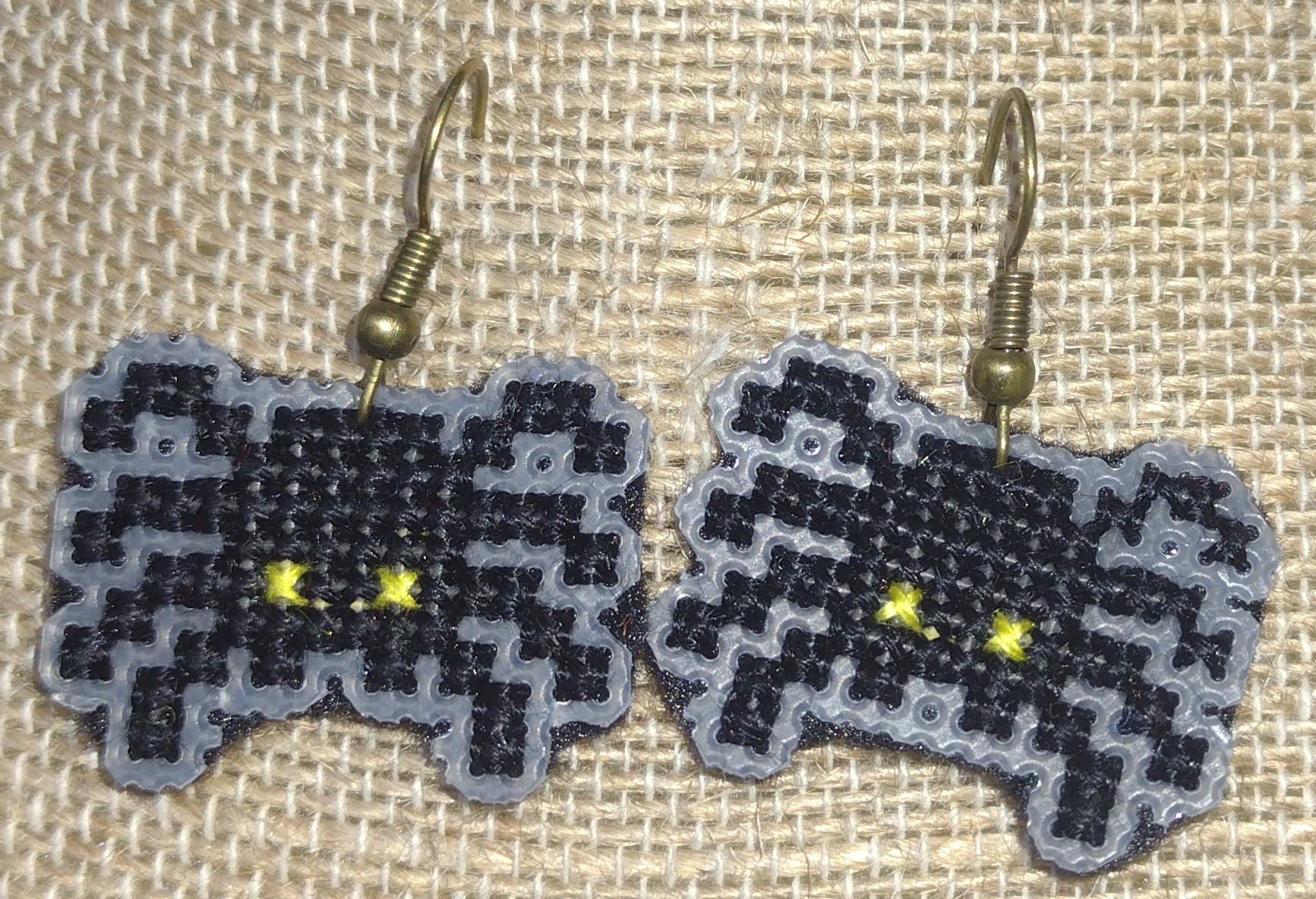 Do you have arachnophobia? These earrings are of a stylized black spiders with yellow eyes. They are hand-stitched on plastic canvas, so they are very light weight. The backing is black felt.