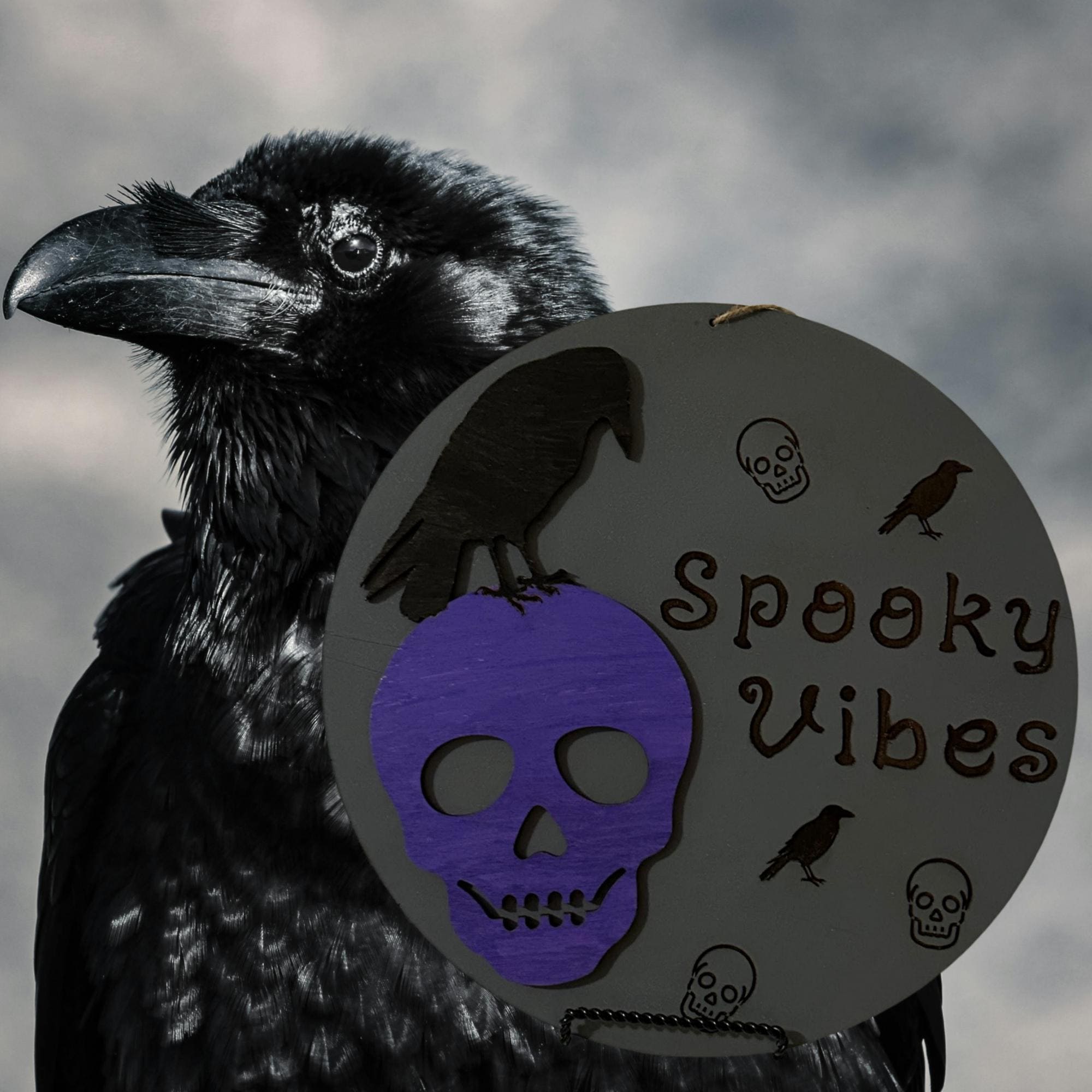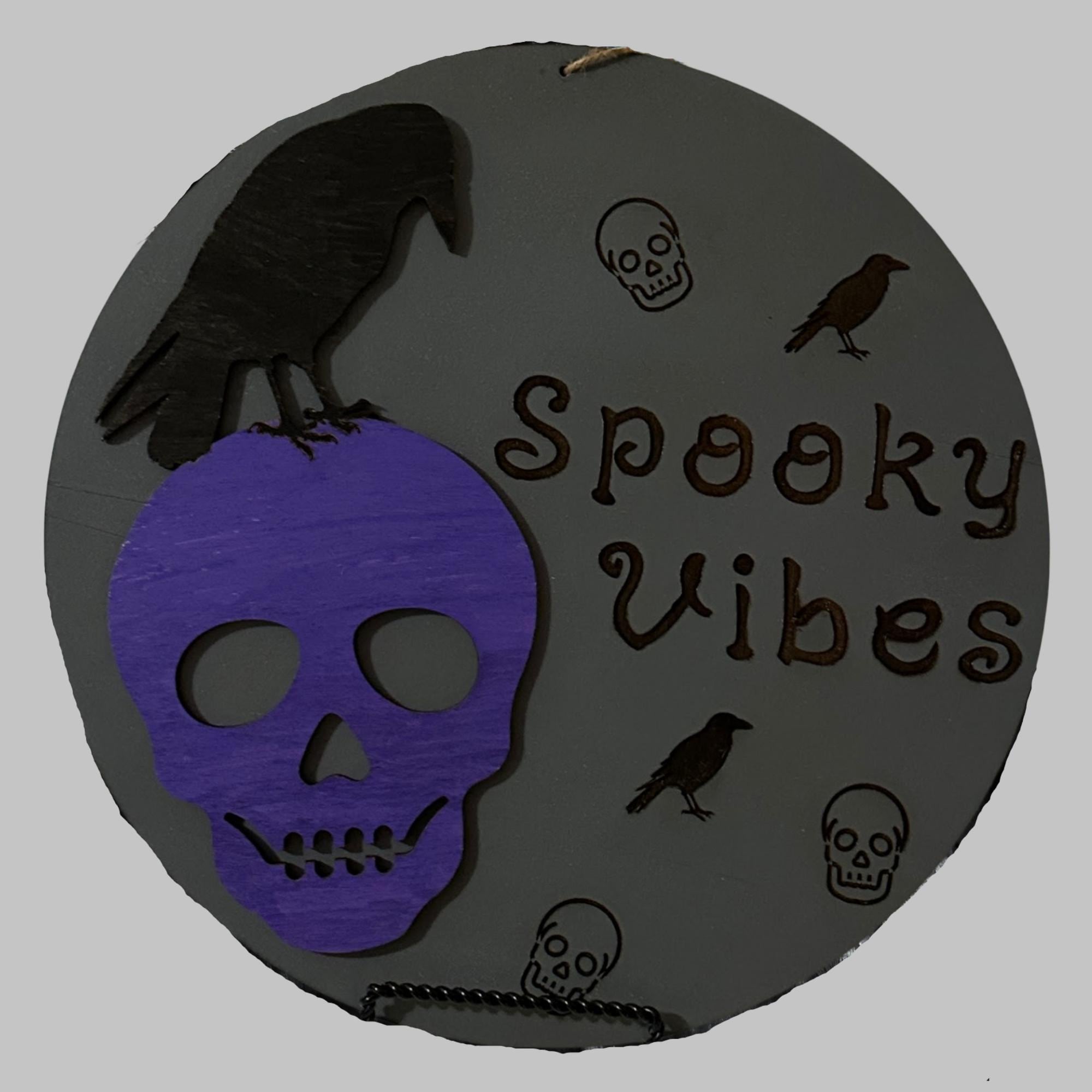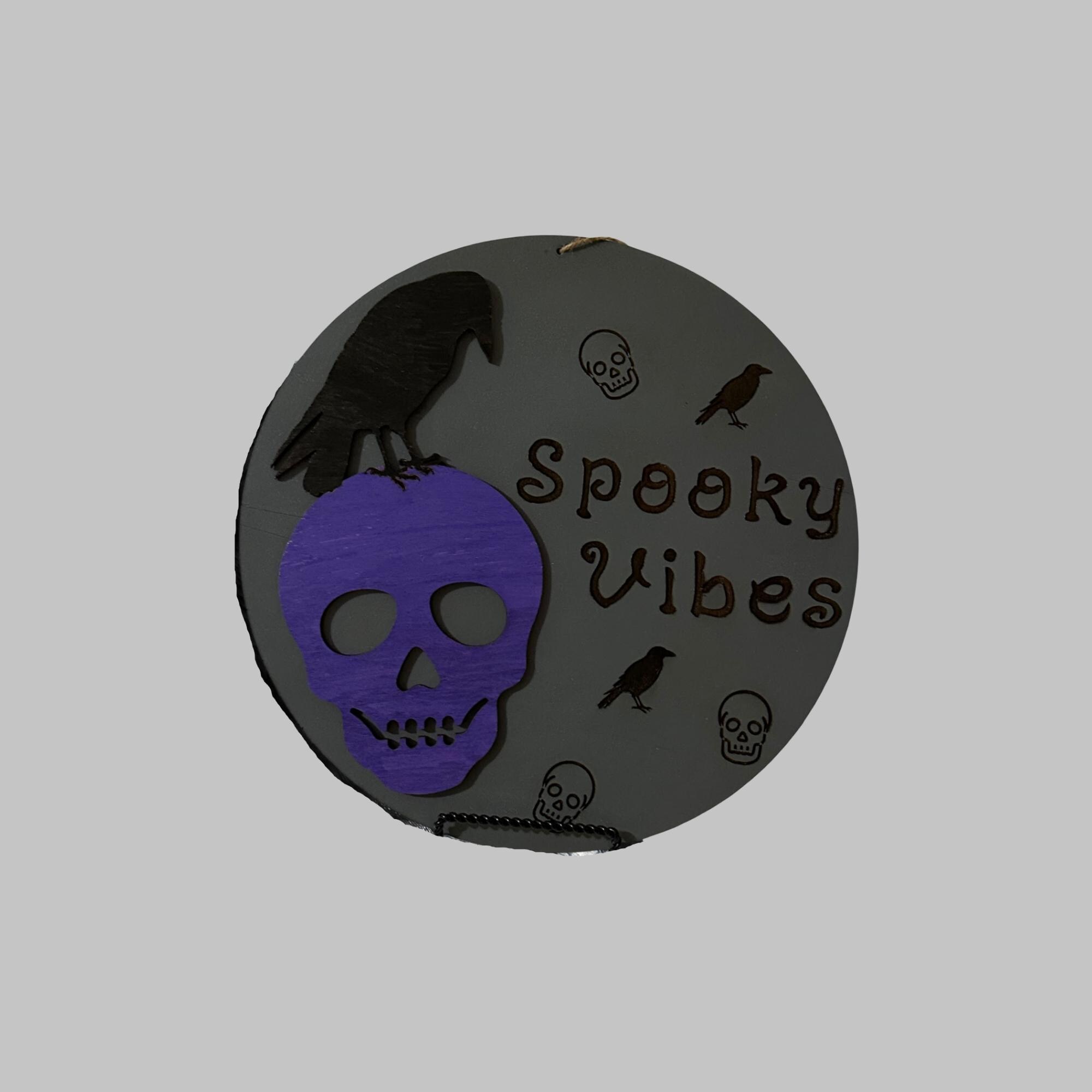 This is a handmade and hand painted gray wood Halloween door sign. It says, "Spooky Vibes" engraved in the sign along with crows and skulls. The skull and crow are a separate piece of wood that's painted and glued on. It does have one hole for hanging with twine (included). The back is painted as well. It is sealed with clear coat on both sides. It is 12x12 inches in size.