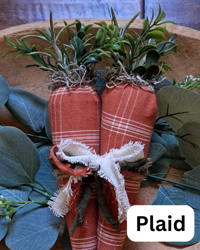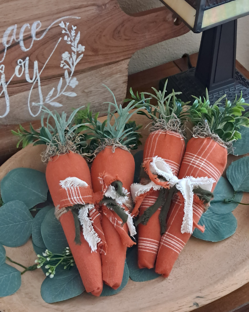Add a touch of spring charm to your home with this handcrafted carrot bundle, a sweet seasonal accent perfect for dough bowls, baskets, tiered trays, shelves, or tabletop displays. The bundle includes two decorative carrots made from wrapped styrofoam forms in warm burnt orange fabric and finished with assorted greenery for the foliage, creating a soft, nature-inspired look.