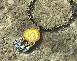 Materials: lampwork glass beads with a fun orange flower design, fluorite crystal chip beads, silver tone wire, silver tone chain, silver tone earring wires
