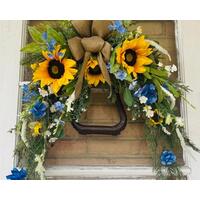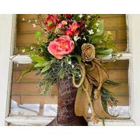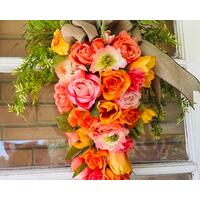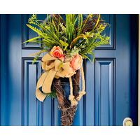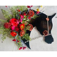 Artistic wooden horse head door hanger adorned with beautiful artificial and wood flowers. The flowers are painted with glitter paint and the horse has a raised floral pattern in the wood for added interest. Various shades of green, teal and fuchsia make this both a work of art and an all season wreath.