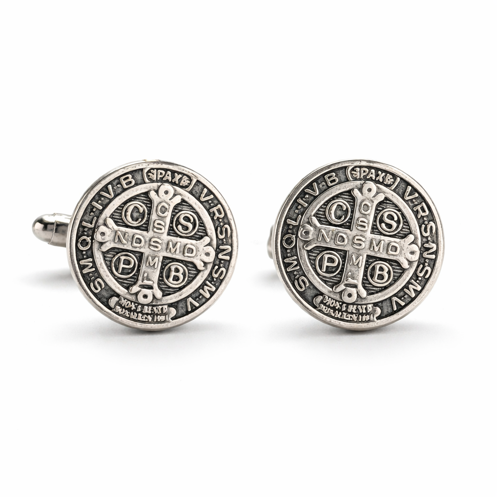 The St. Benedict Medal has been treasured for centuries as a powerful symbol of faith and protection. These cufflinks faithfully showcase the traditional cross and surrounding inscriptions, carefully detailed in an antique silver finish that gives them a classic and masculine character.