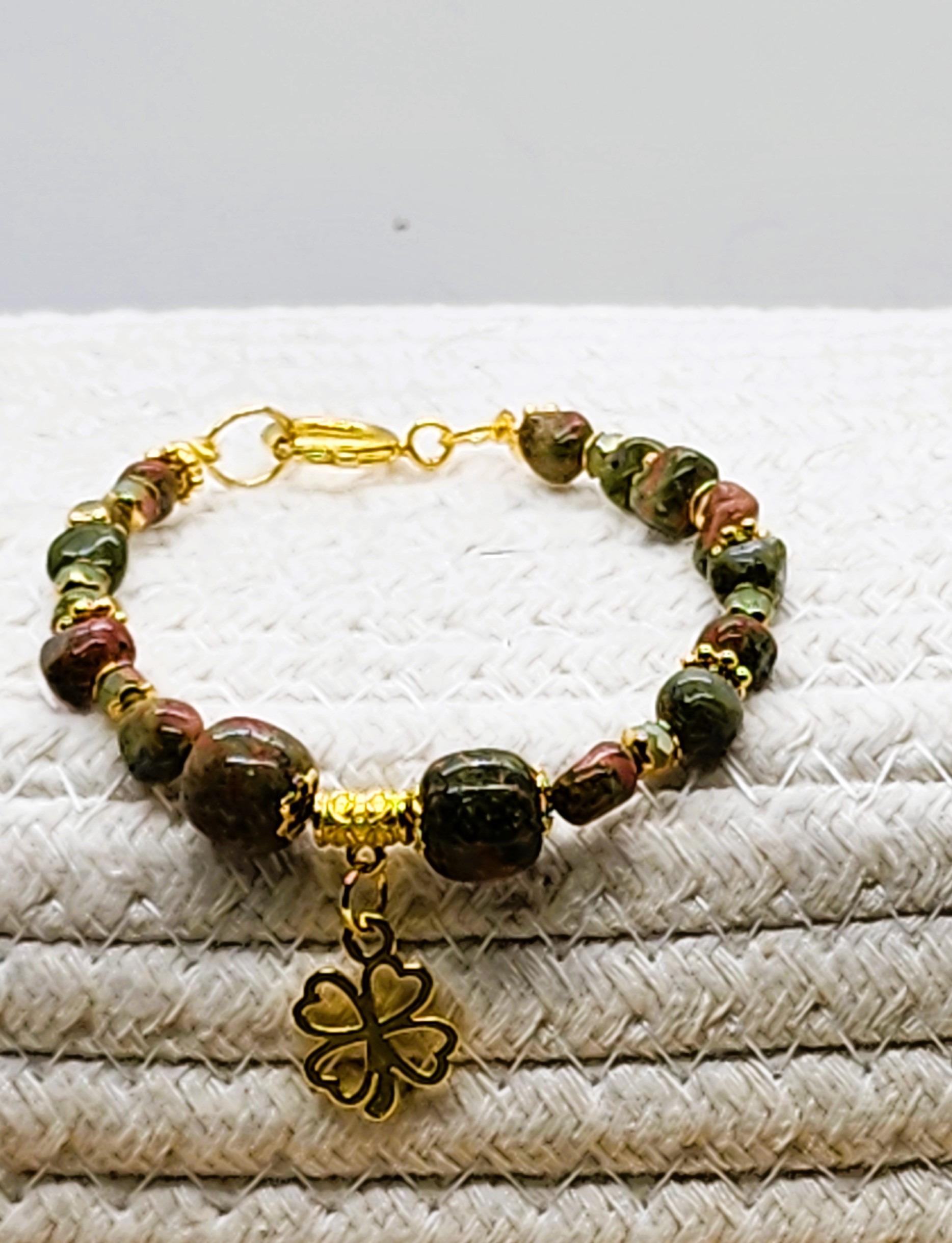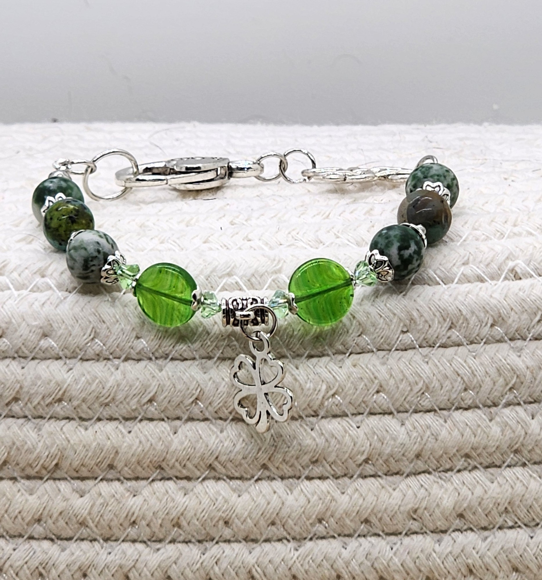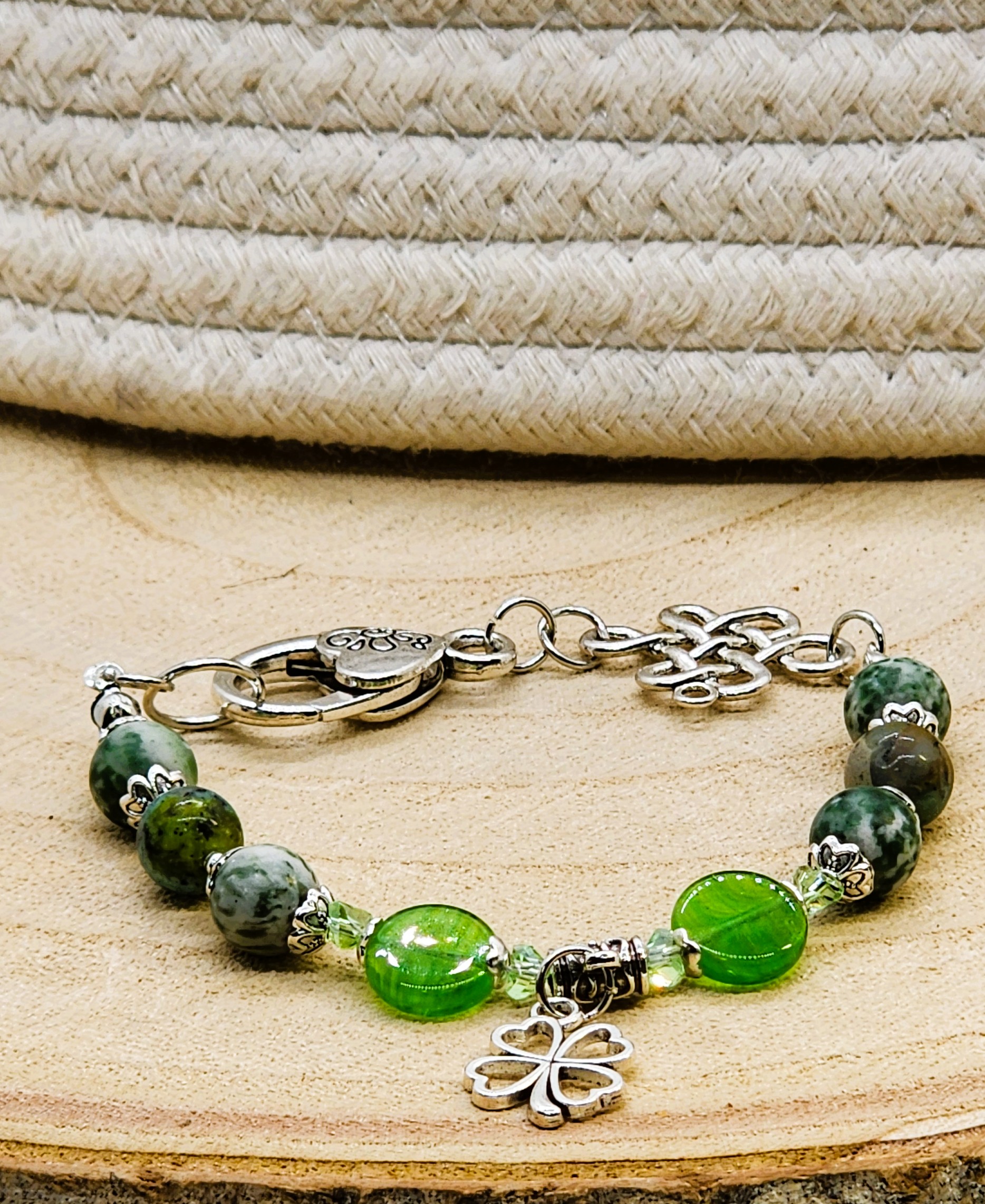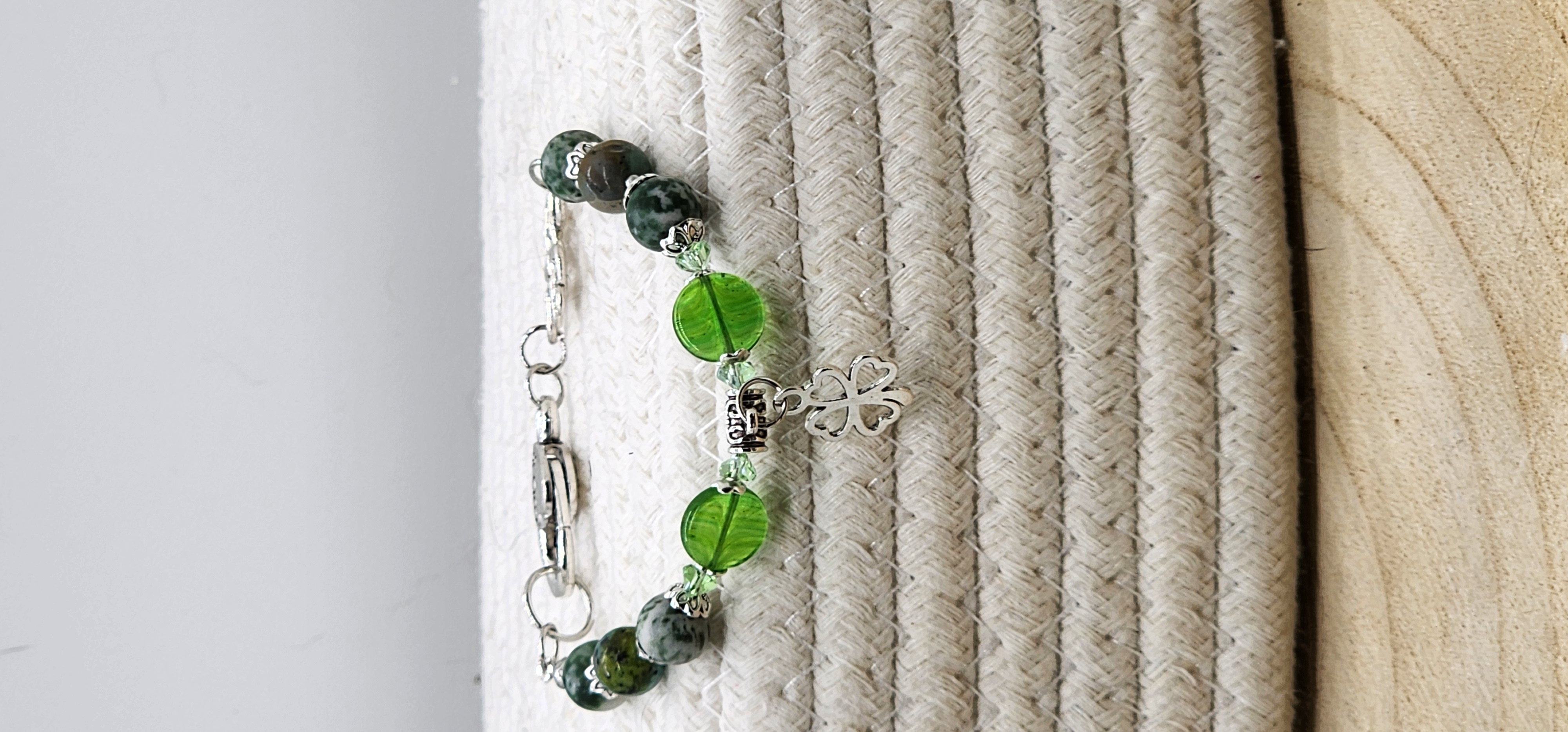 Elevate your St. Patrick's Day style with these stunning green gemstone beaded bracelet! Handmade with gold or silver tone accents and a charming shamrock charm, this bracelet is the perfect way to add a touch of luck to any outfit. Gold version is made with Unakite gemstones and gold color spring clasp and the silver version is made with tree Agate gemstone beads, a Celtic knot link and an oversized lobster clasp closure. A must-have accessory for the holiday or any day you want to feel extra festive! ideal for someone who enjoys the serenity and healing properties of gemstones. Handcrafted using nylon coated jewelry wire and lobster claw closures to stay securely on your wrist.