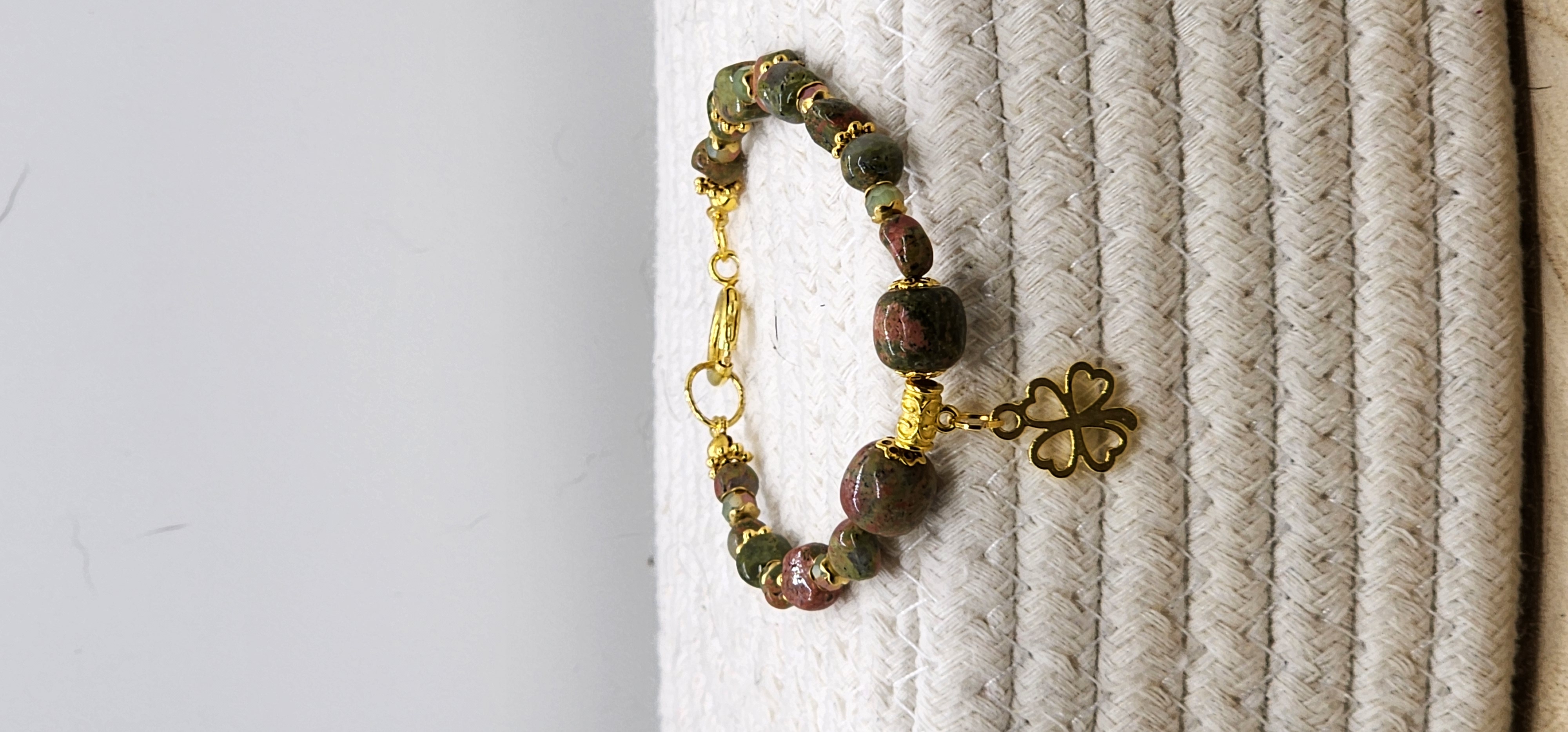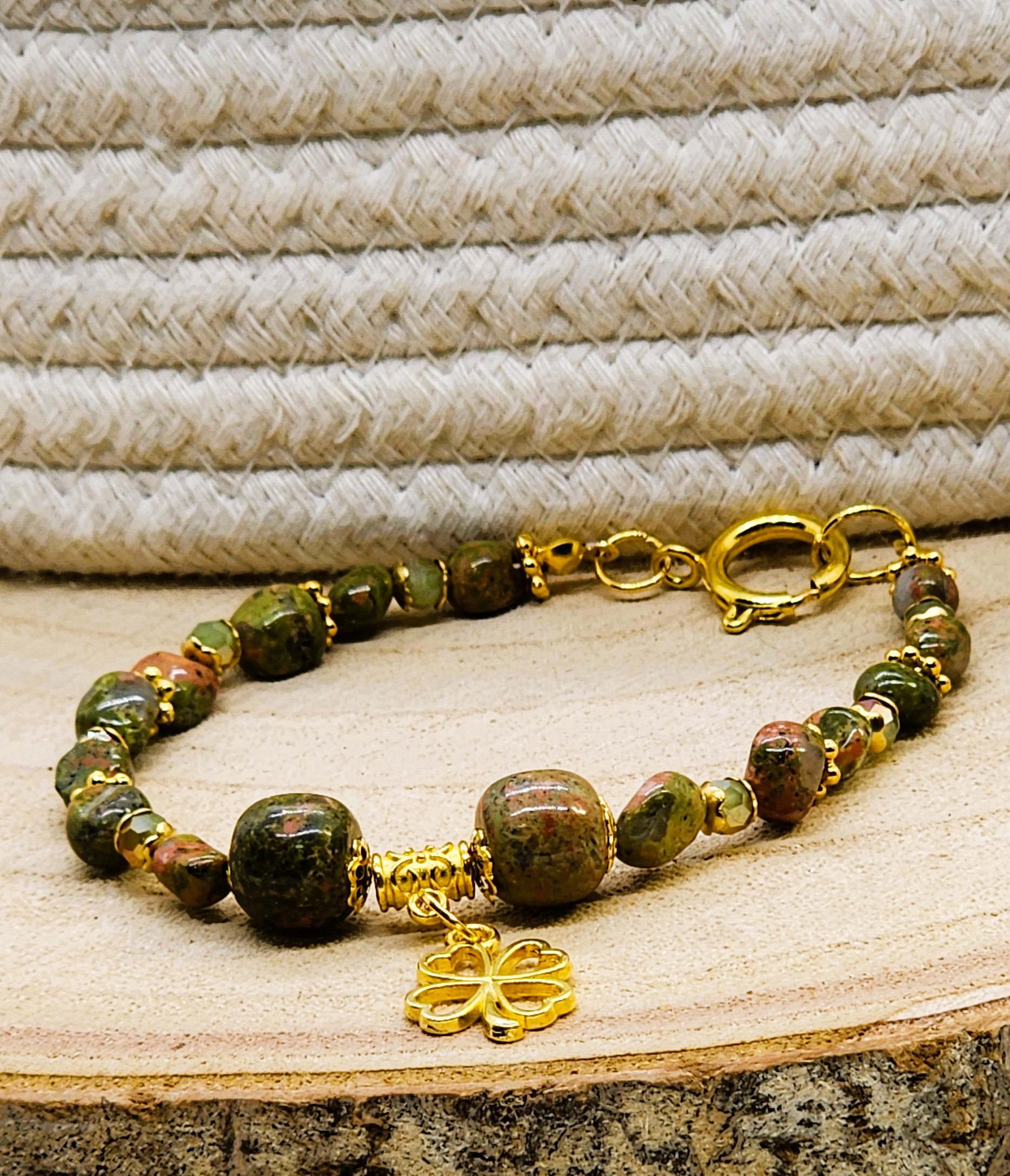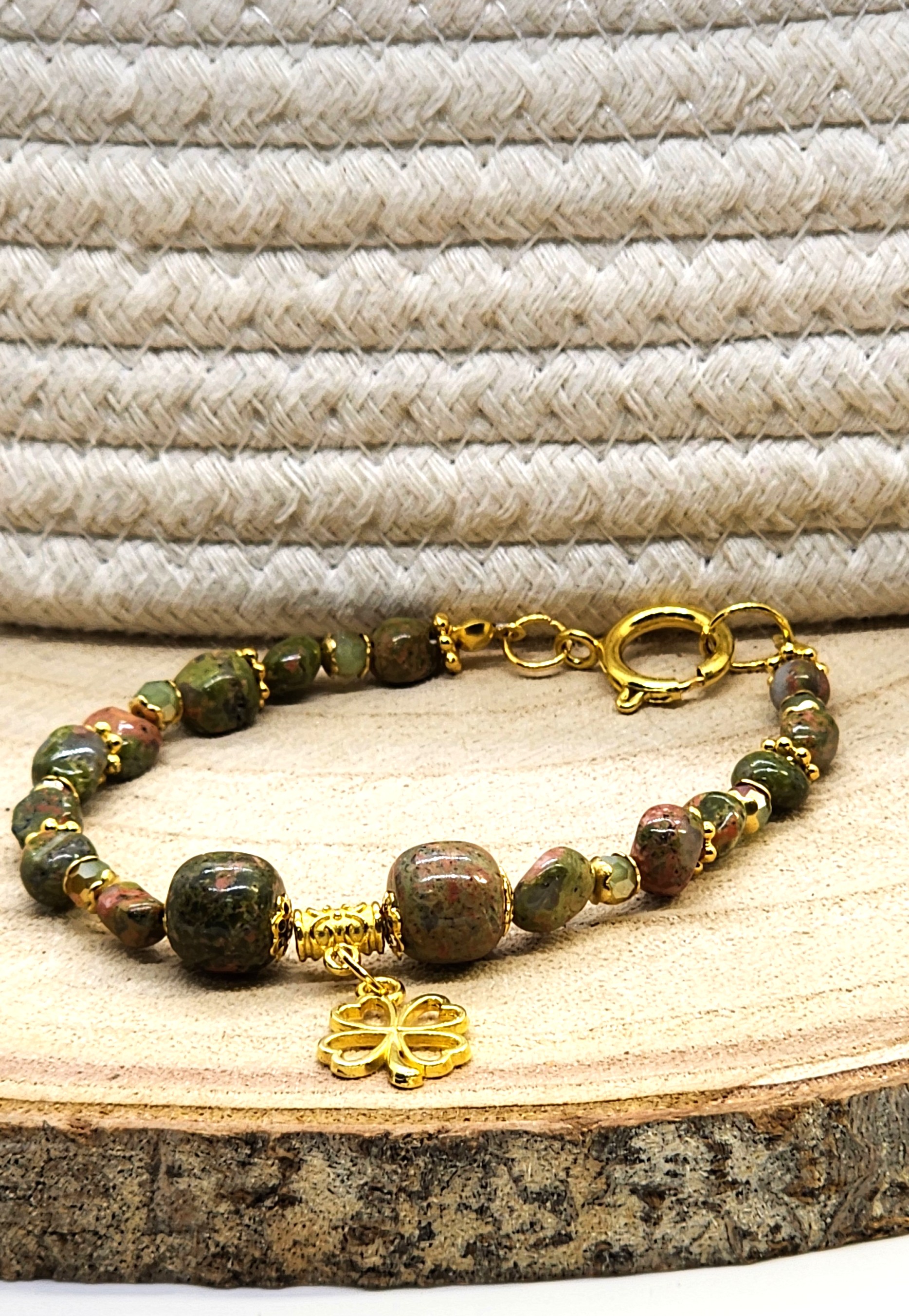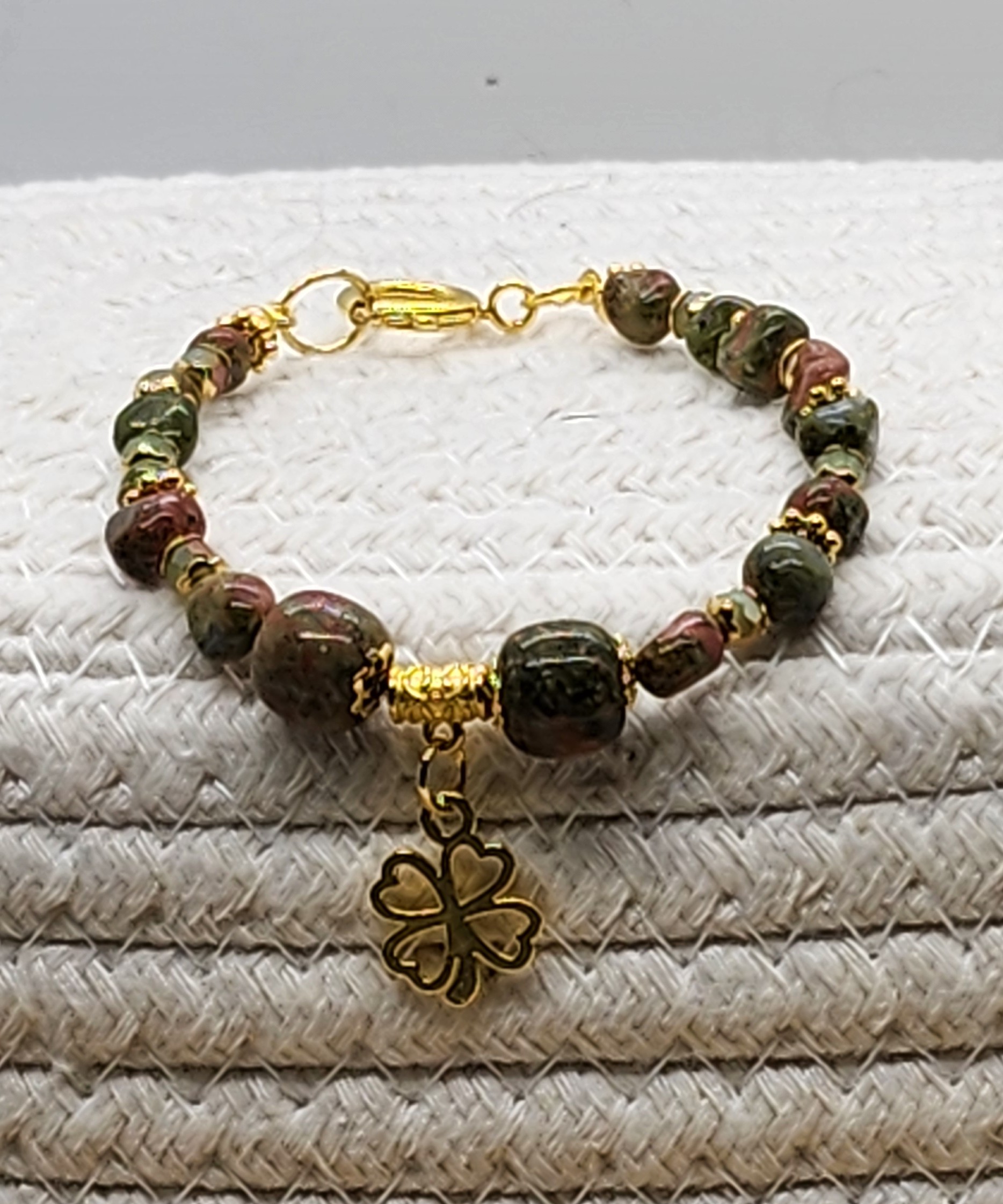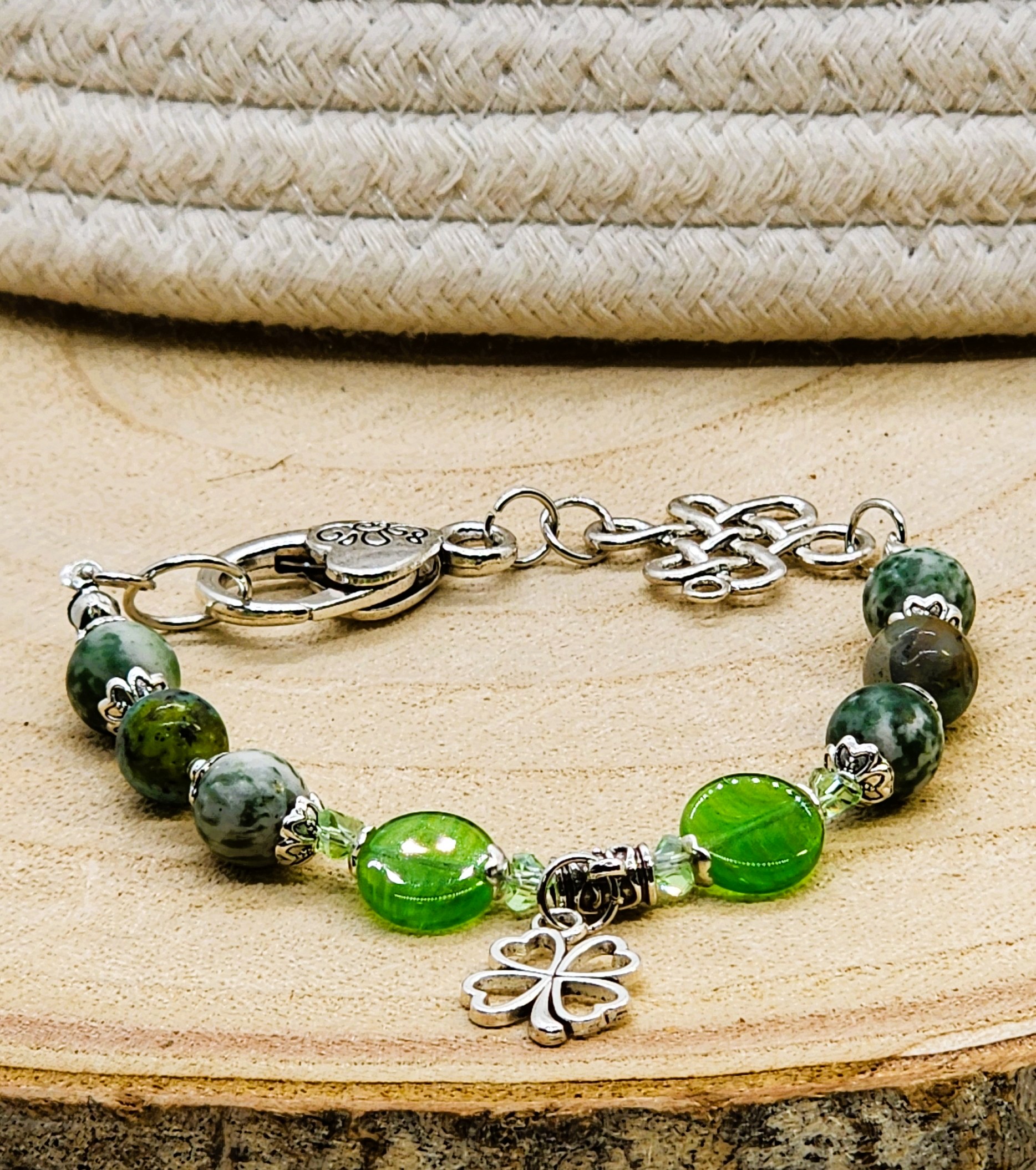 Elevate your St. Patrick's Day style with these stunning green gemstone beaded bracelet! Handmade with gold or silver tone accents and a charming shamrock charm, this bracelet is the perfect way to add a touch of luck to any outfit. Gold version is made with Unakite gemstones and gold color spring clasp and the silver version is made with tree Agate gemstone beads, a Celtic knot link and an oversized lobster clasp closure. A must-have accessory for the holiday or any day you want to feel extra festive! ideal for someone who enjoys the serenity and healing properties of gemstones. Handcrafted using nylon coated jewelry wire and lobster claw closures to stay securely on your wrist.